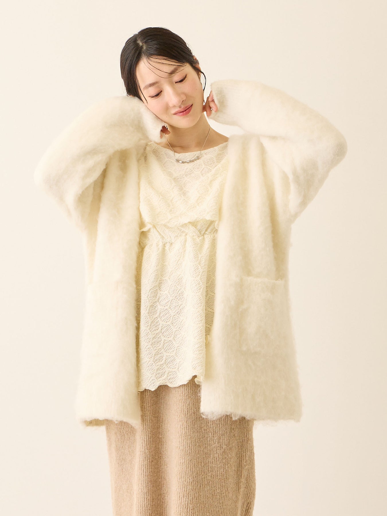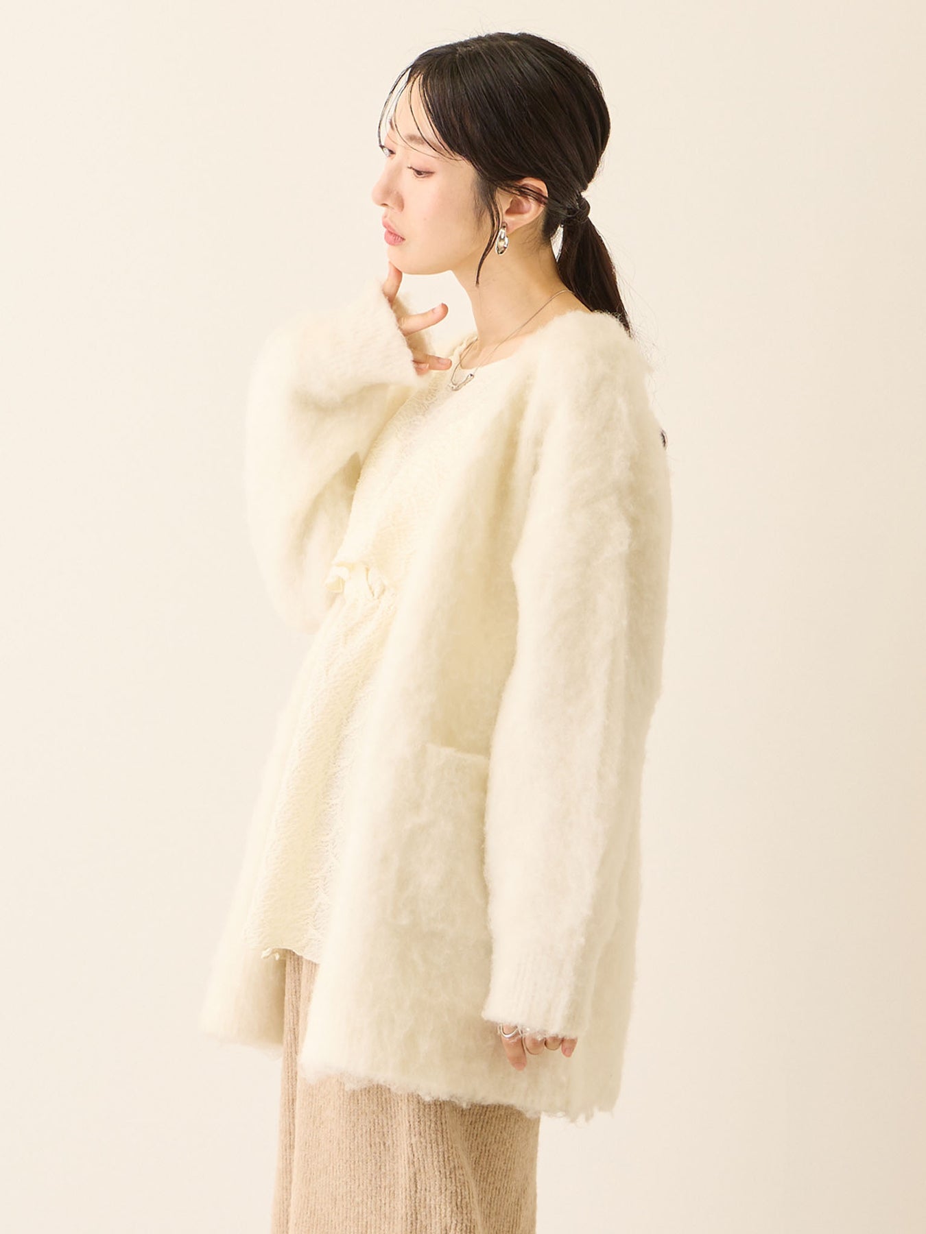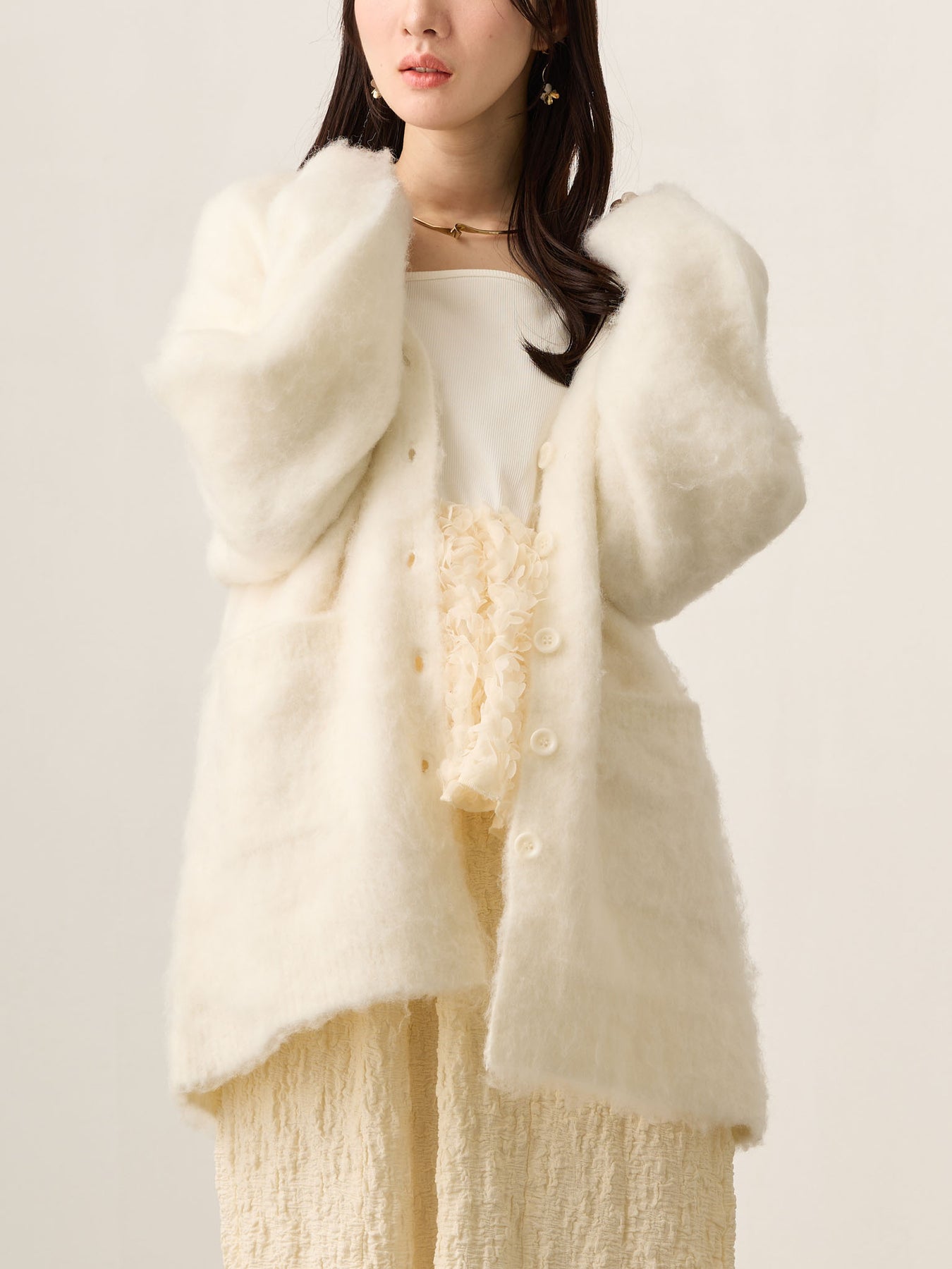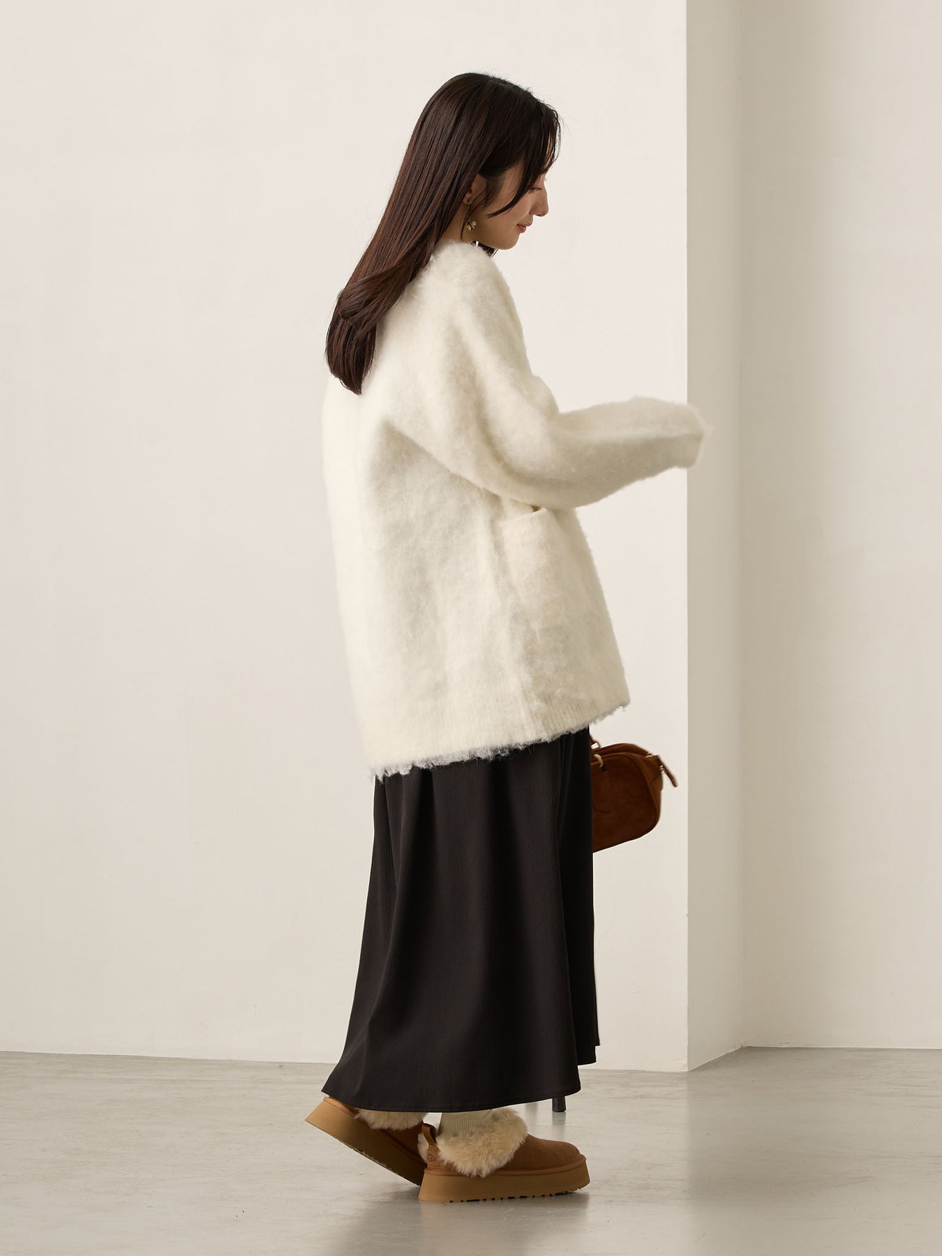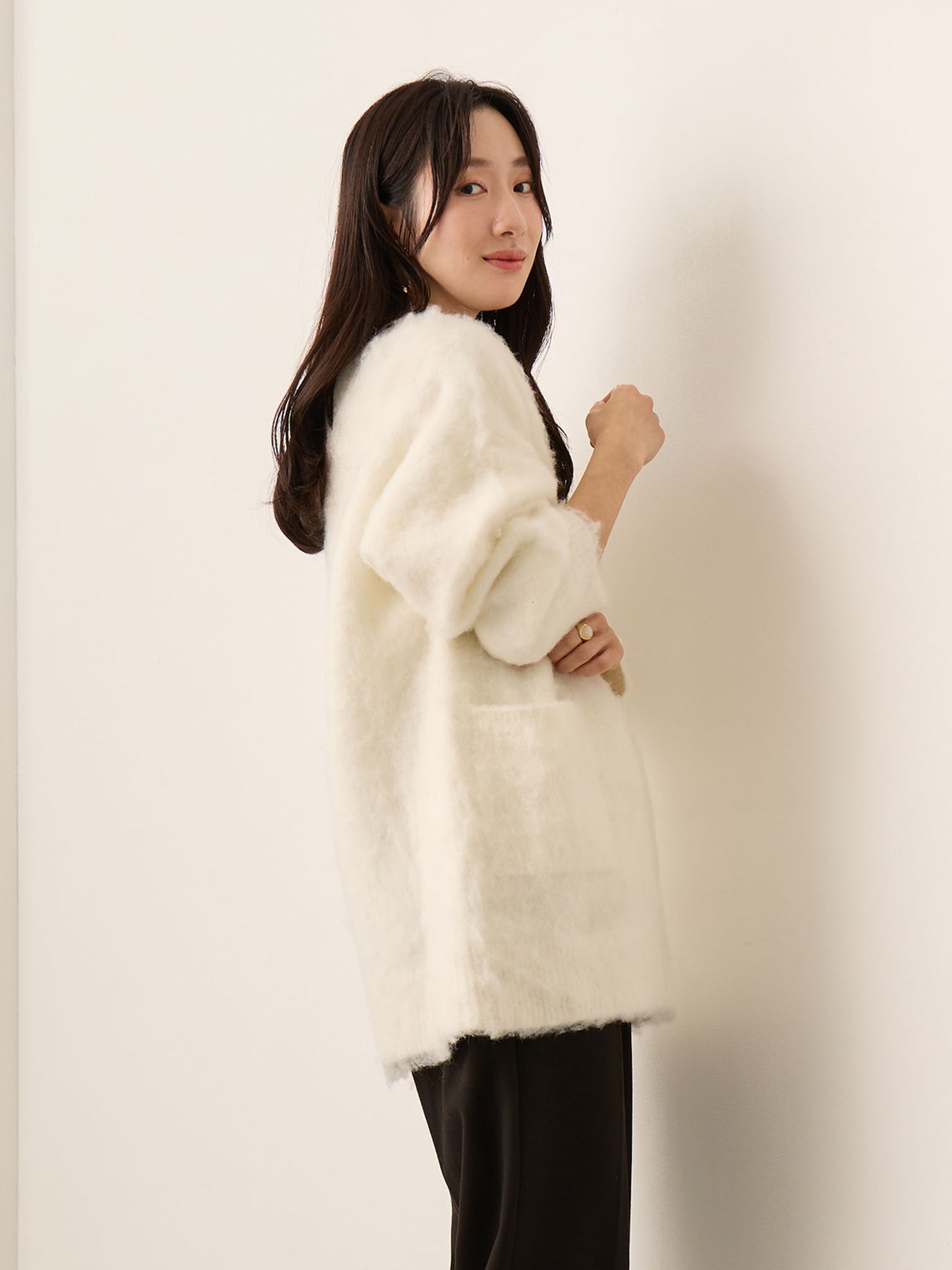 ゆったりとしたサイズ感とふわふわ素材が女性らしいカーディガン。