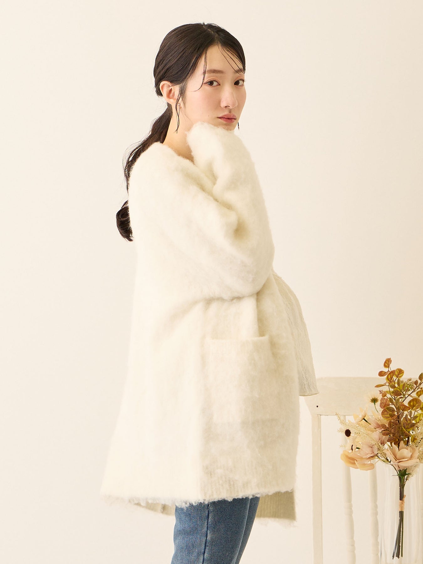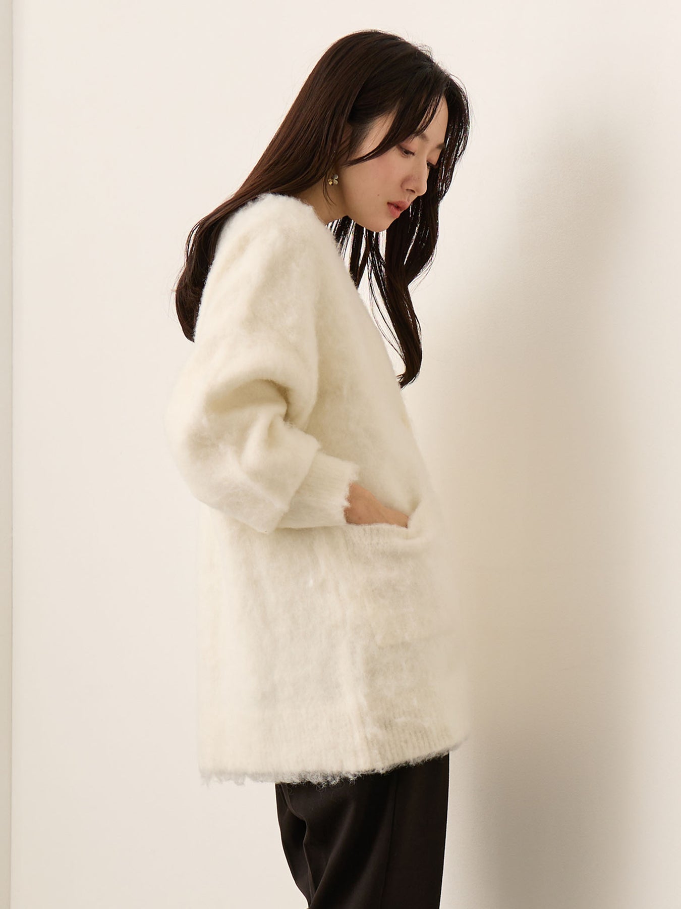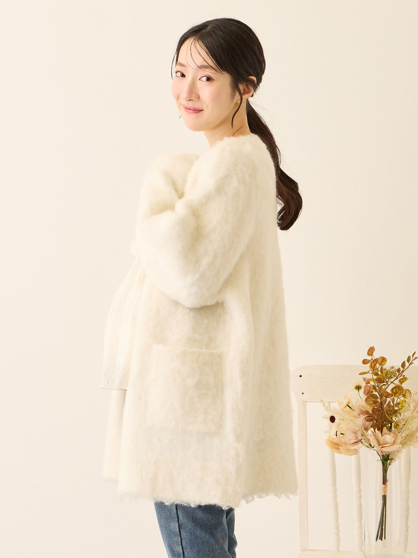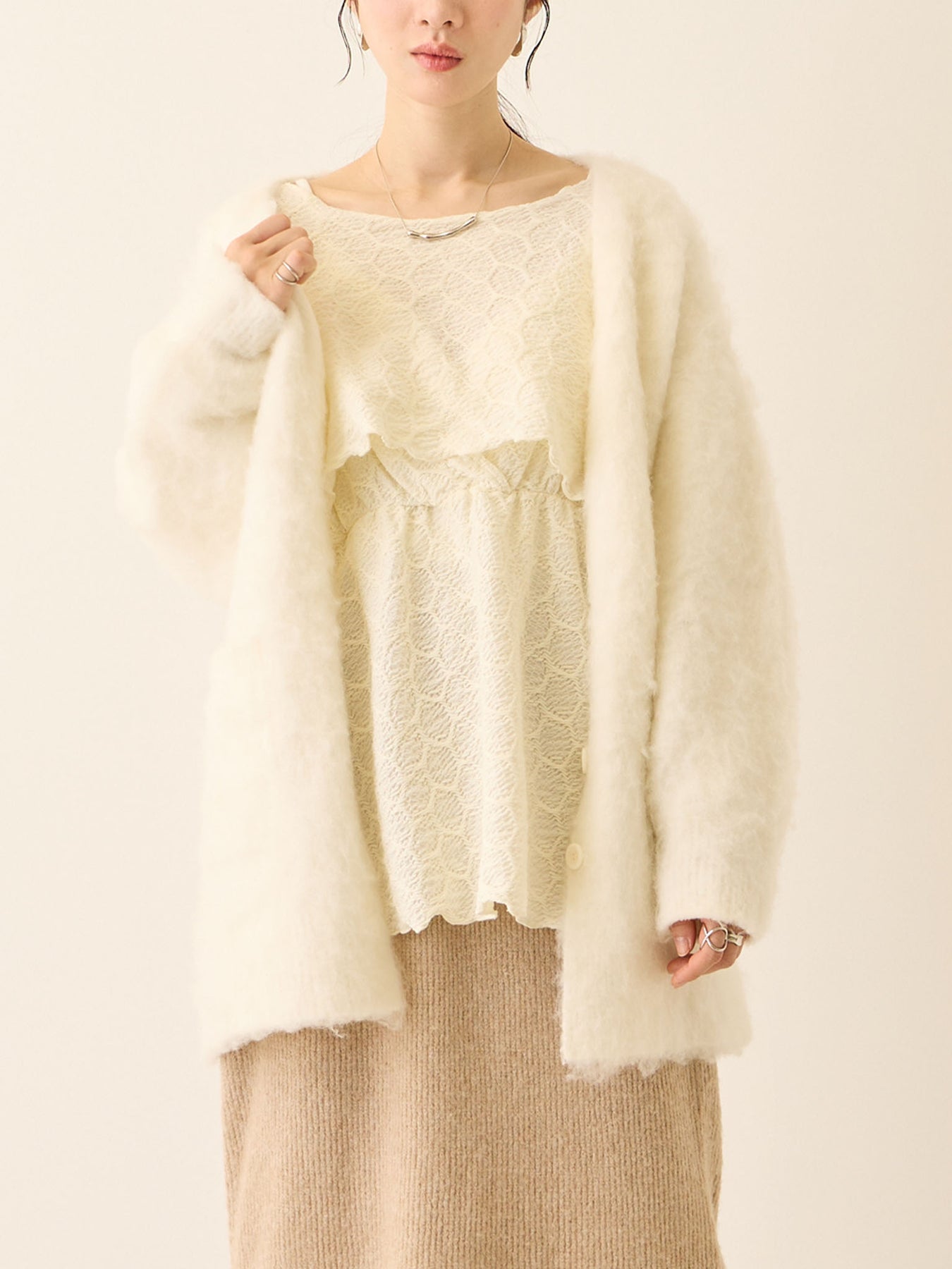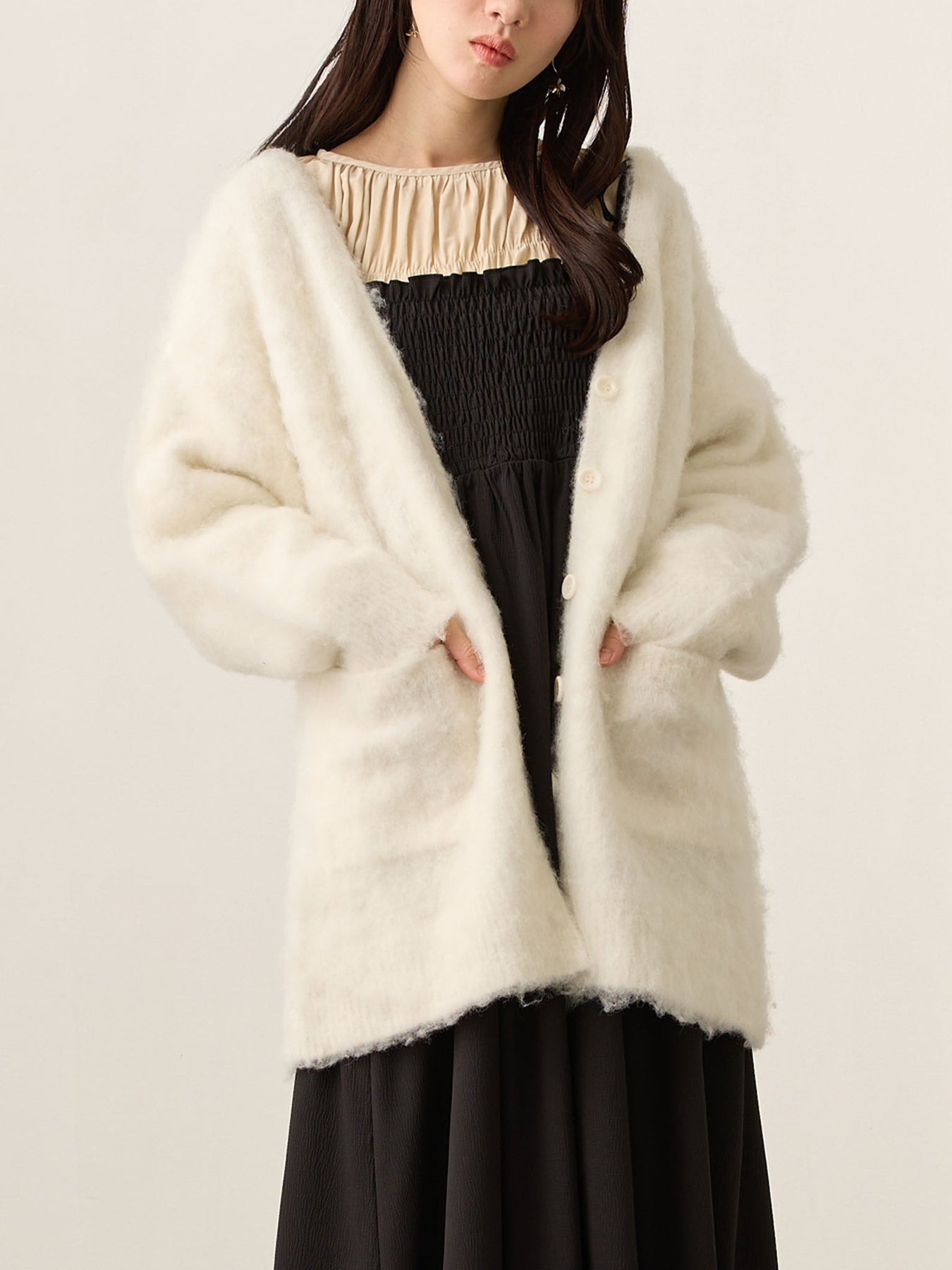 ゆったりとしたサイズ感とふわふわ素材が女性らしいカーディガン。