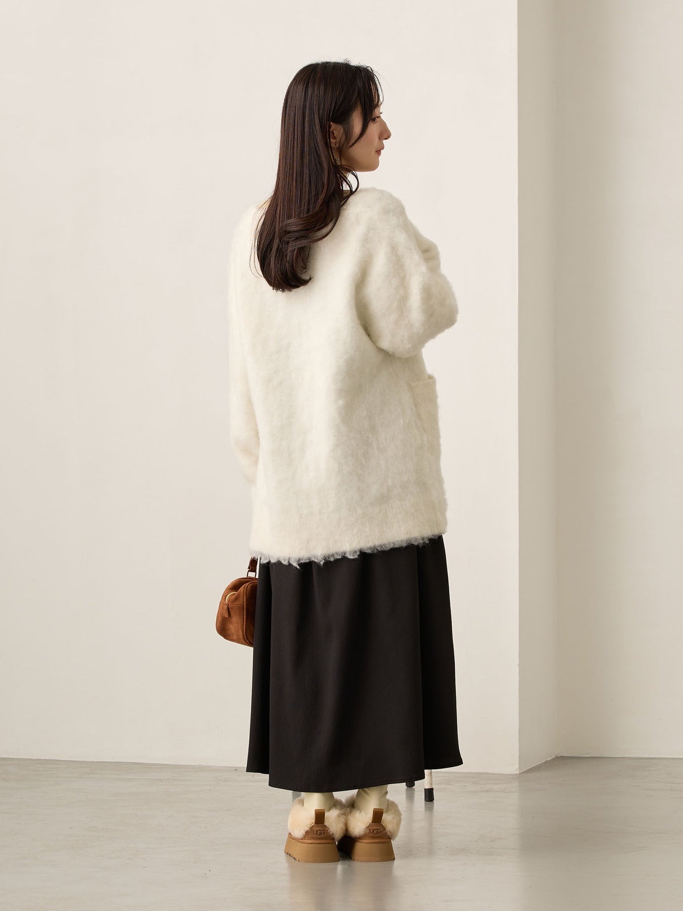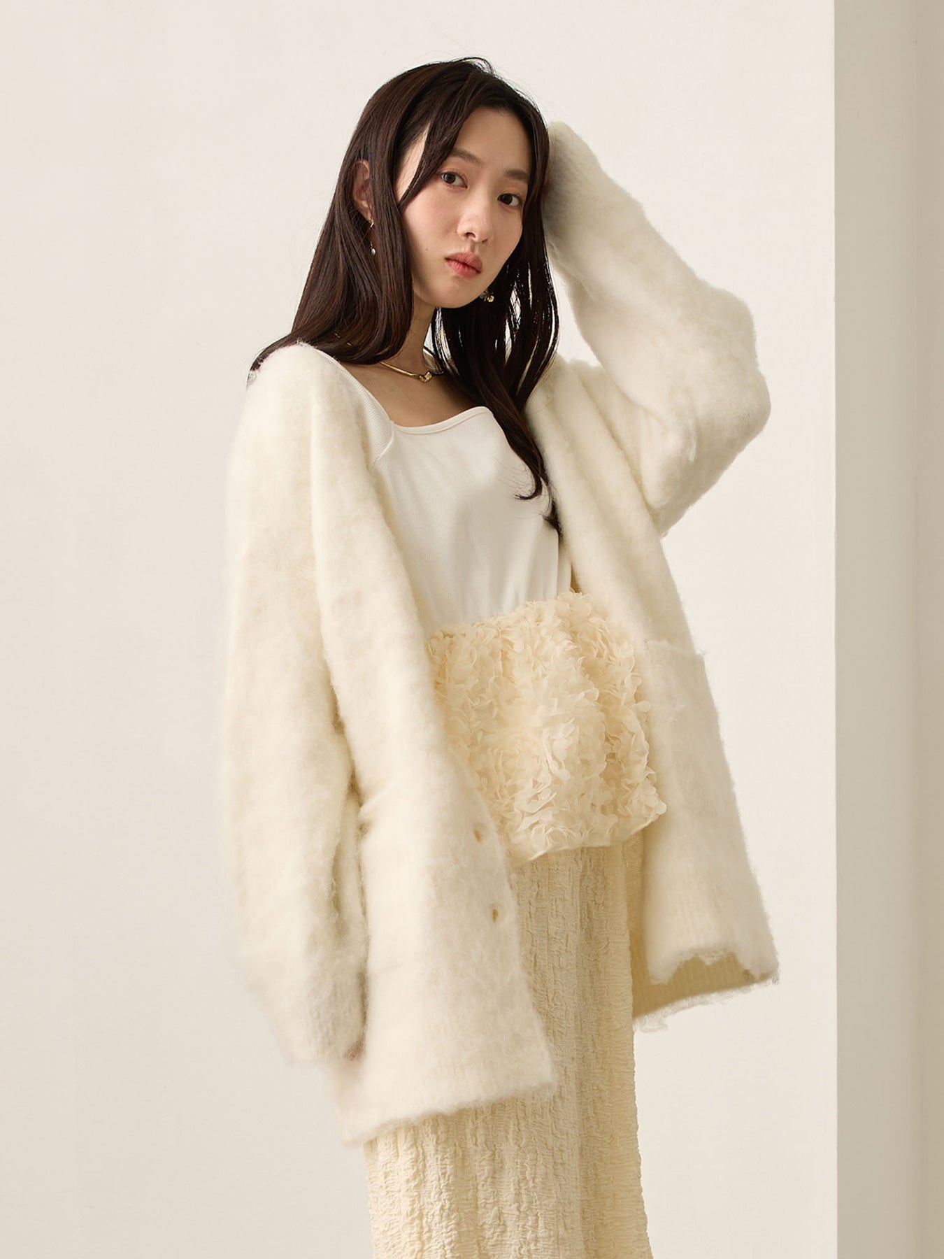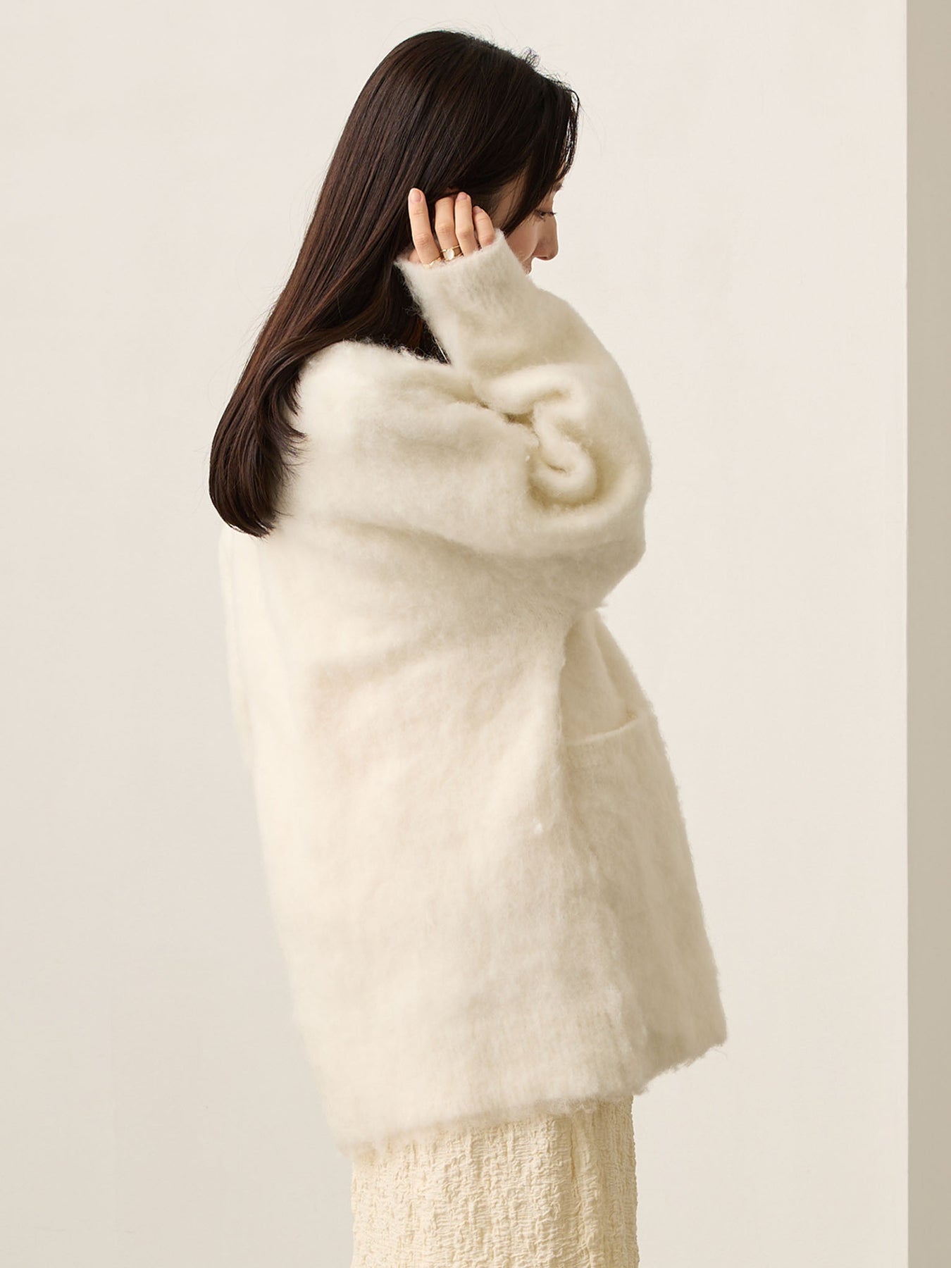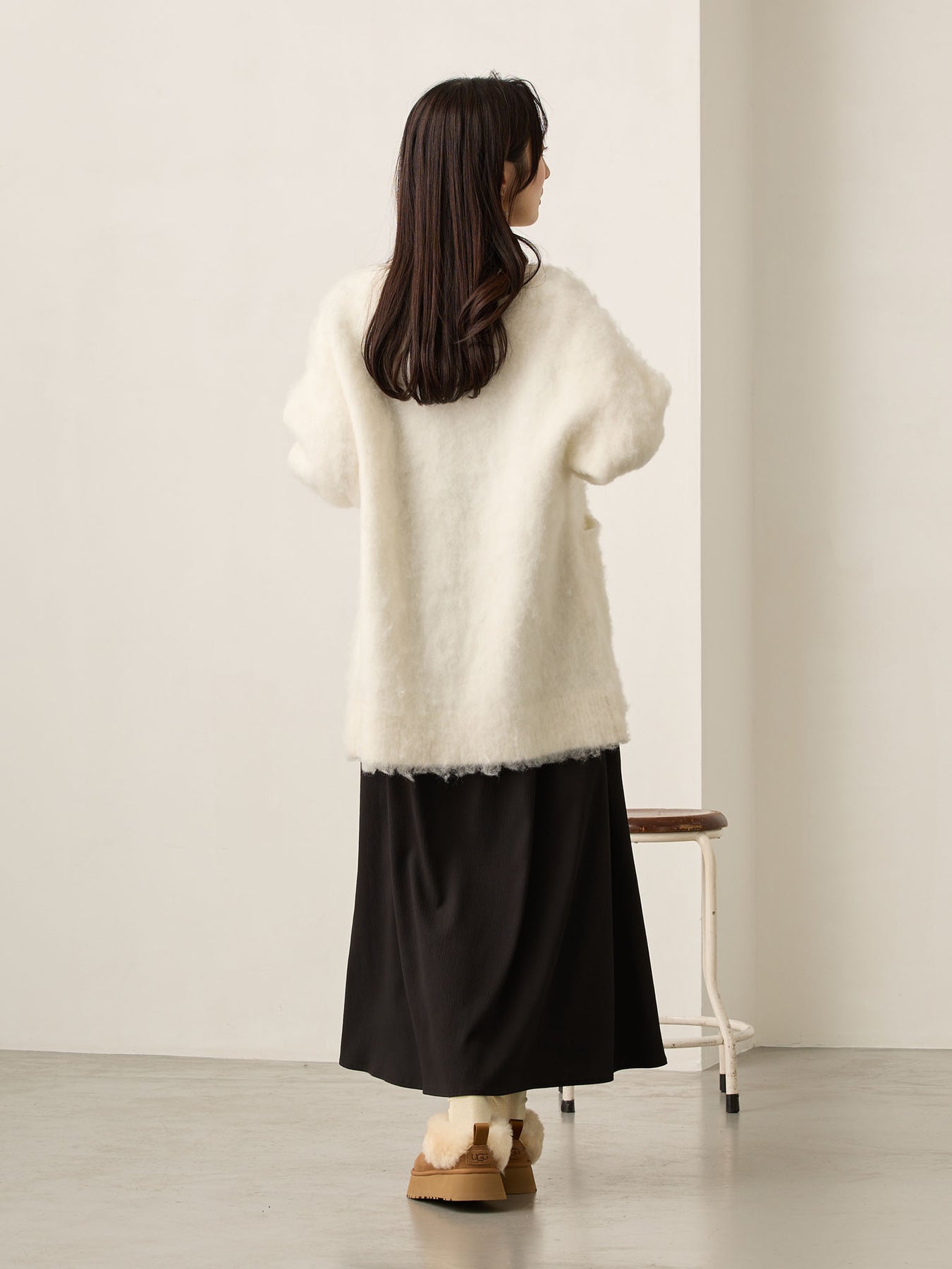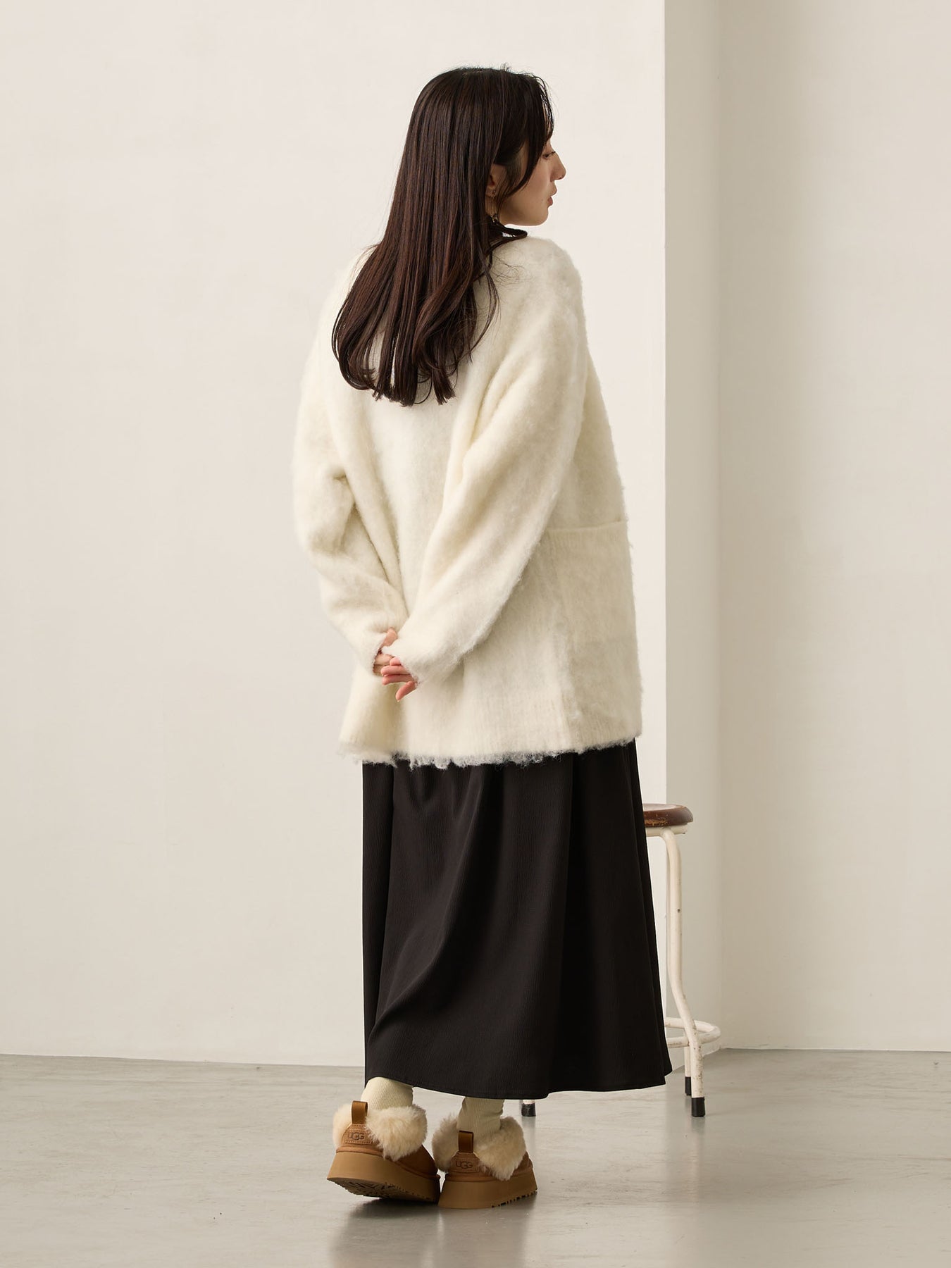 ゆったりとしたサイズ感とふわふわ素材が女性らしいカーディガン。