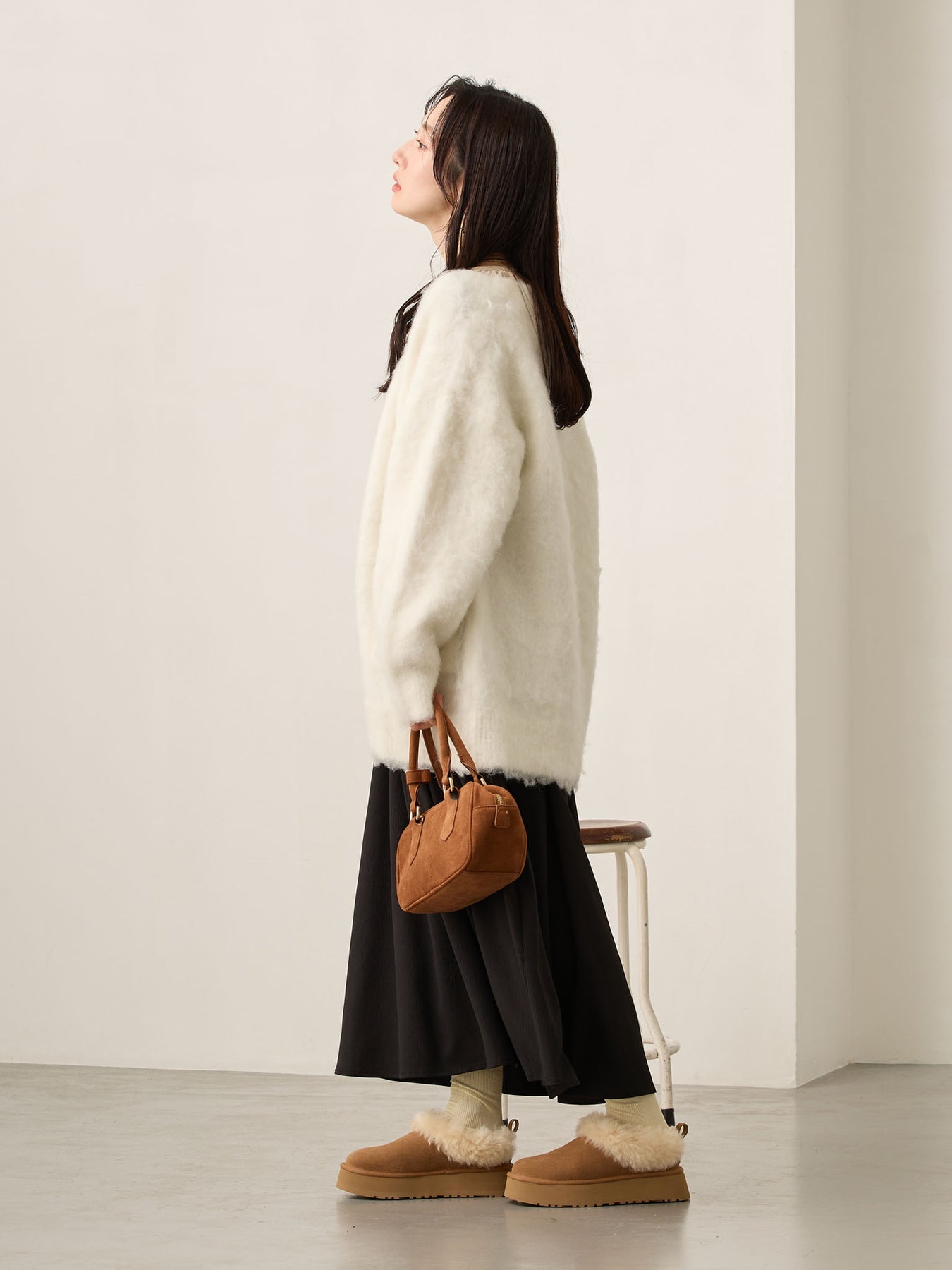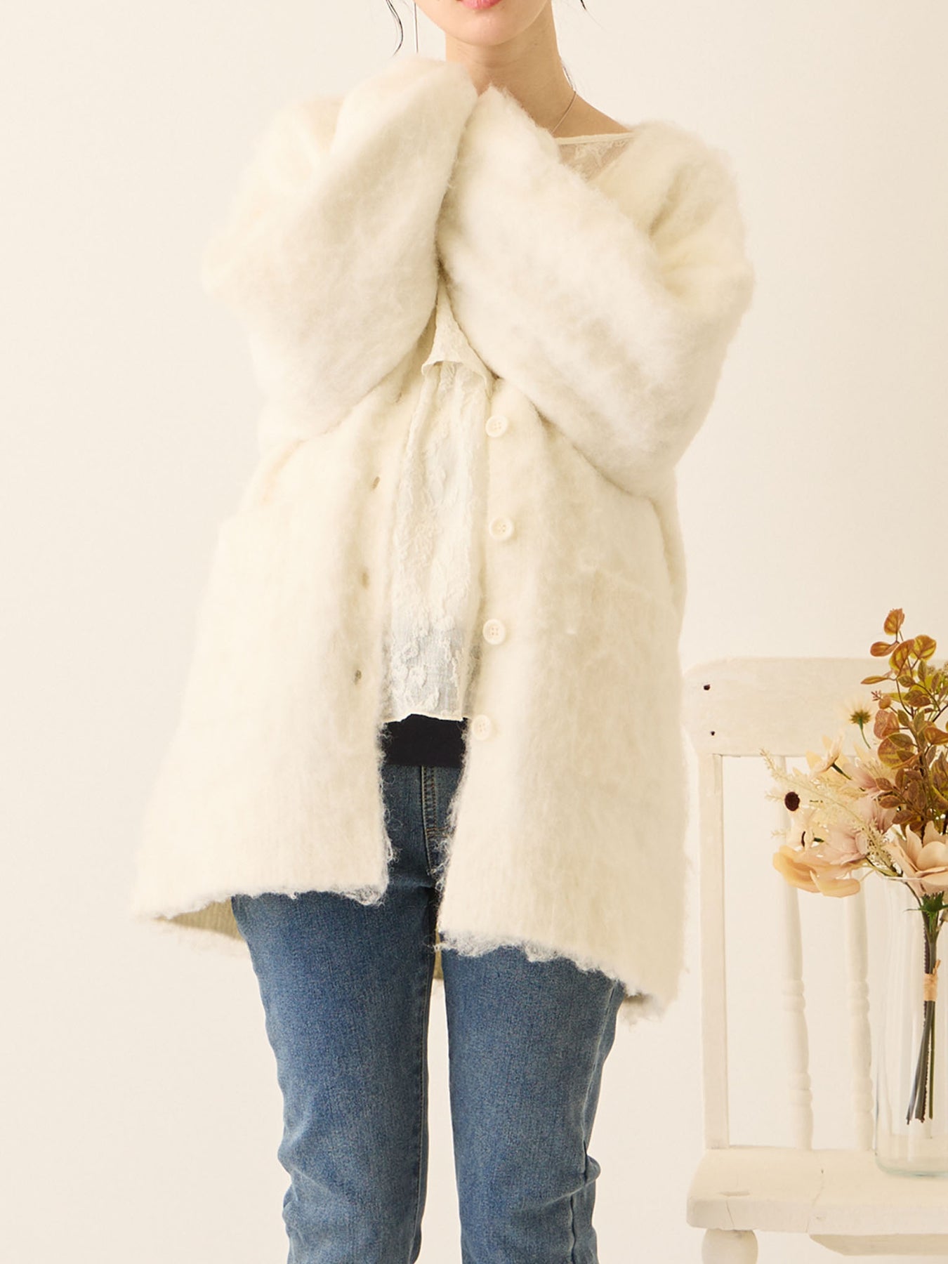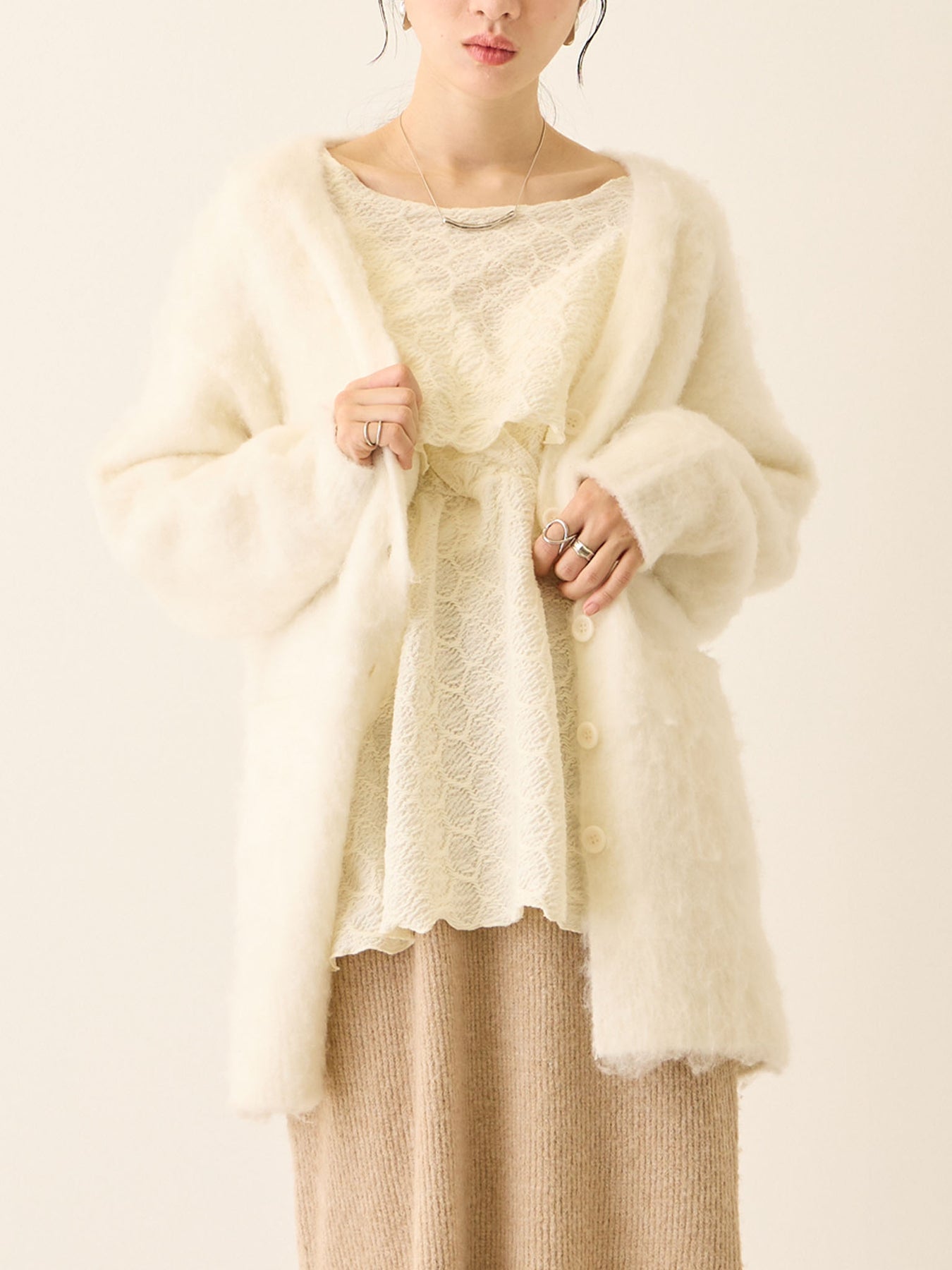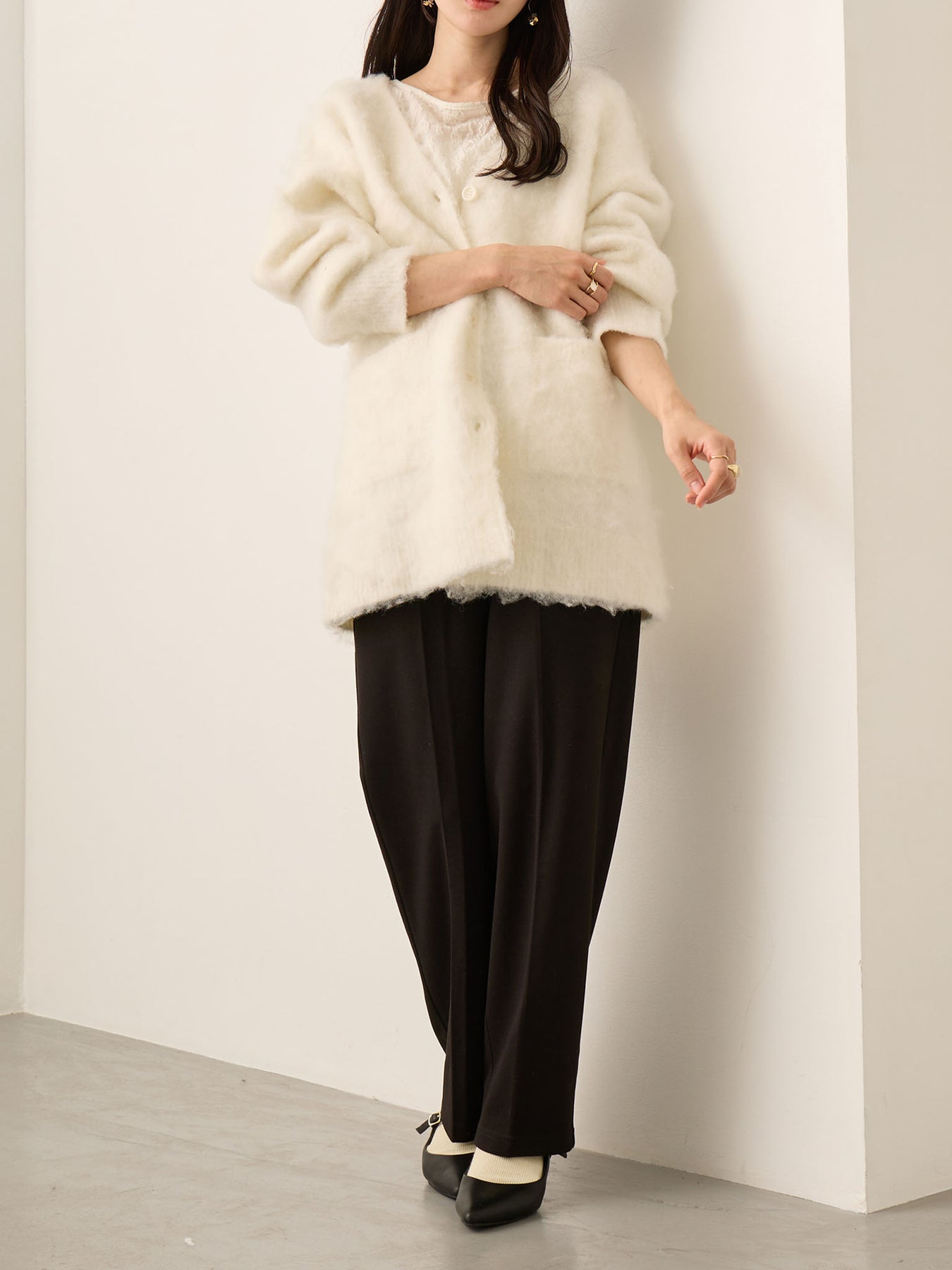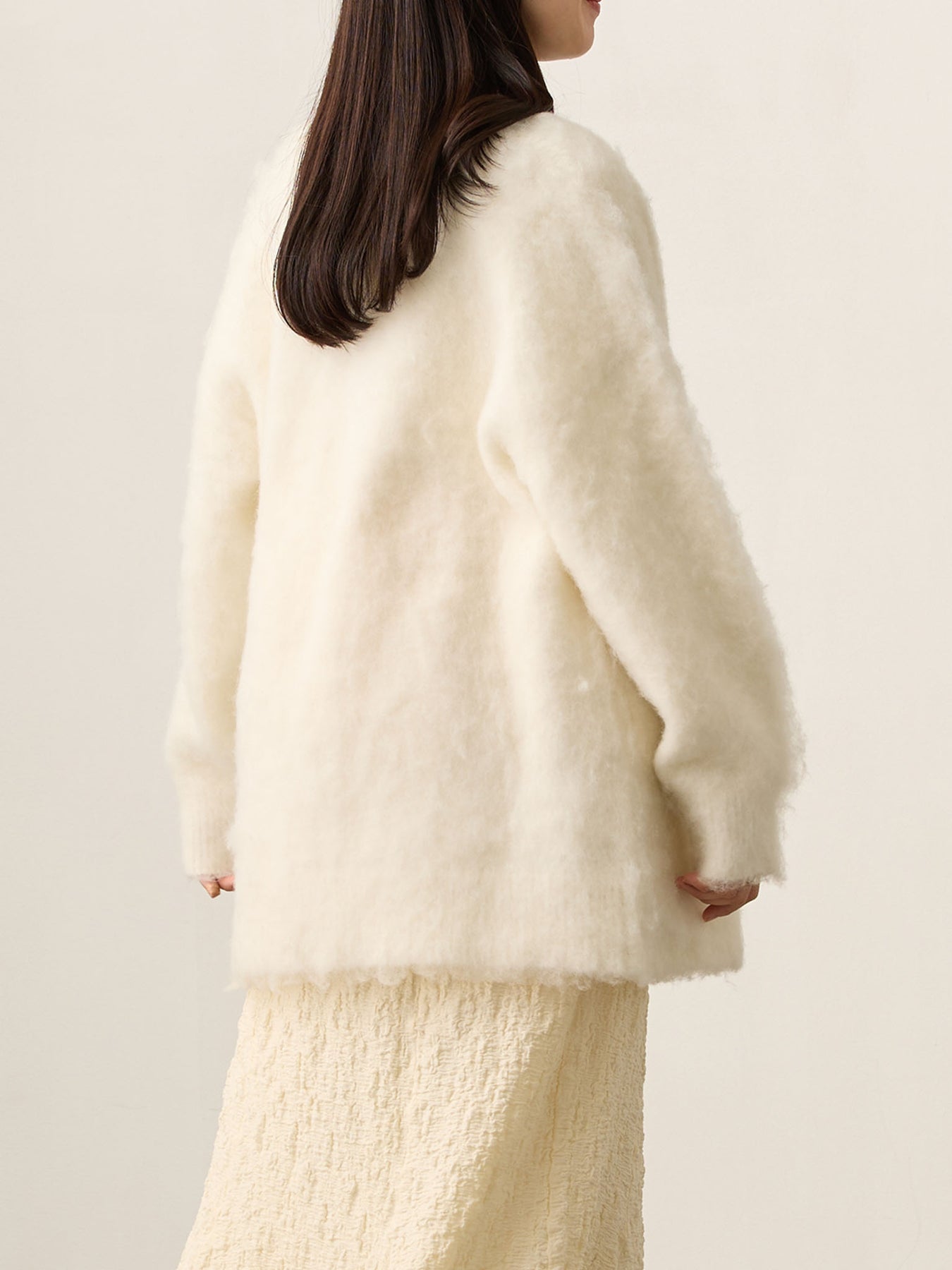ゆったりとしたサイズ感とふわふわ素材が女性らしいカーディガン。