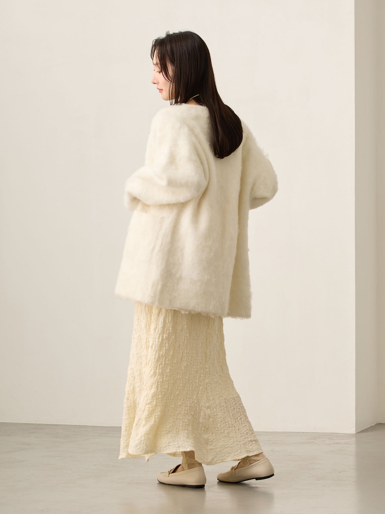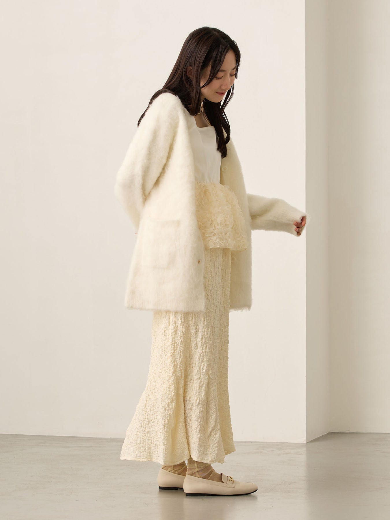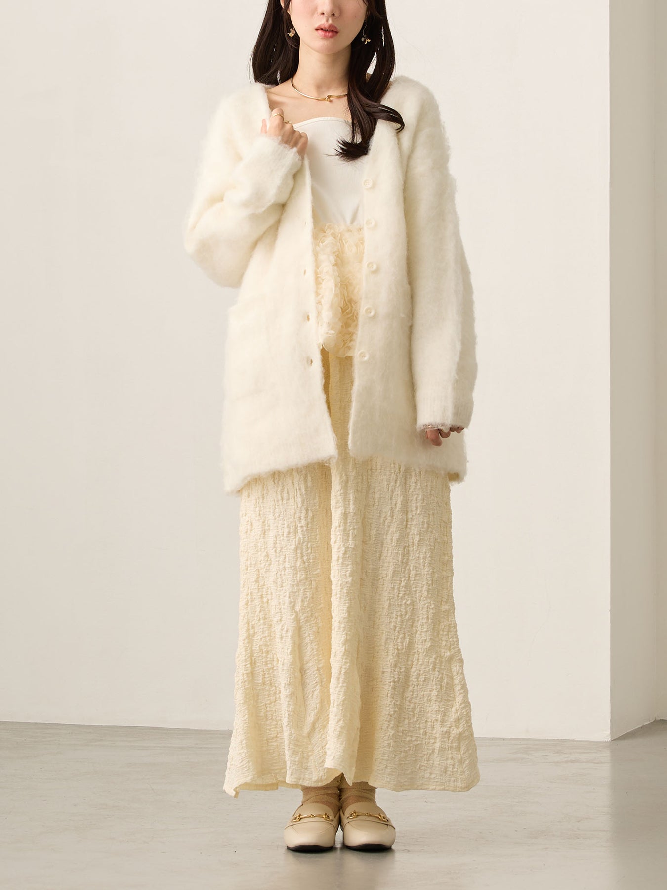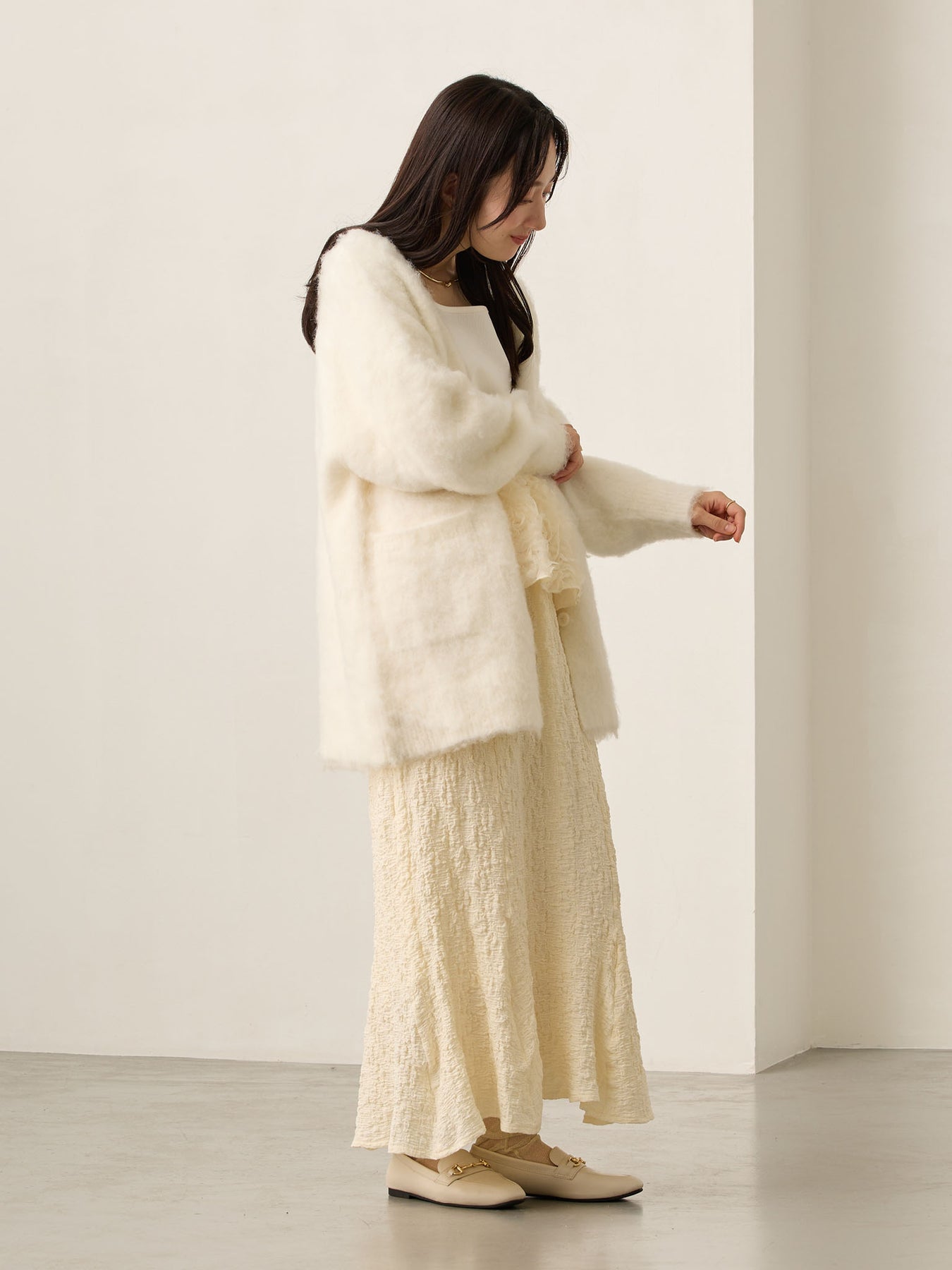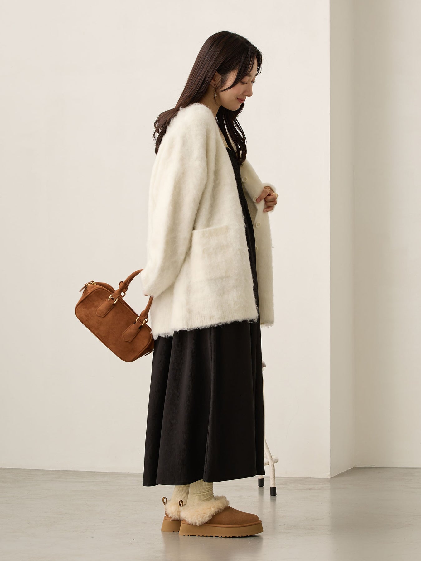 ゆったりとしたサイズ感とふわふわ素材が女性らしいカーディガン。