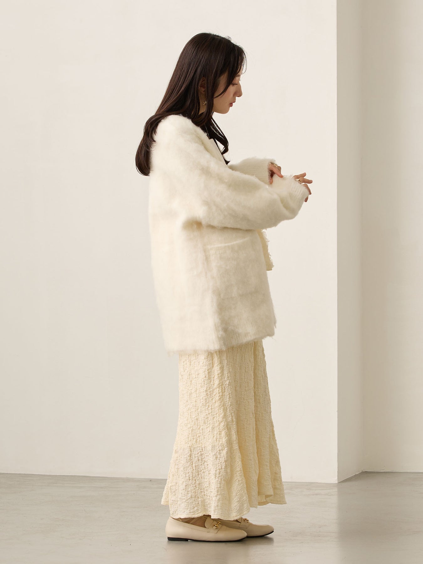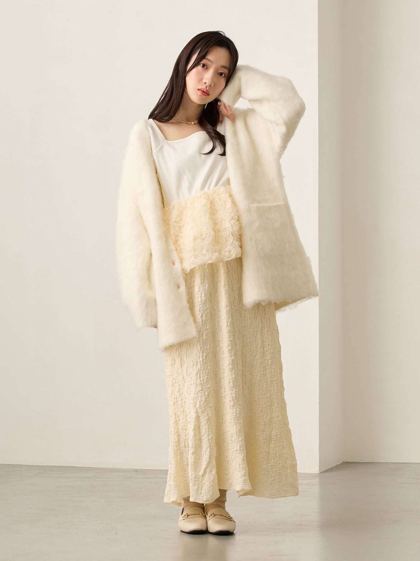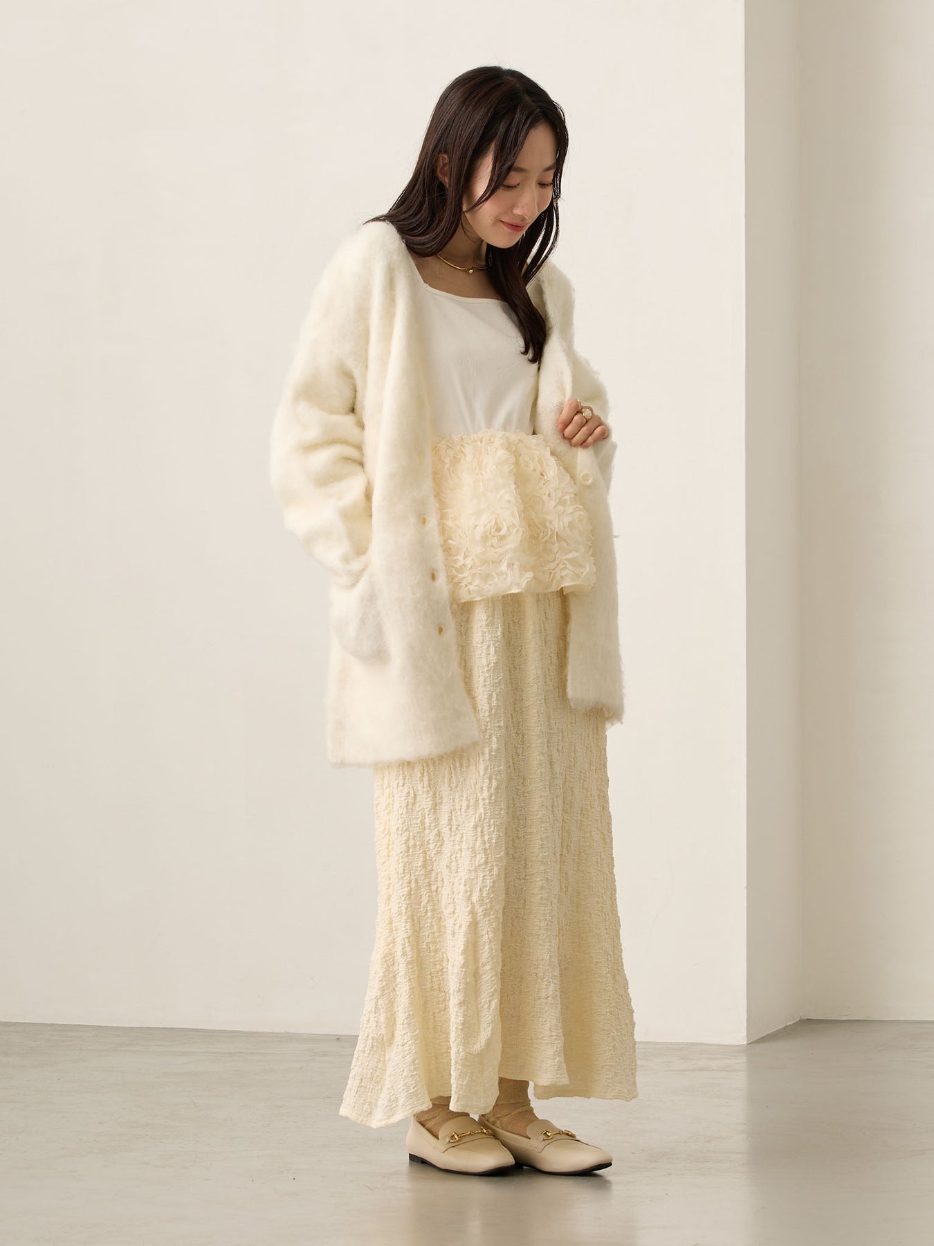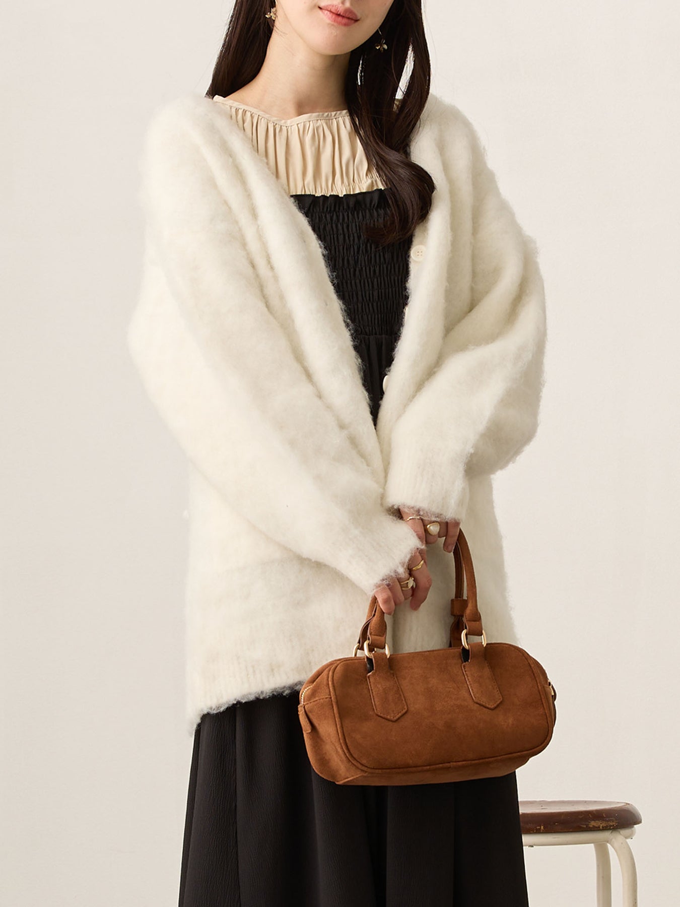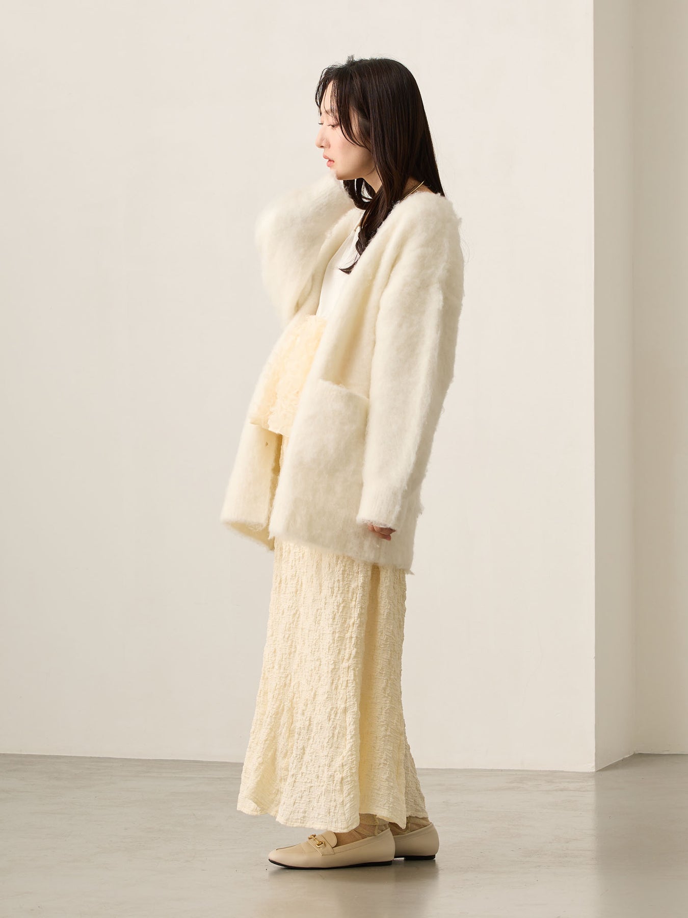 ゆったりとしたサイズ感とふわふわ素材が女性らしいカーディガン。