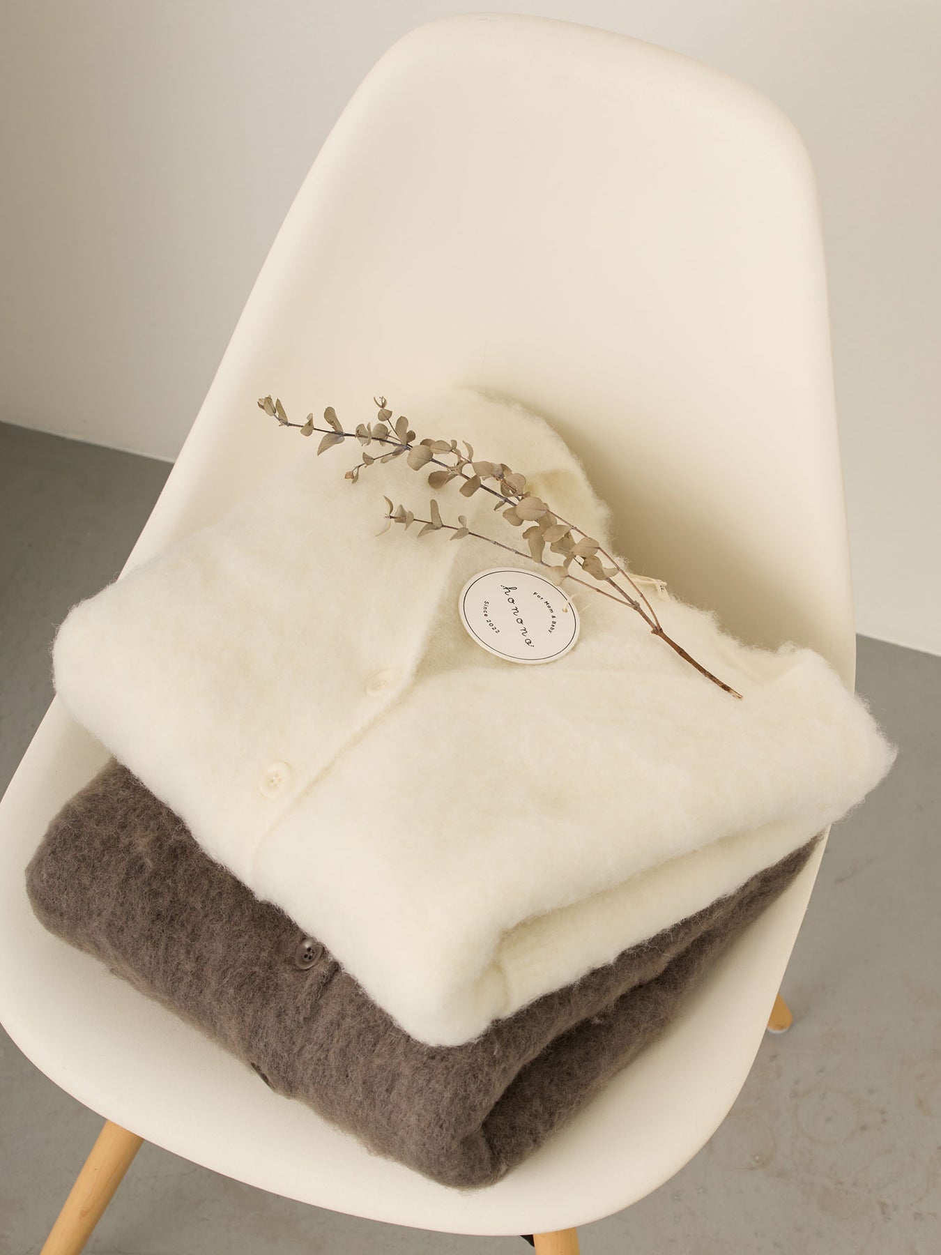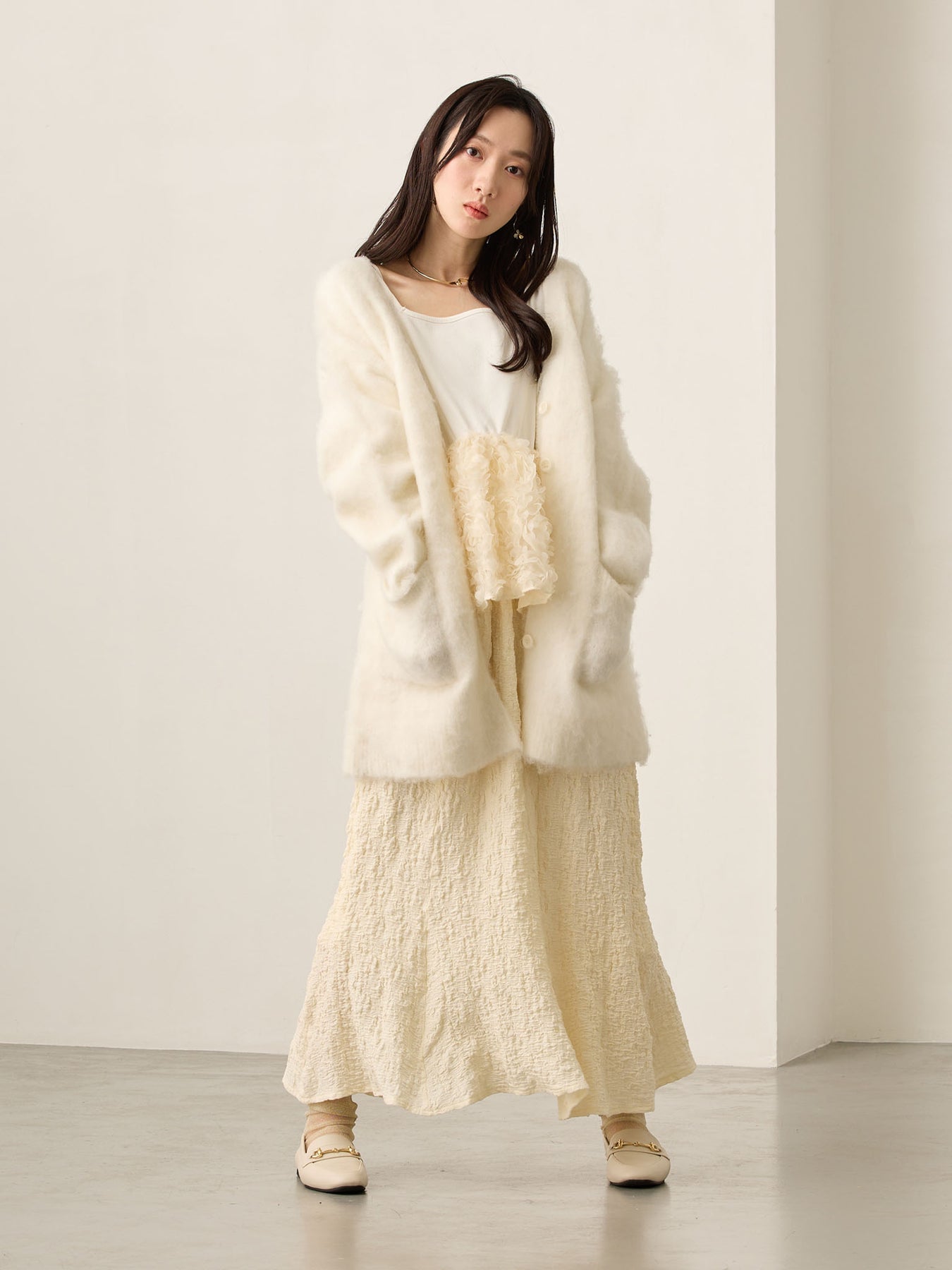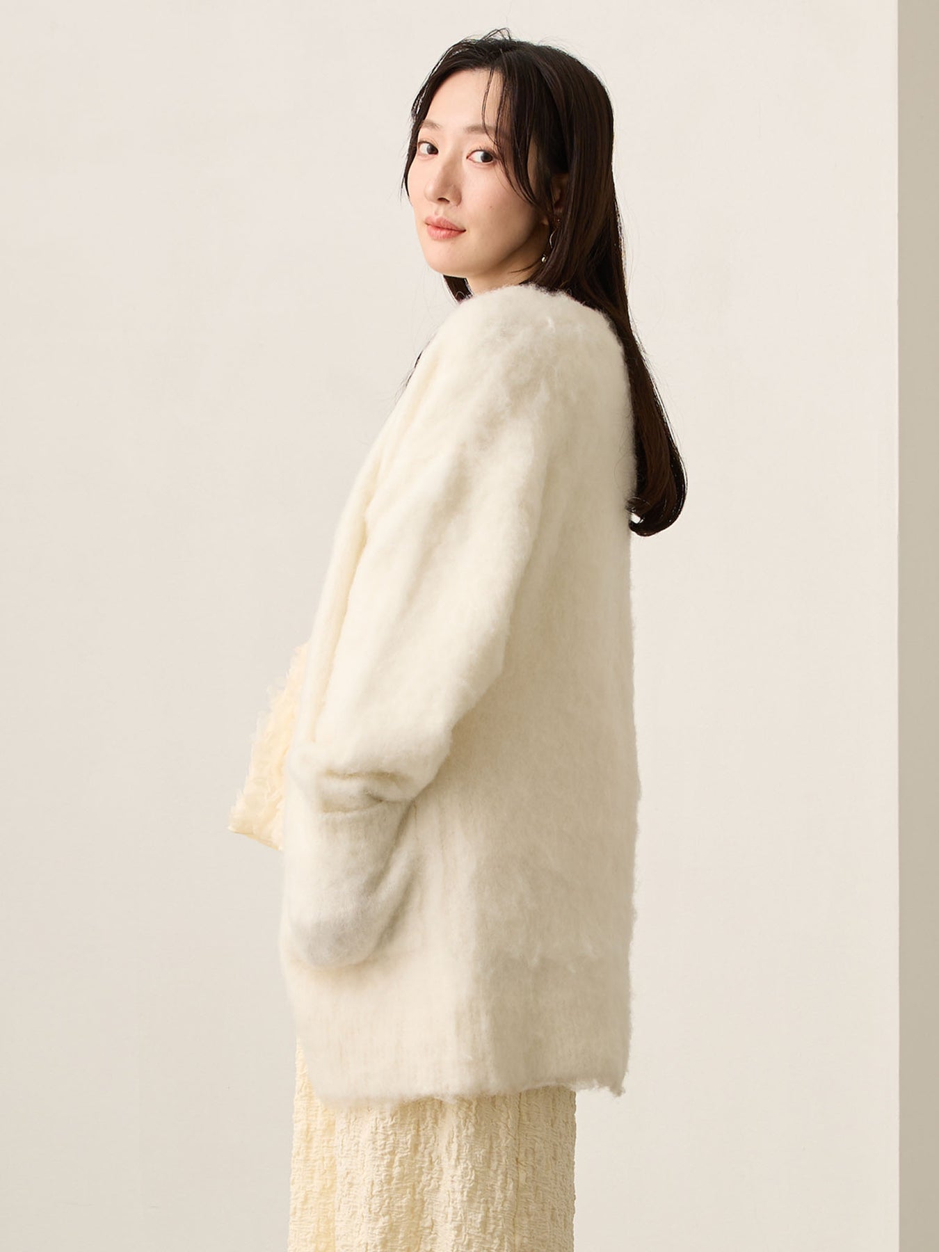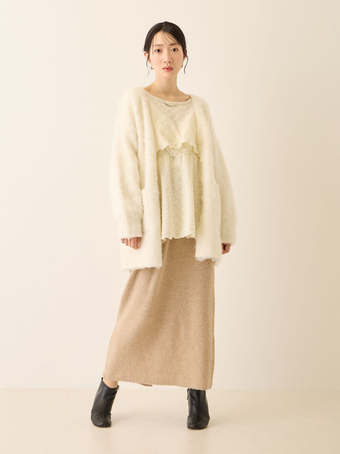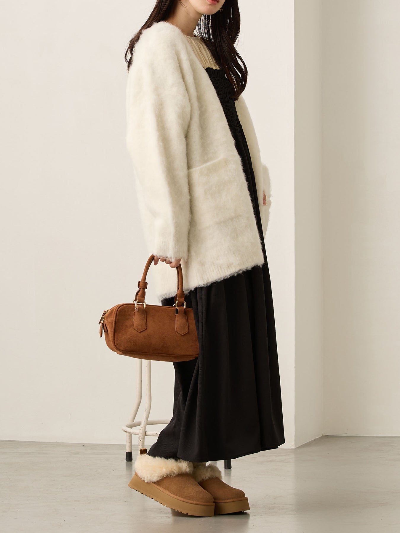 ゆったりとしたサイズ感とふわふわ素材が女性らしいカーディガン。