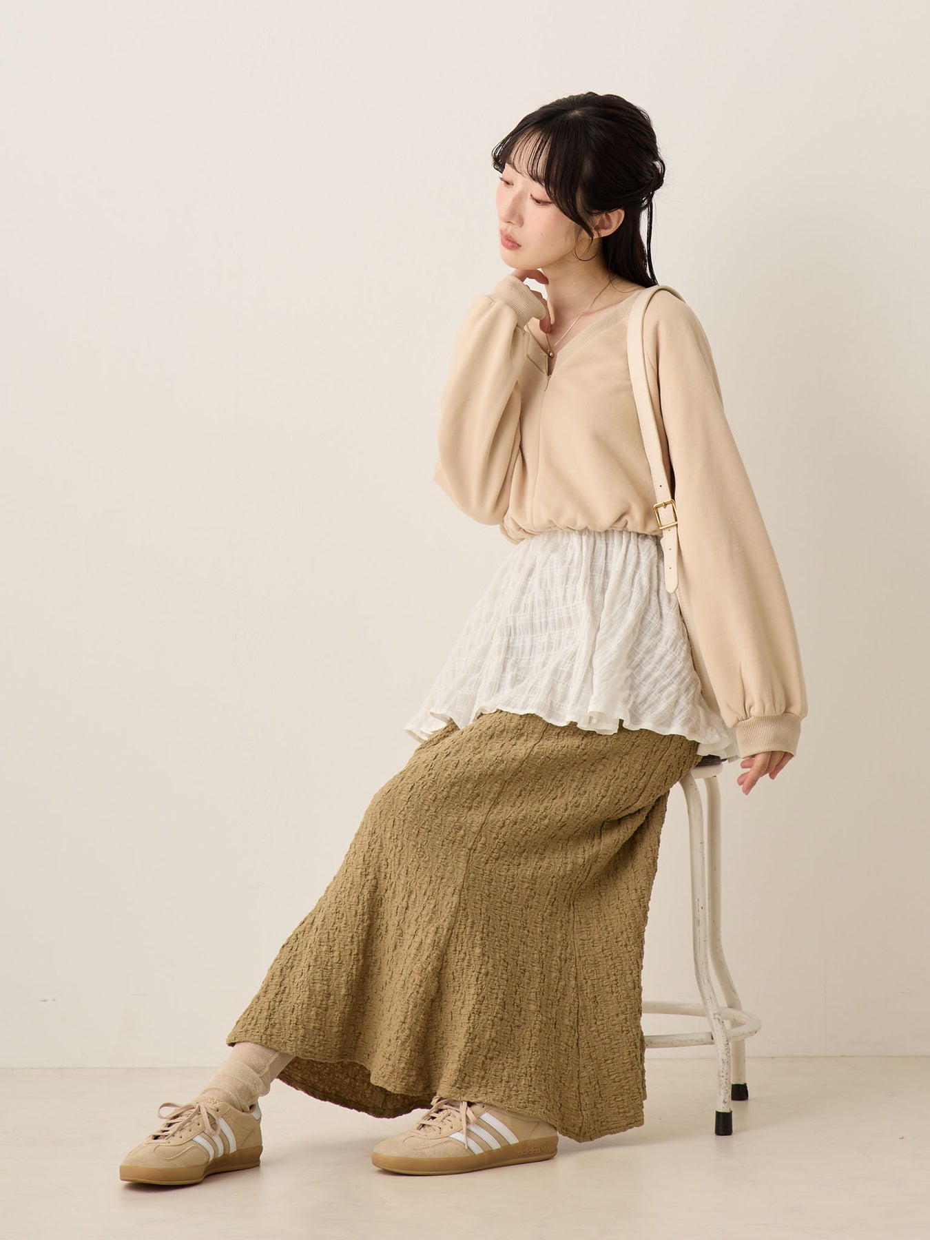 同素材のトップスと合わせてセットアップコーデもオススメです♩