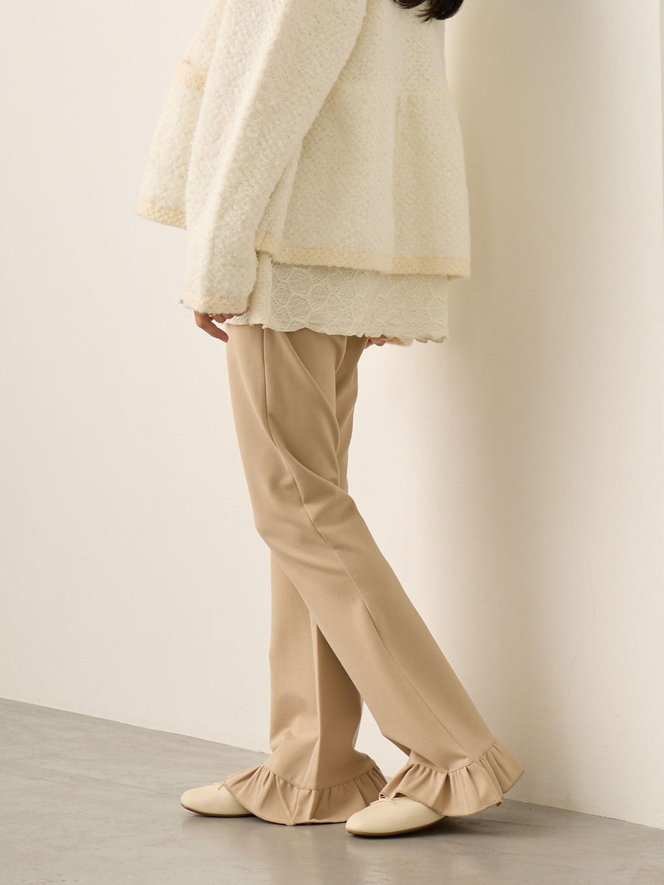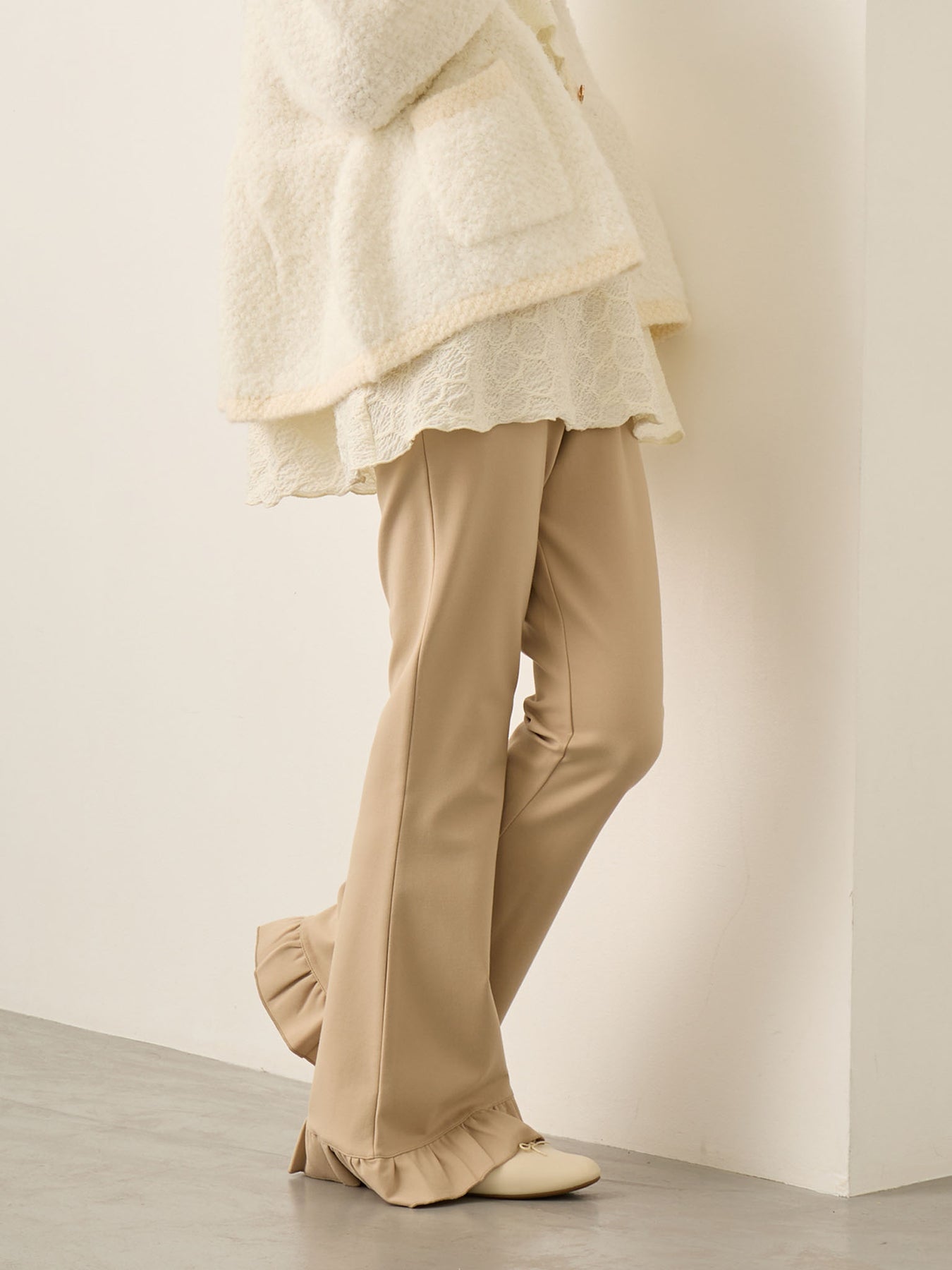 妊娠中や産後も綺麗なフレアラインが楽しめるパンツ。