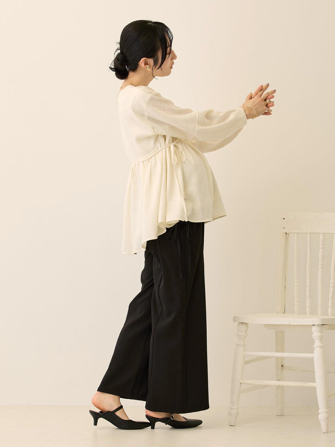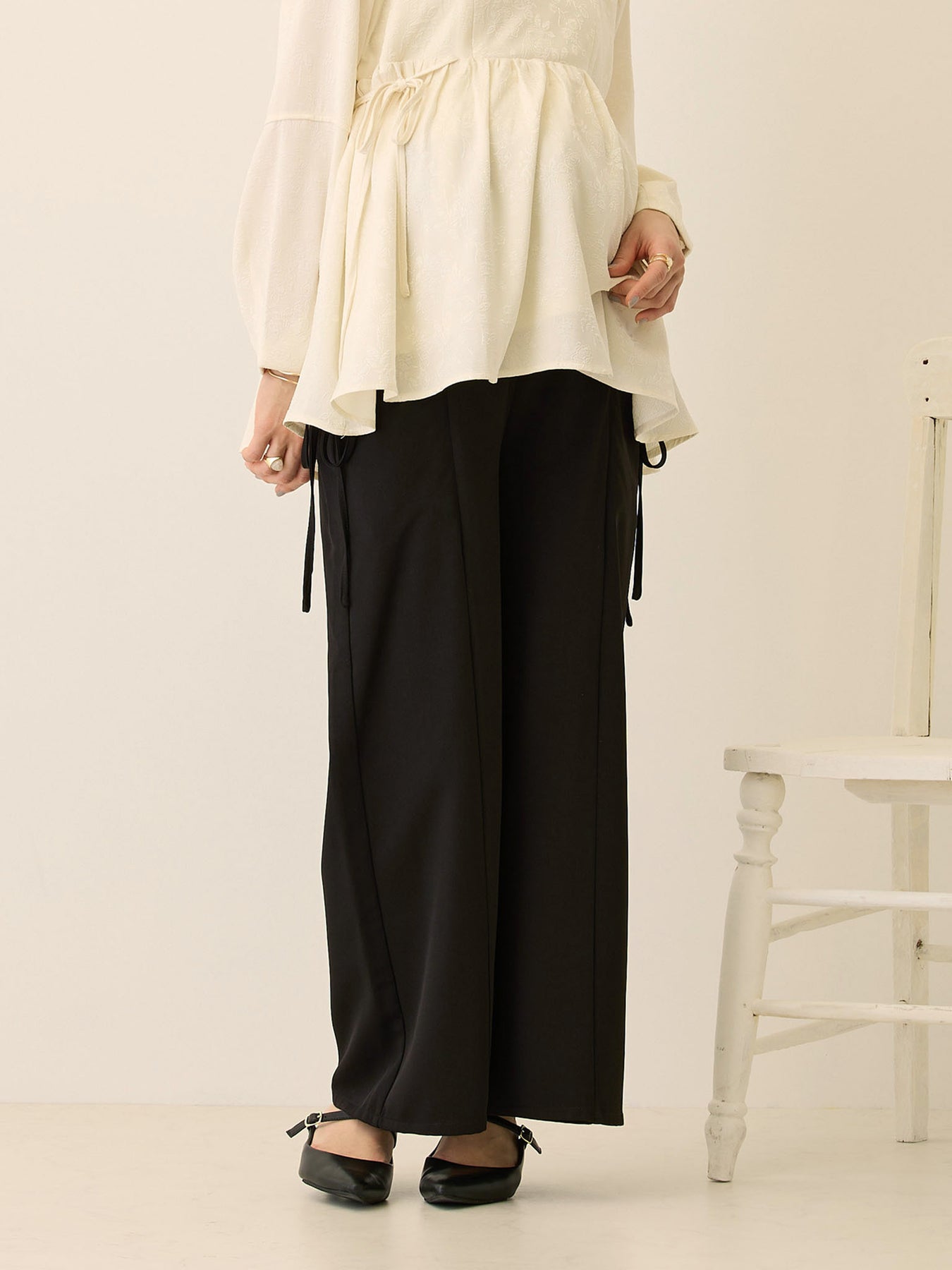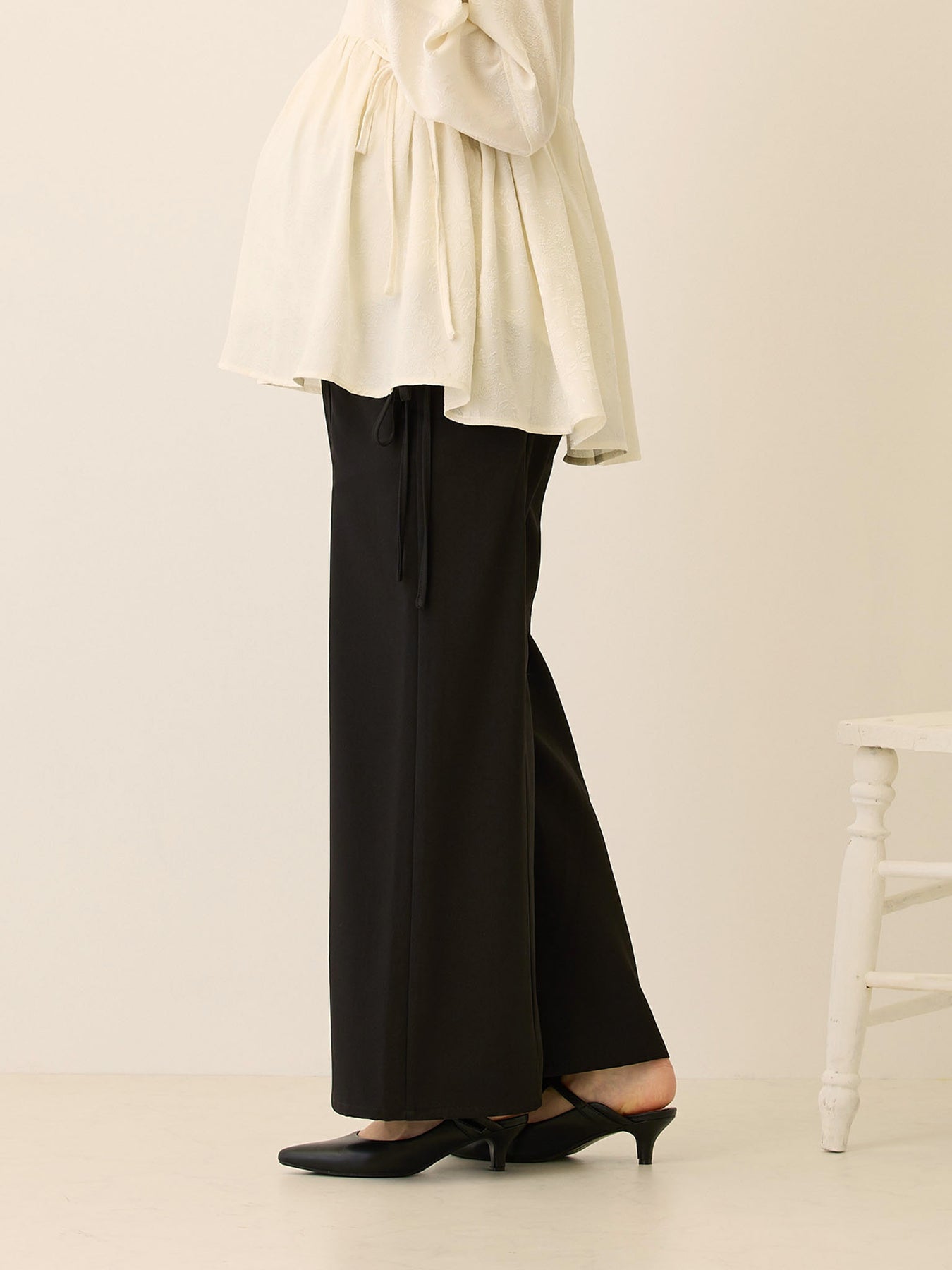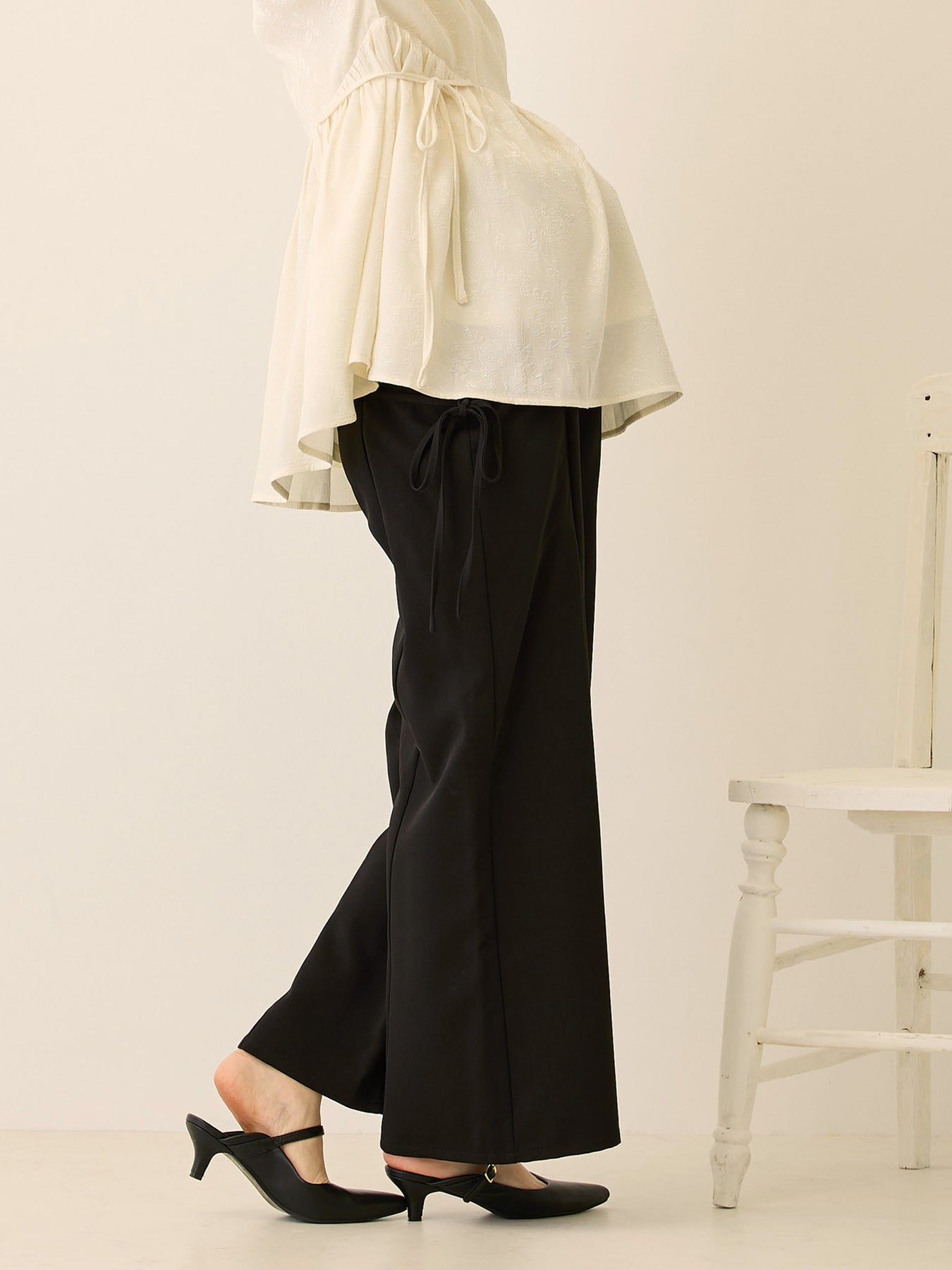 キレイめ素材で大人っぽく履けて、サイドのリボンがフェミニンさも抑えたい方にピッタリのパンツです!