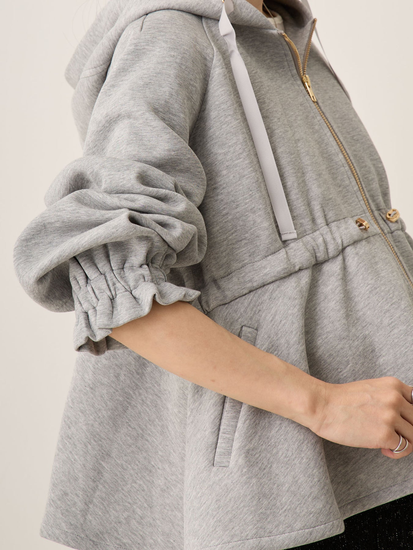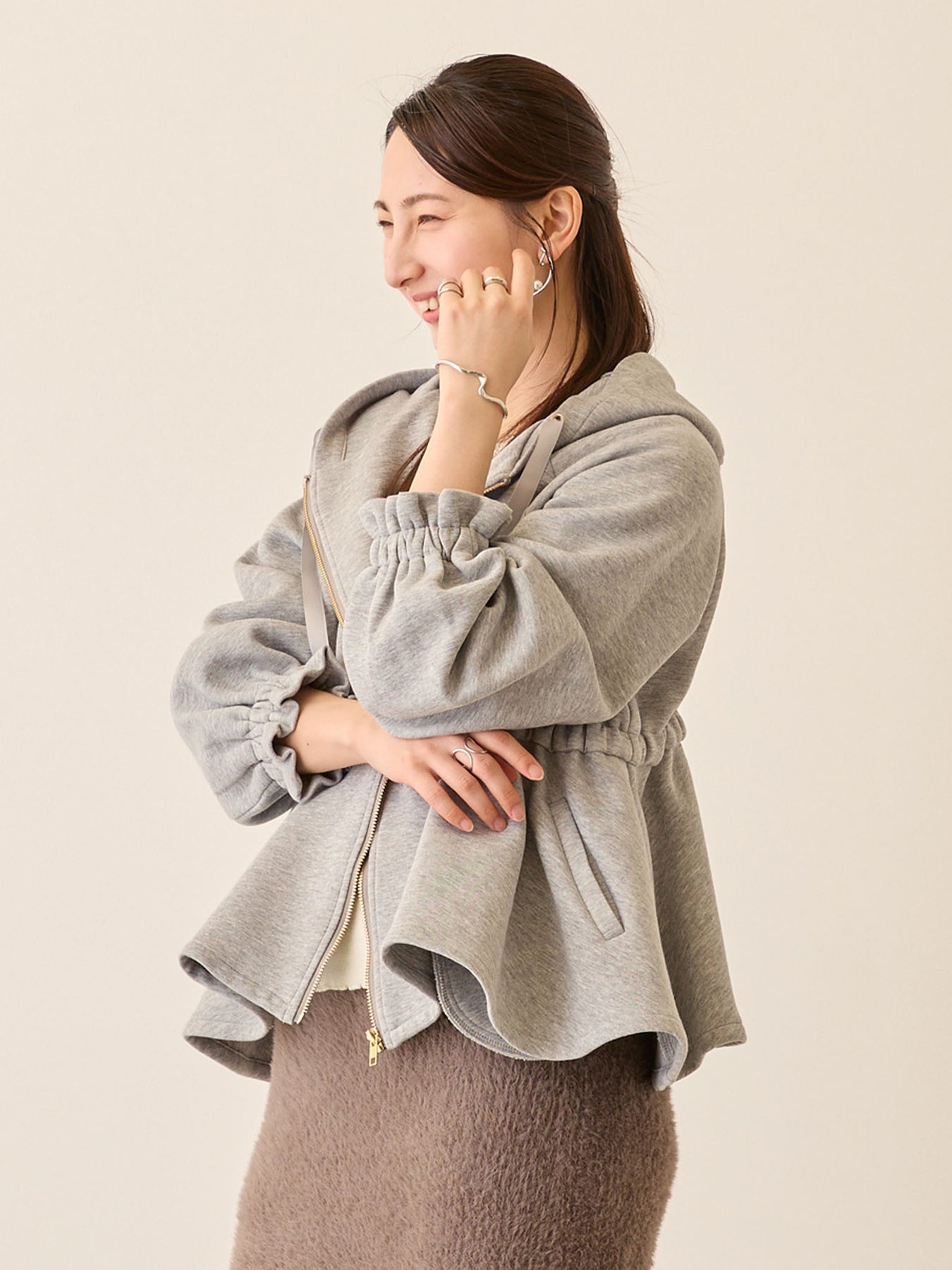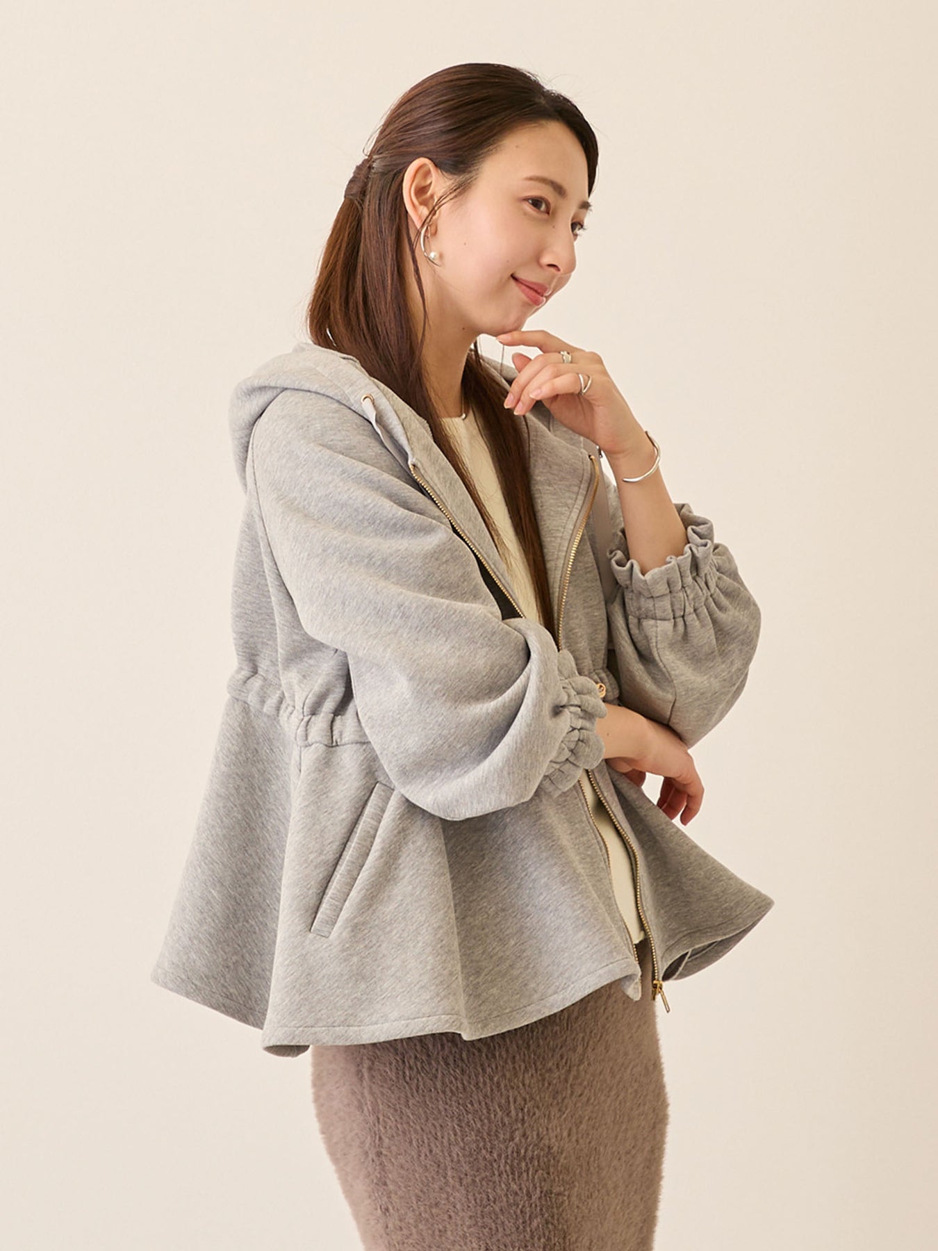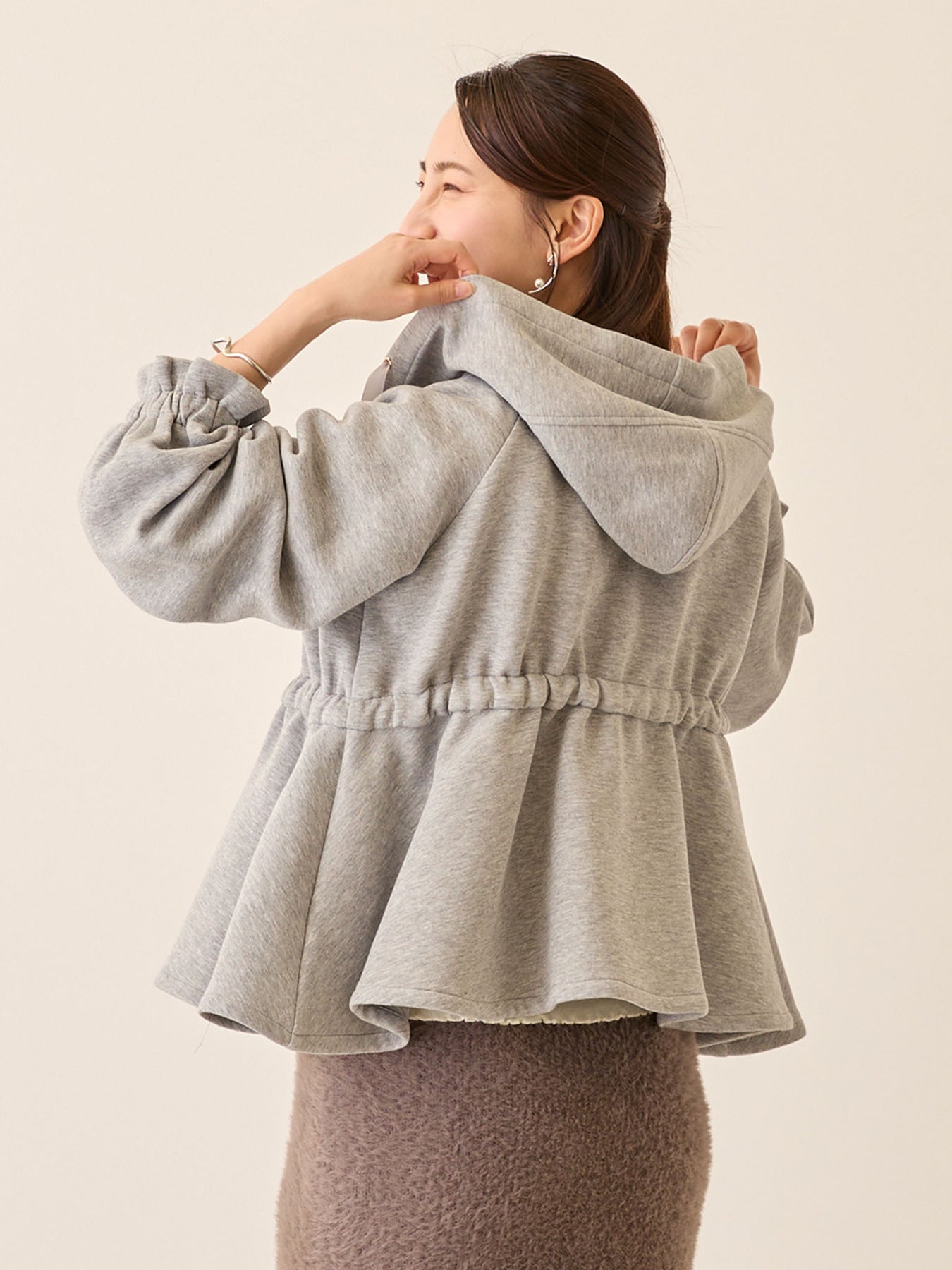 妊娠中は胸下のドローストリングで自由に調整でき、お腹が大きくなっても着膨れして見えず、バランスの良いアウターコーデに。