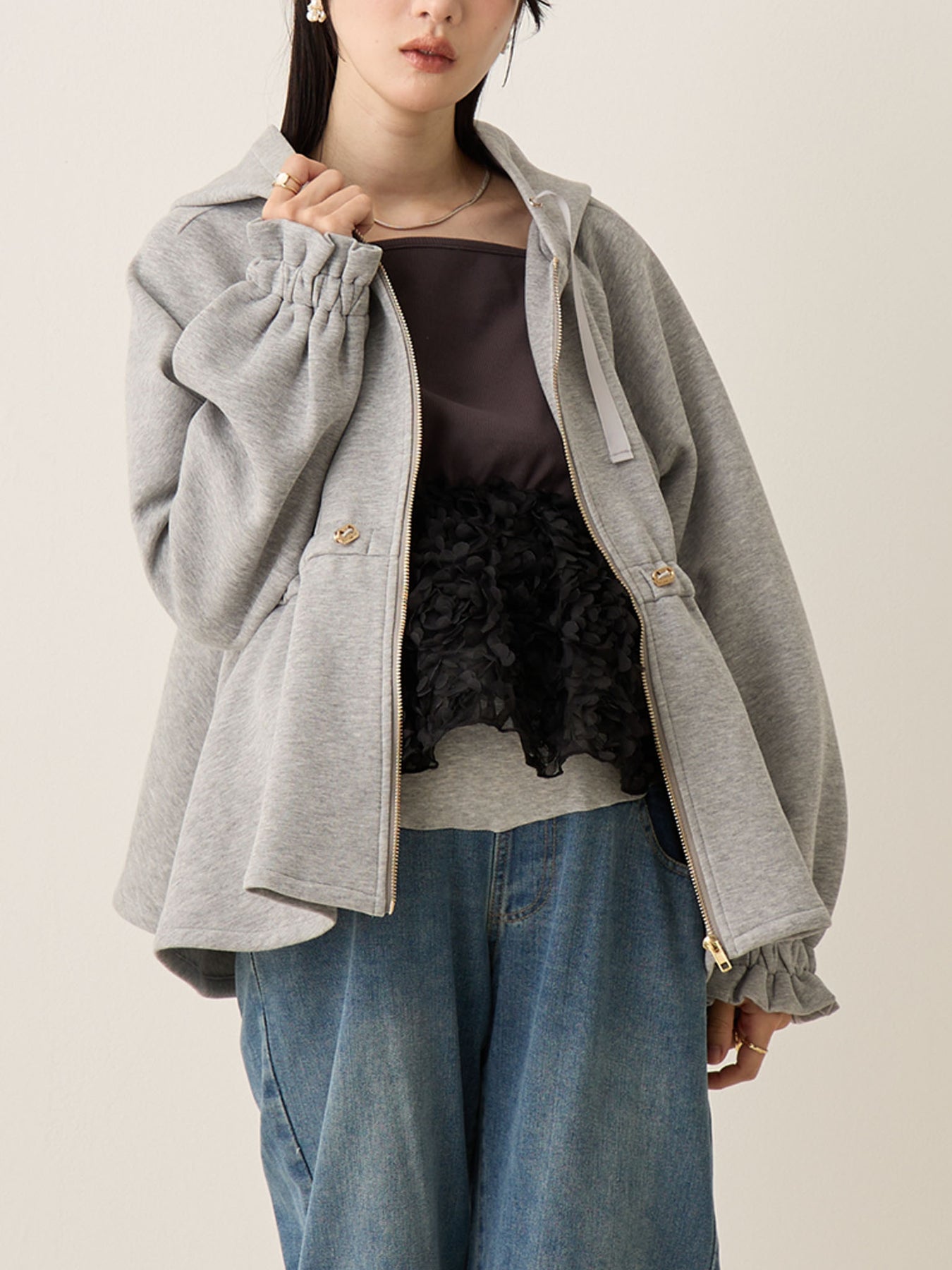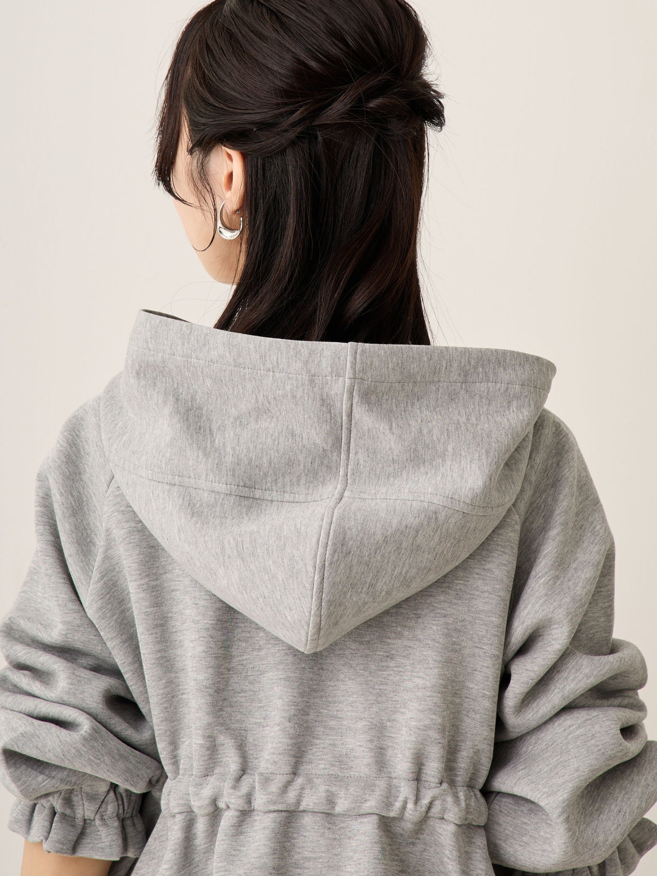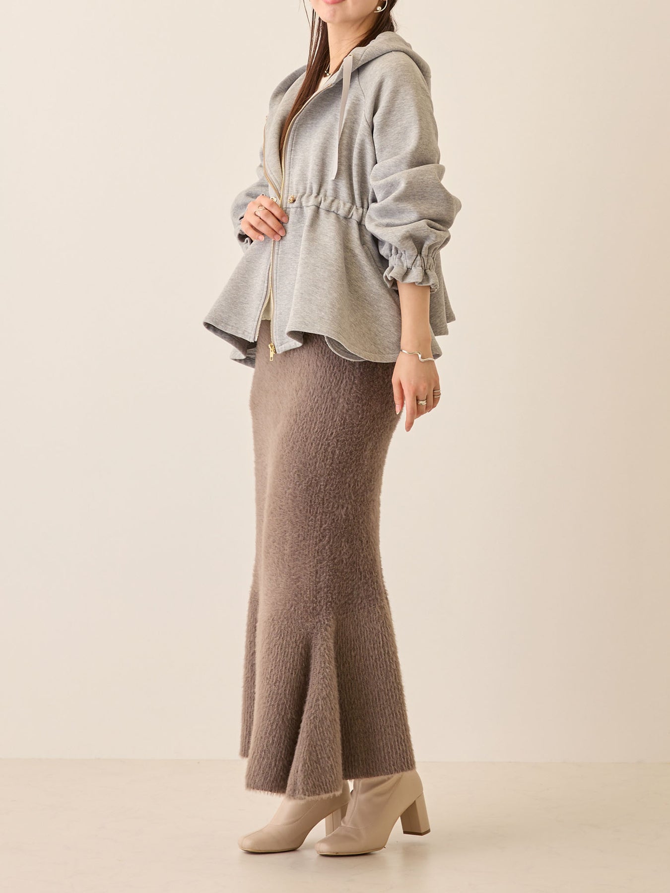妊娠中は胸下のドローストリングで自由に調整でき、お腹が大きくなっても着膨れして見えず、バランスの良いアウターコーデに。