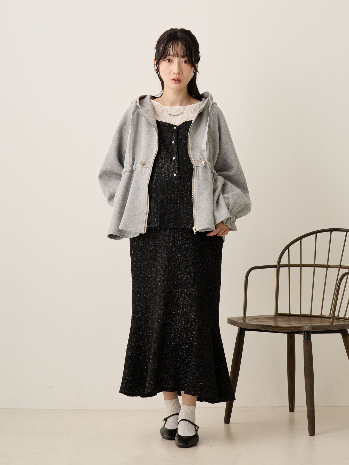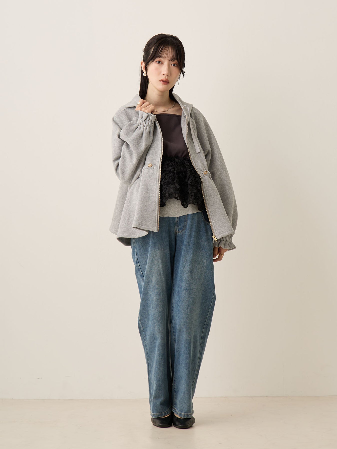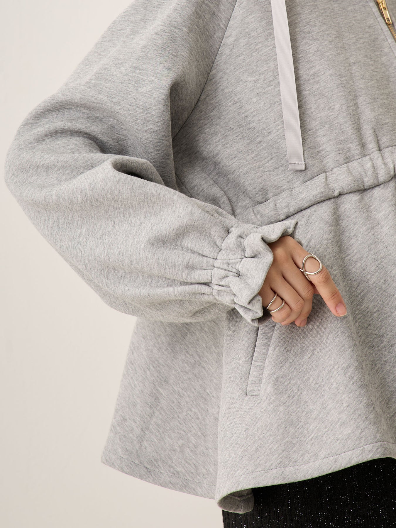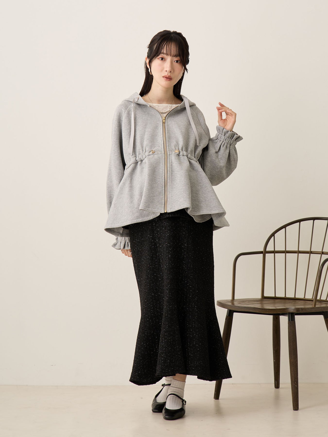 妊娠中は胸下のドローストリングで自由に調整でき、お腹が大きくなっても着膨れして見えず、バランスの良いアウターコーデに。
