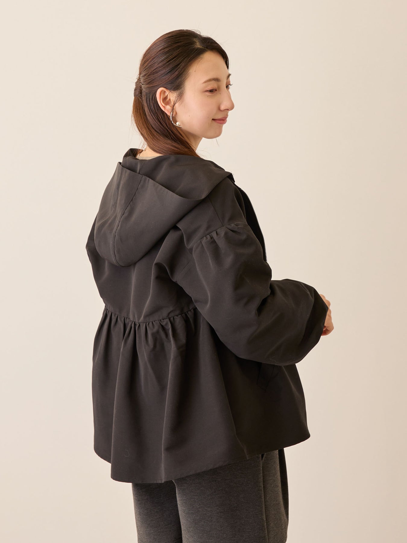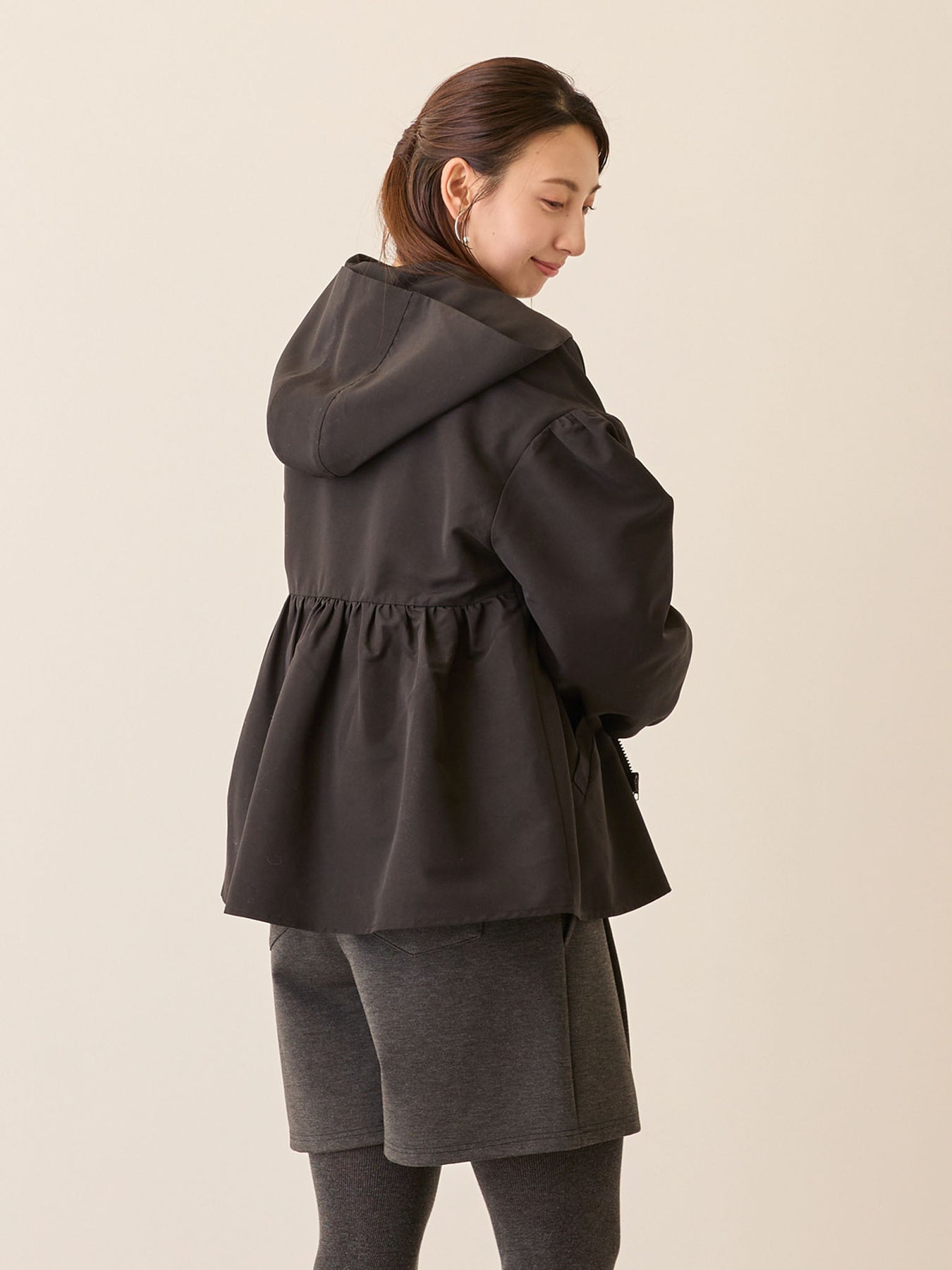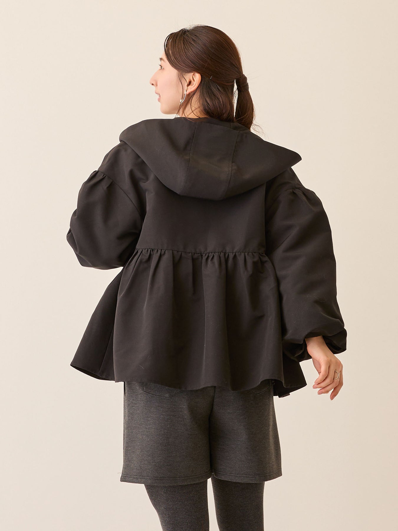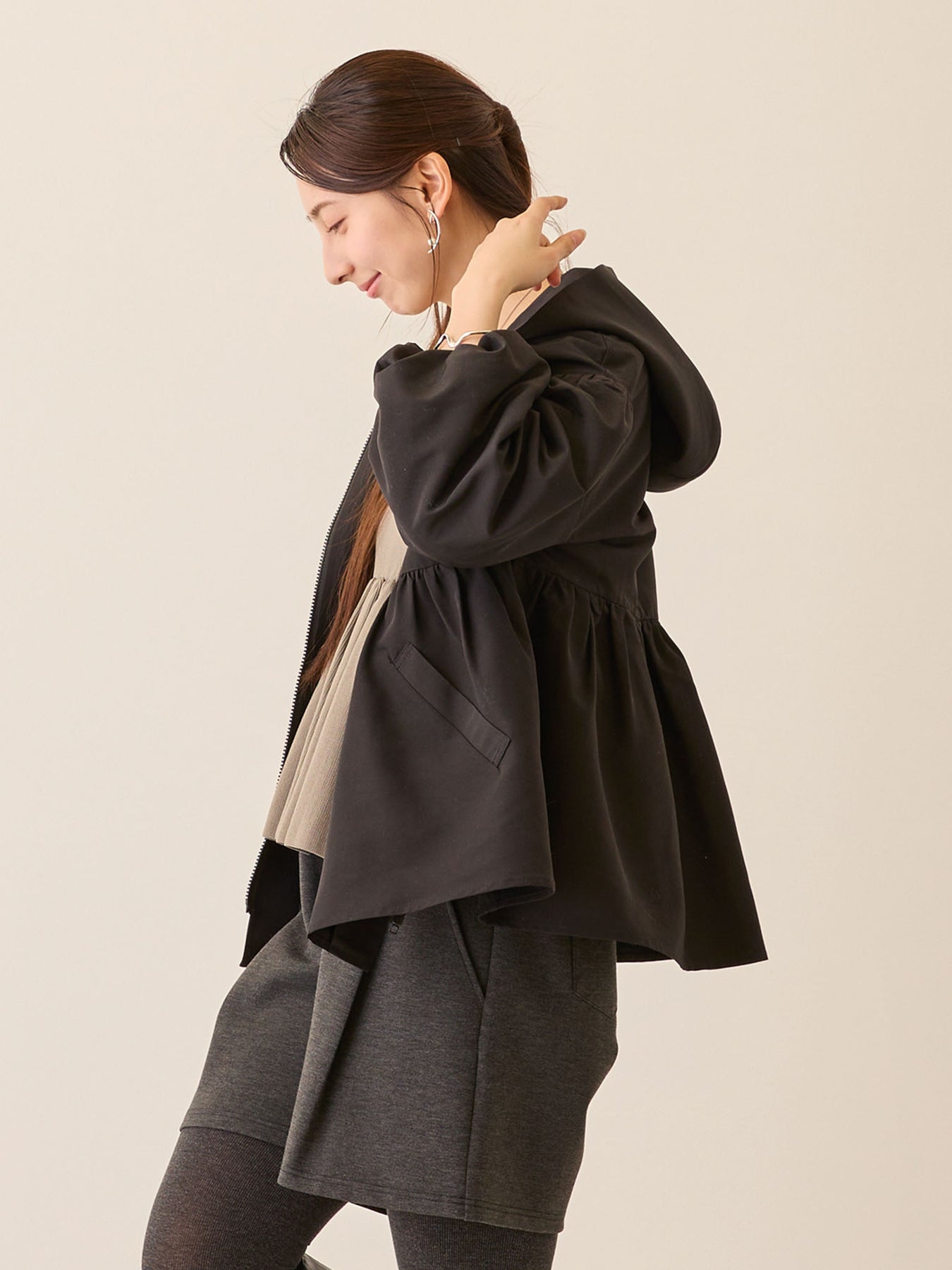 フード付きペプラムライトアウター Black