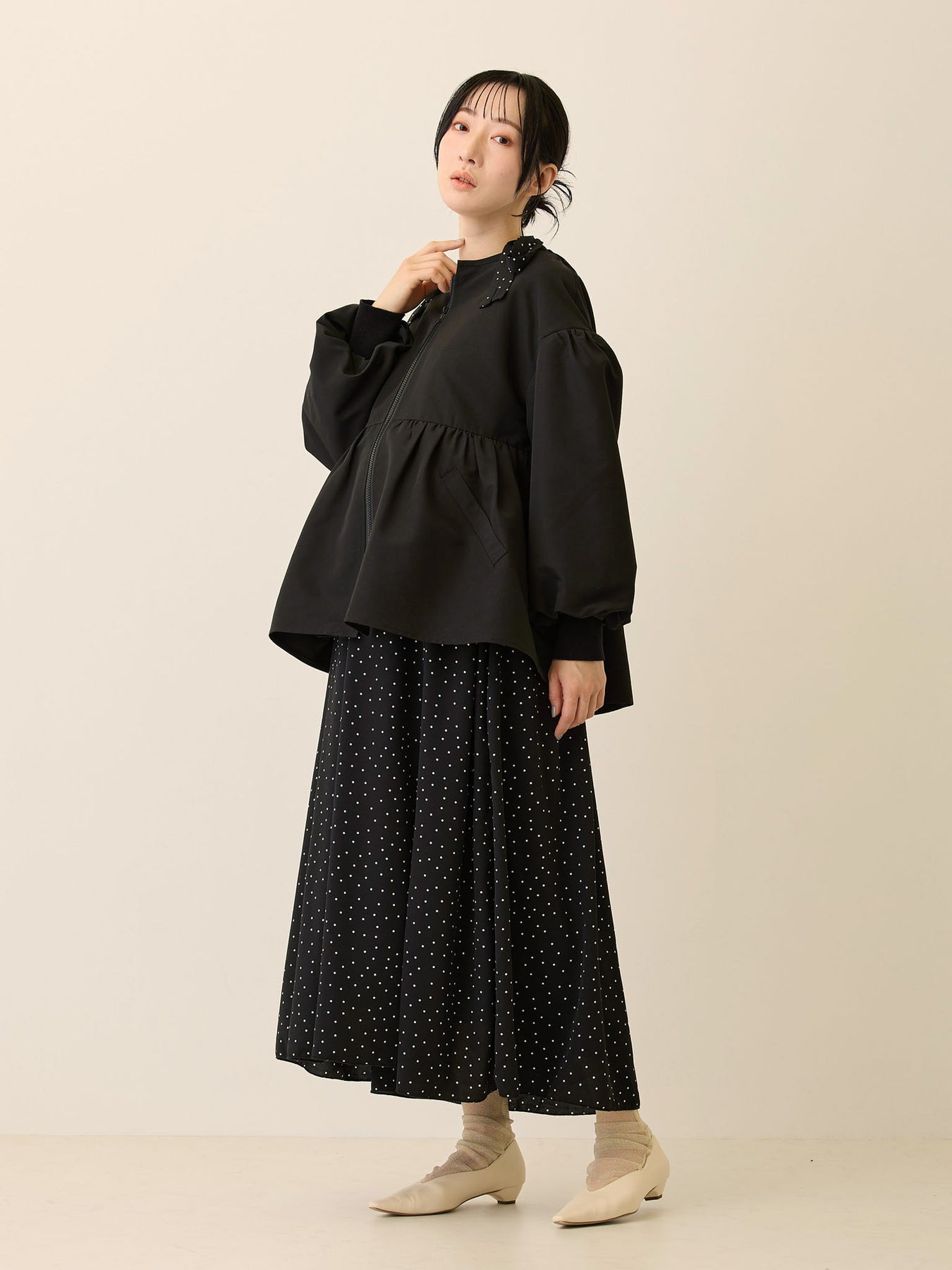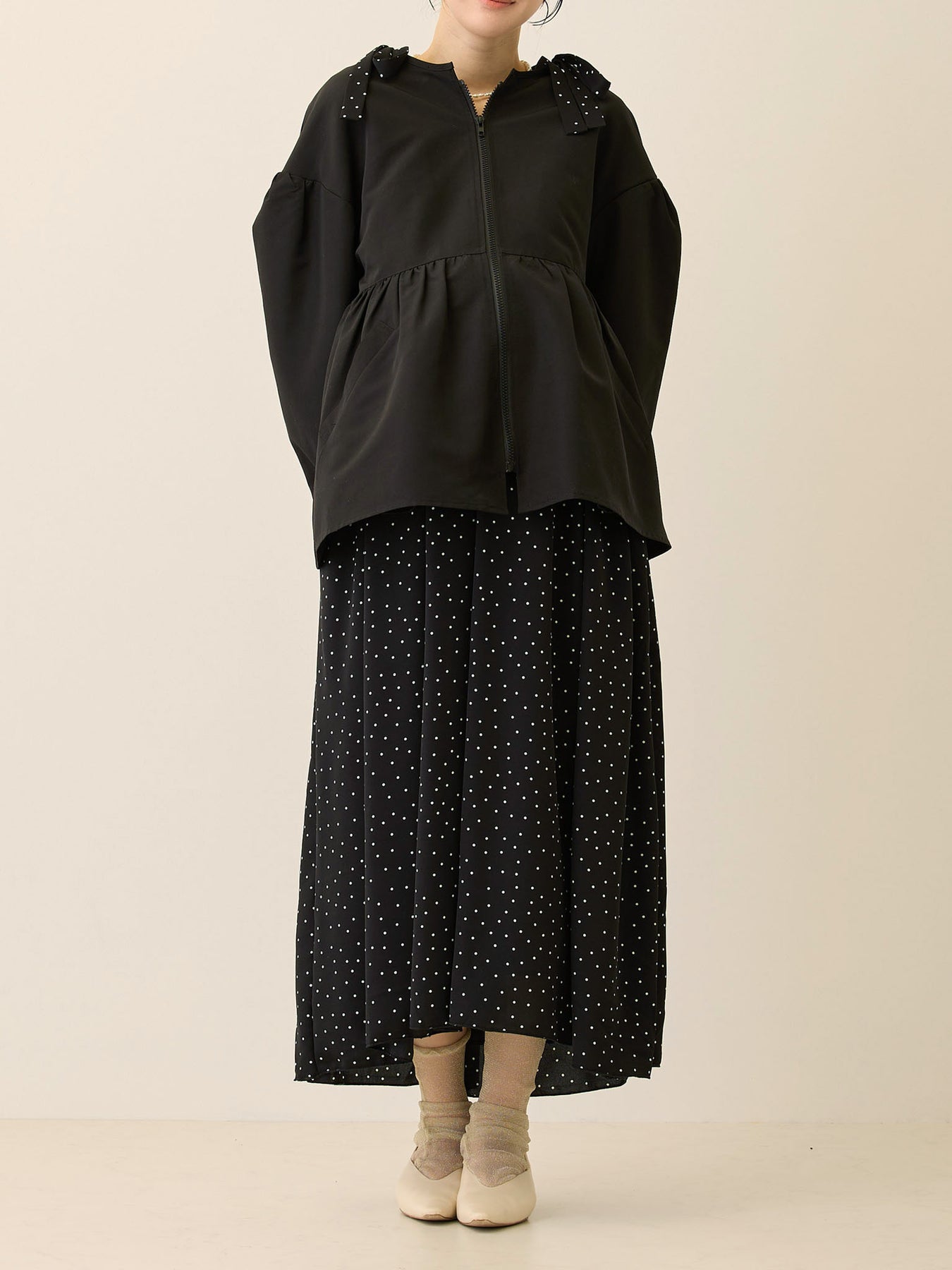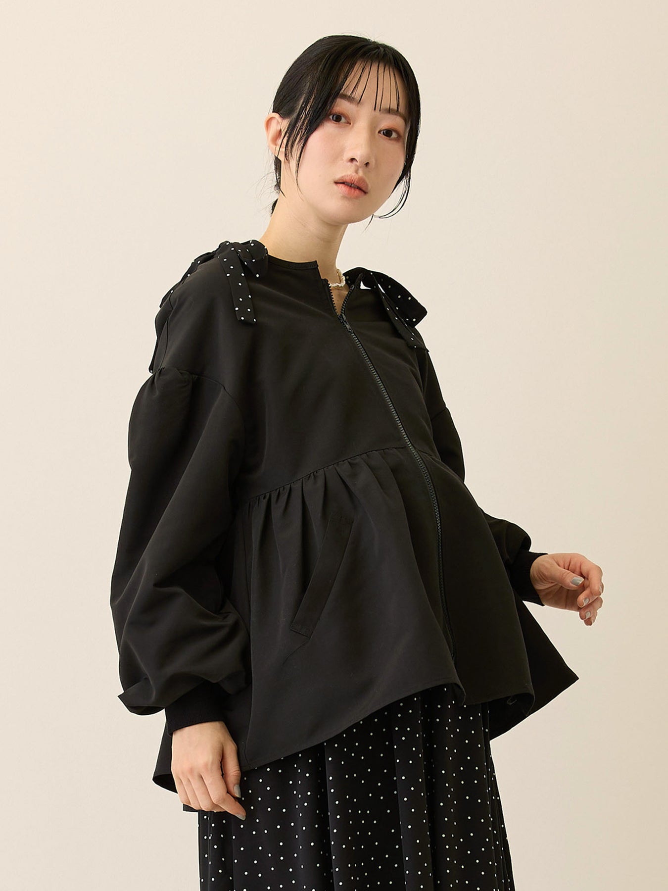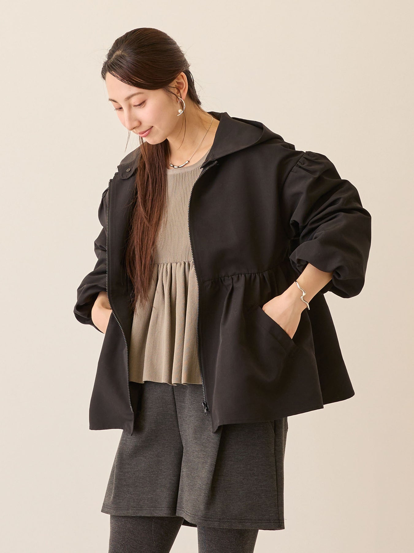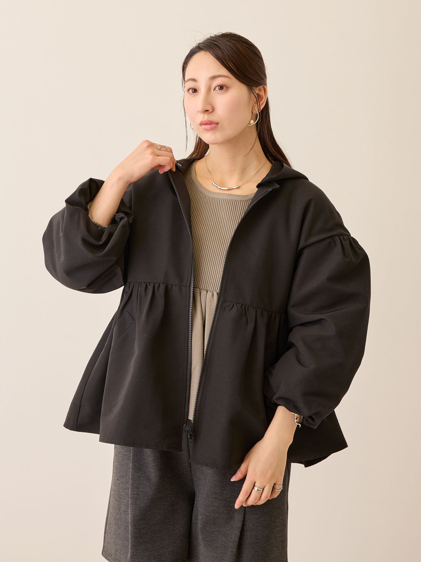 フード付きペプラムライトアウター Black
