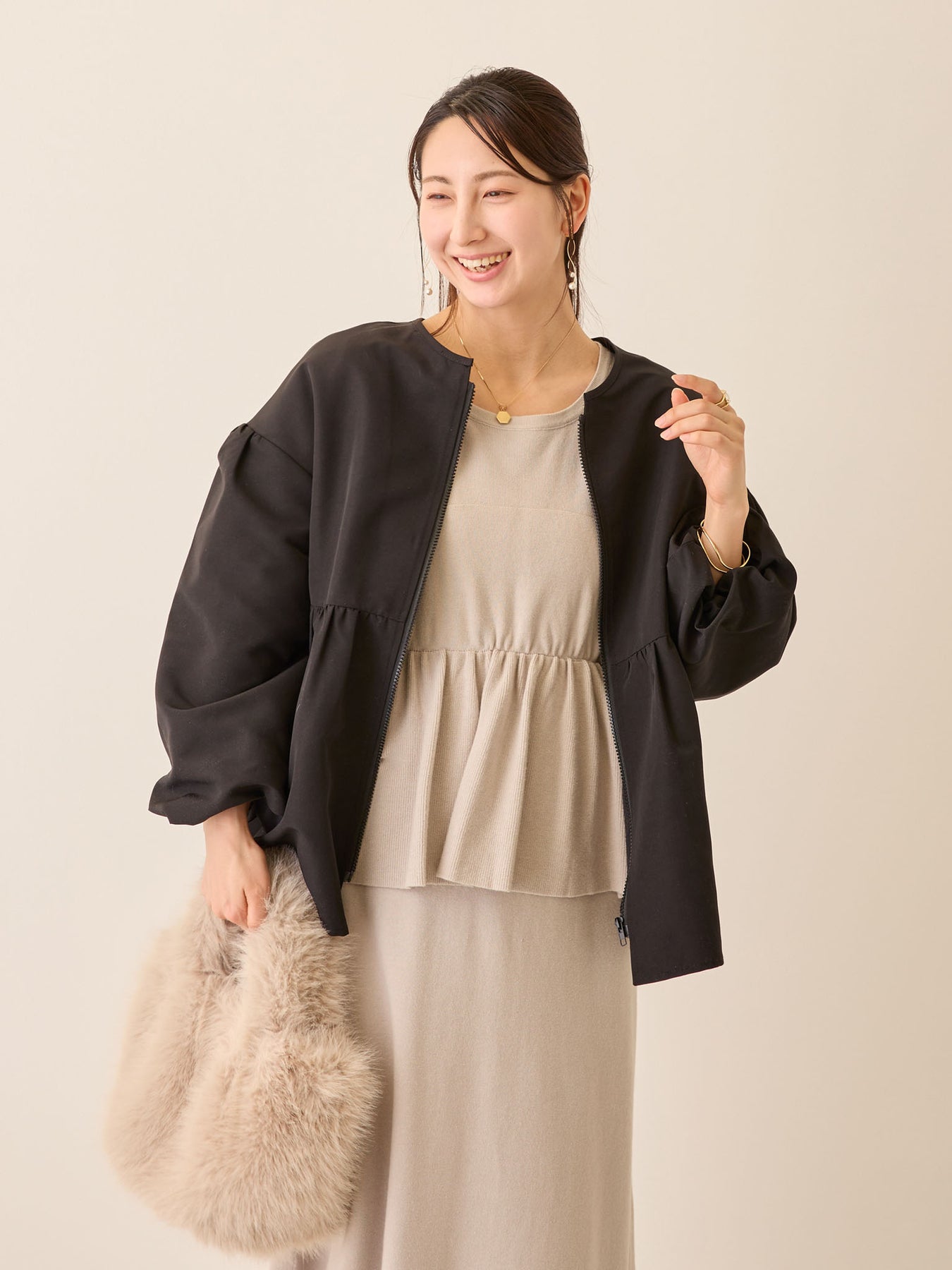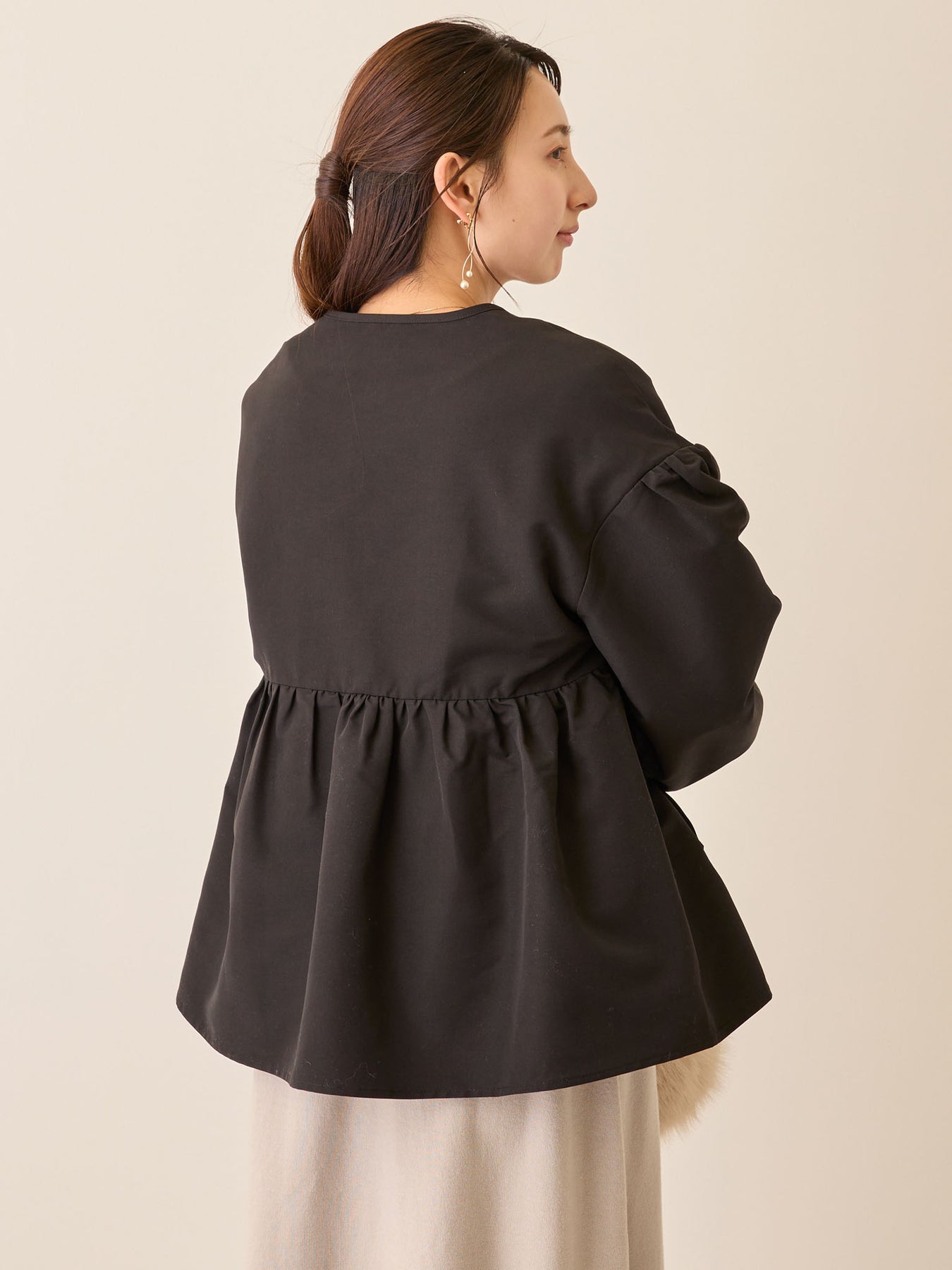 ニットの上にも羽織りやすい広めのアームホールと、妊娠中にもピッタリのペプラムシルエットが魅力です!