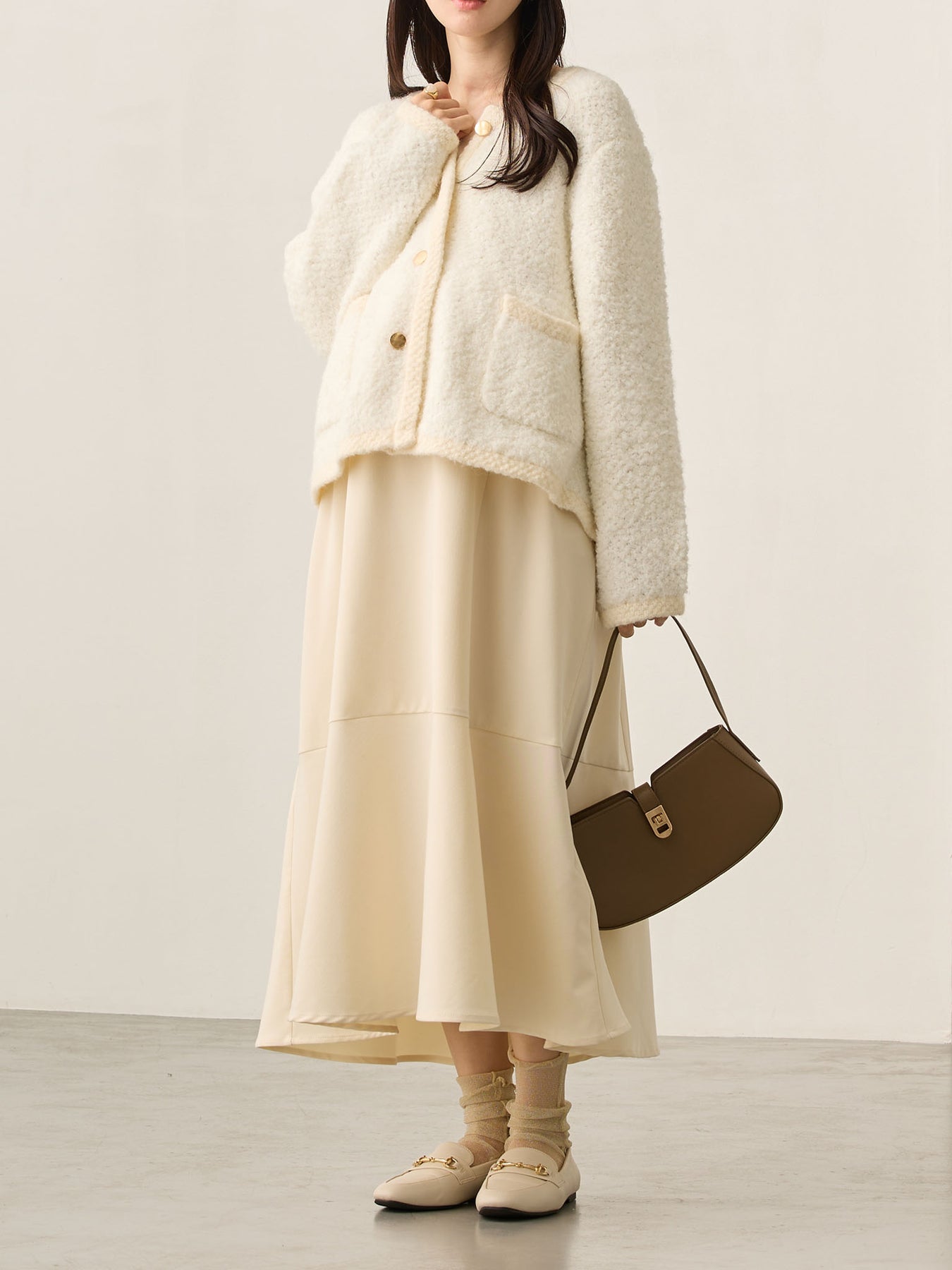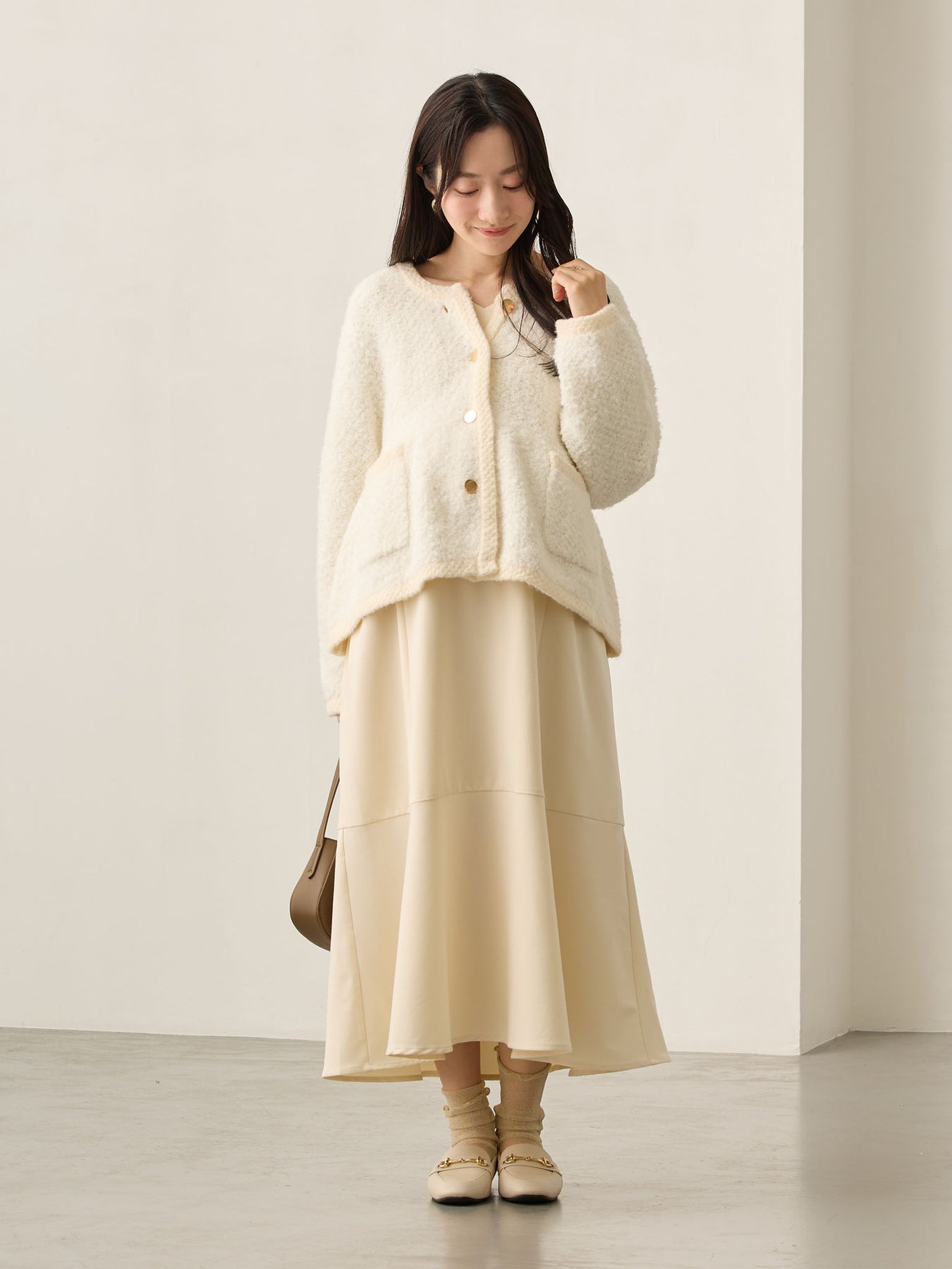 ・寒い時期にはカーディガン、ジャケットを羽織ったり、ショートブーツ合わせも◎