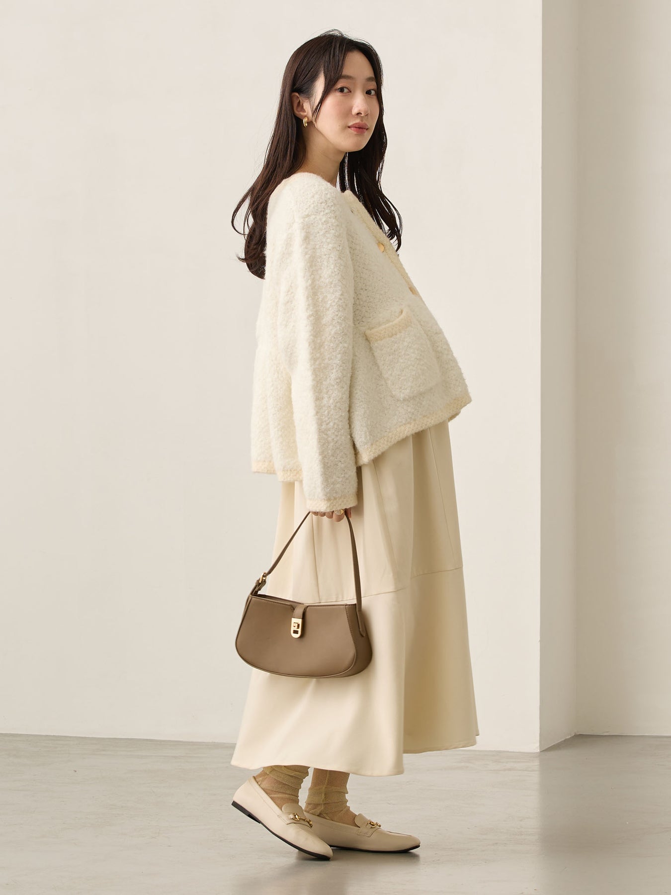 コクーン袖がぽわんと女性らしく、袖丈はコンパクトめに設定し、もたつかない印象に。