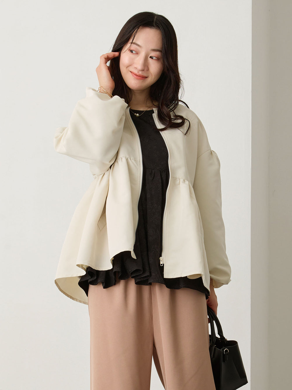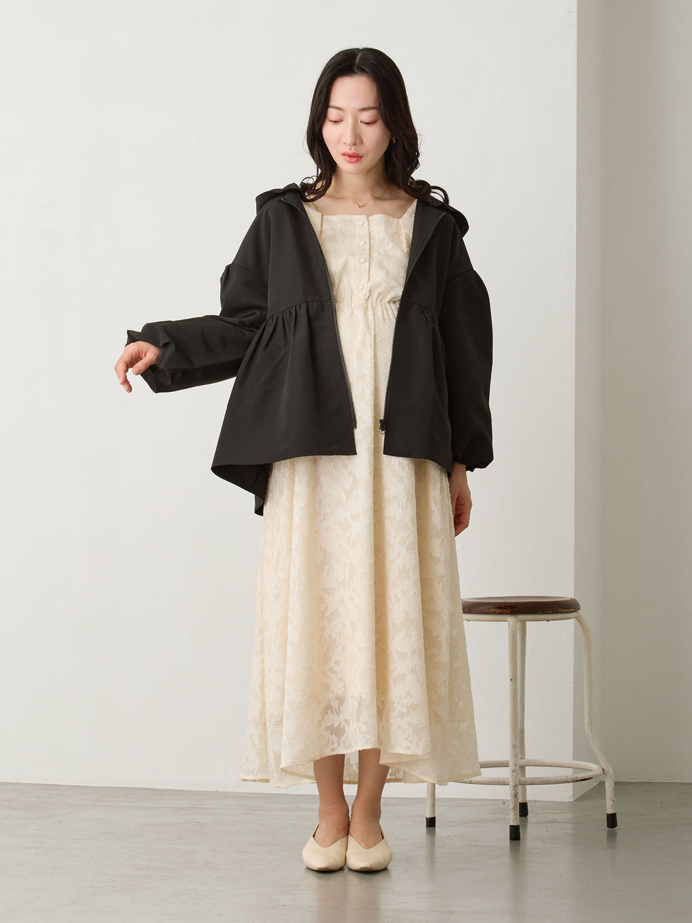 フード付きペプラムライトアウター Ivory