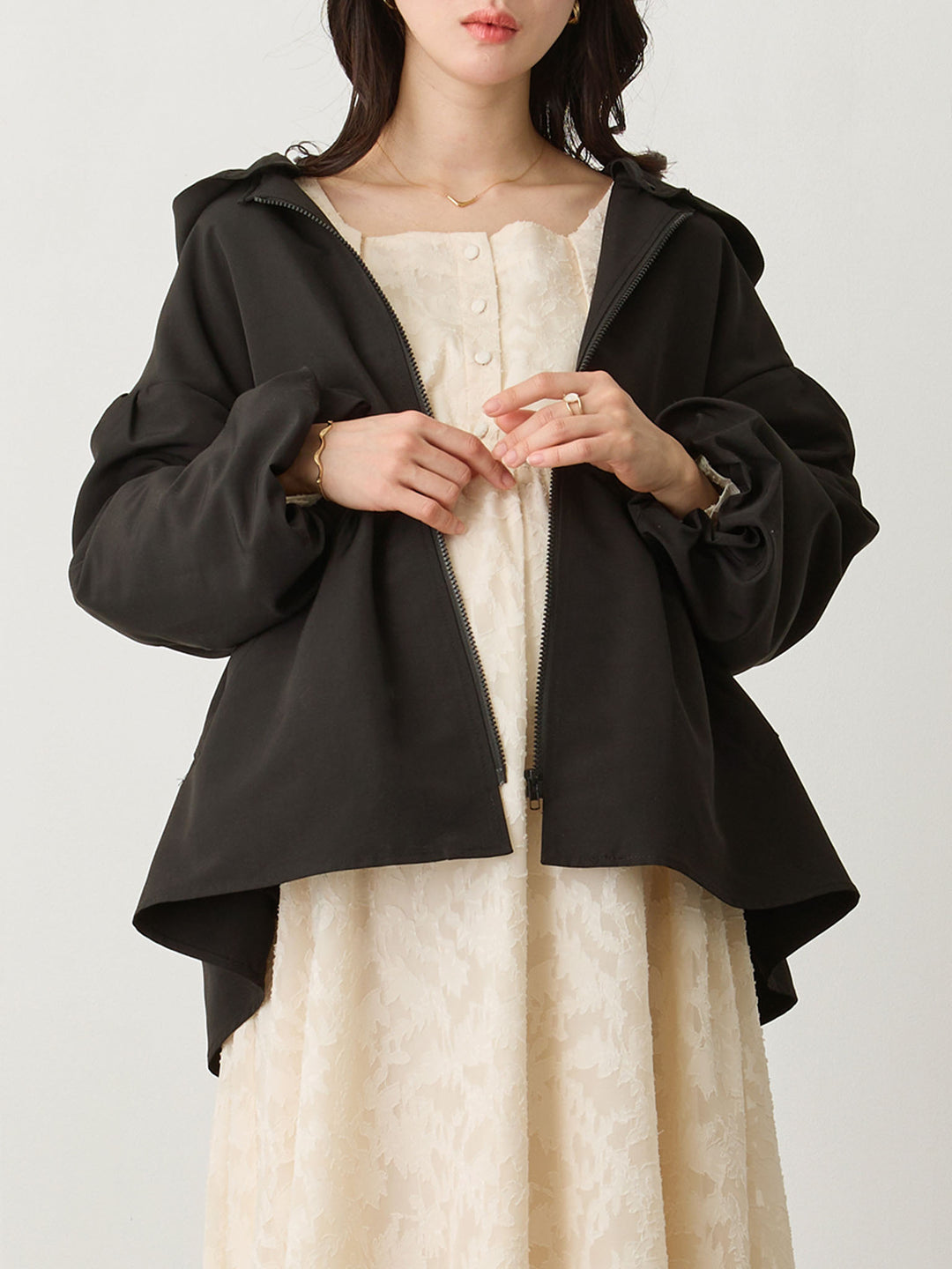 フード付きペプラムライトアウター Black
