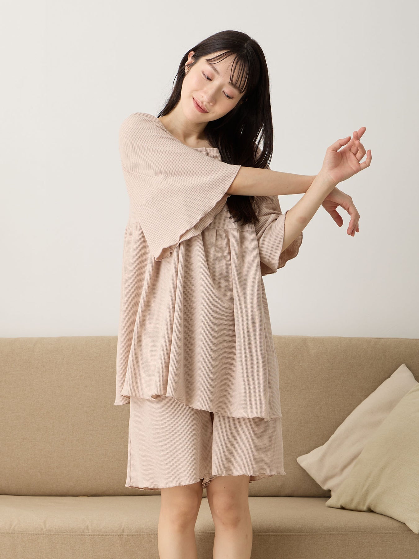 長めのフレアスリーブで二の腕をキレイに見せてくれるシルエット。