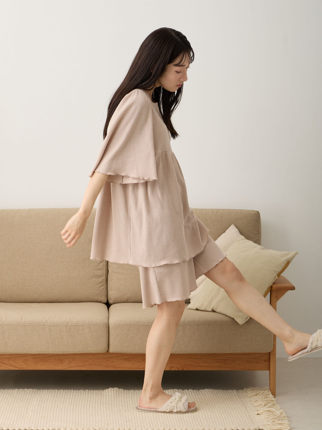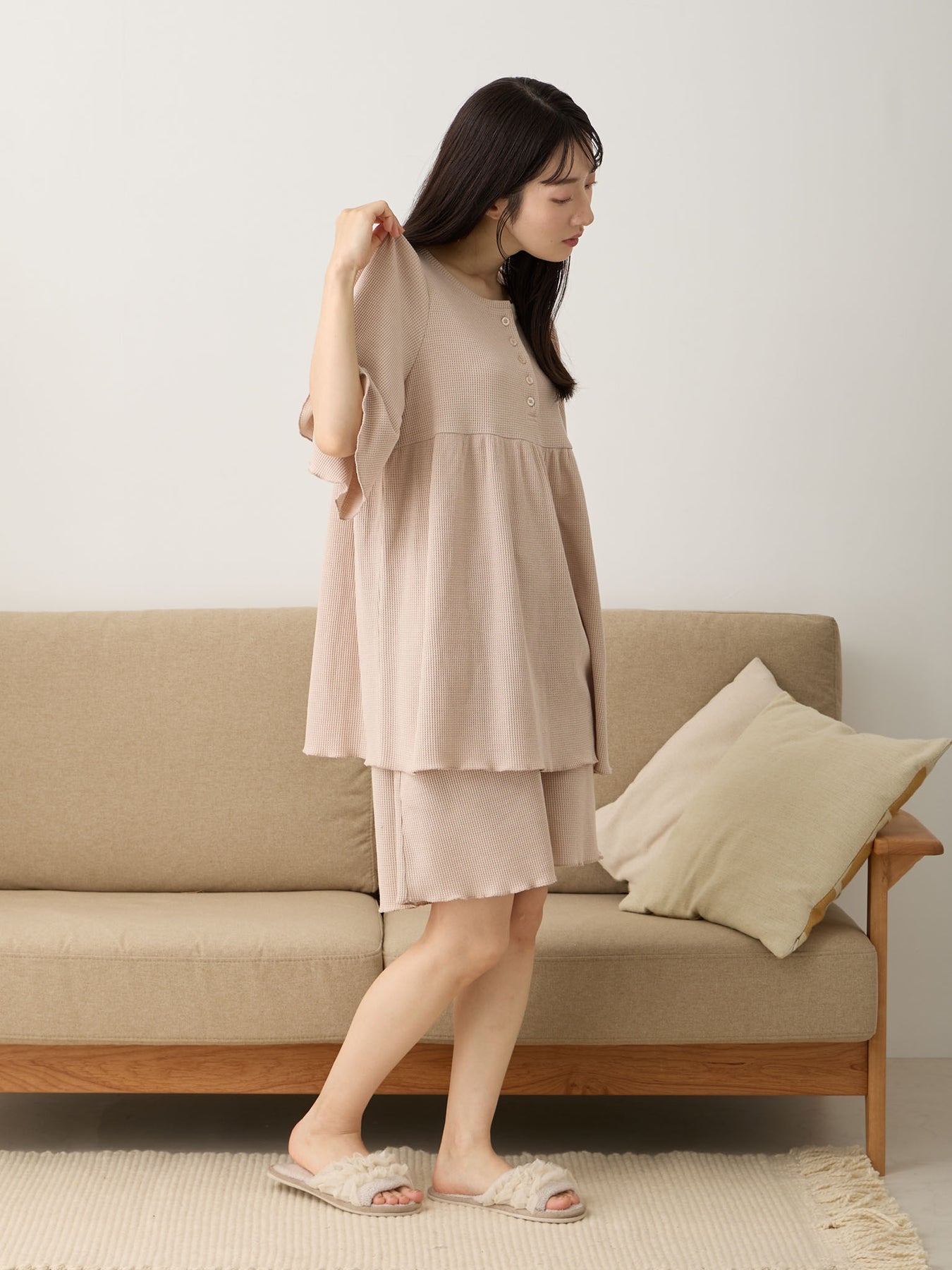 長めのショートパンツなので、脚を冷やしにくく、ワンマイルウェアとしても使いやすい♩