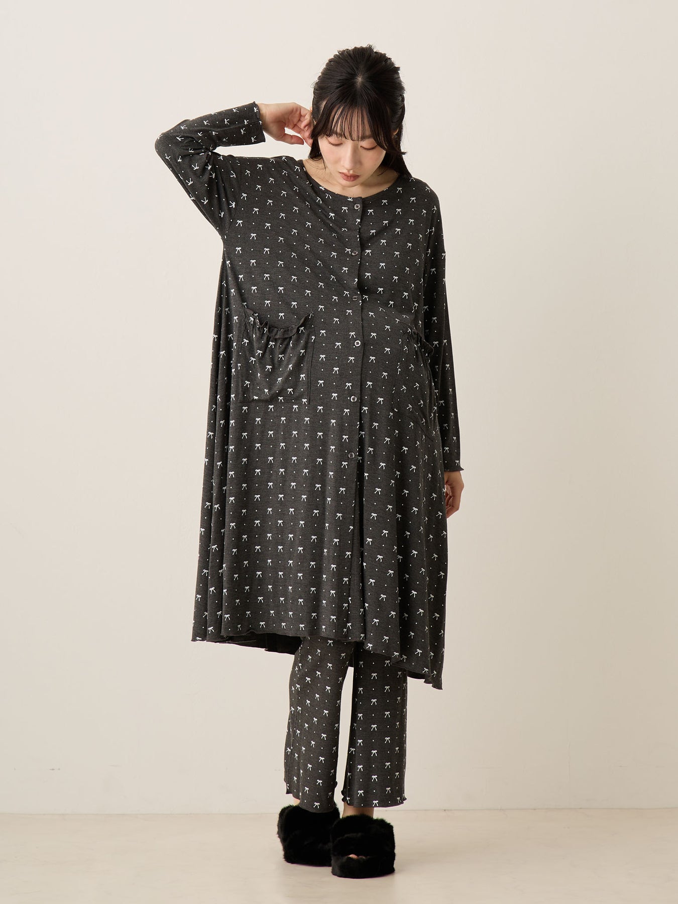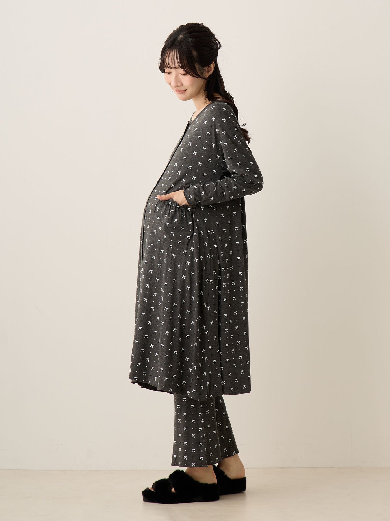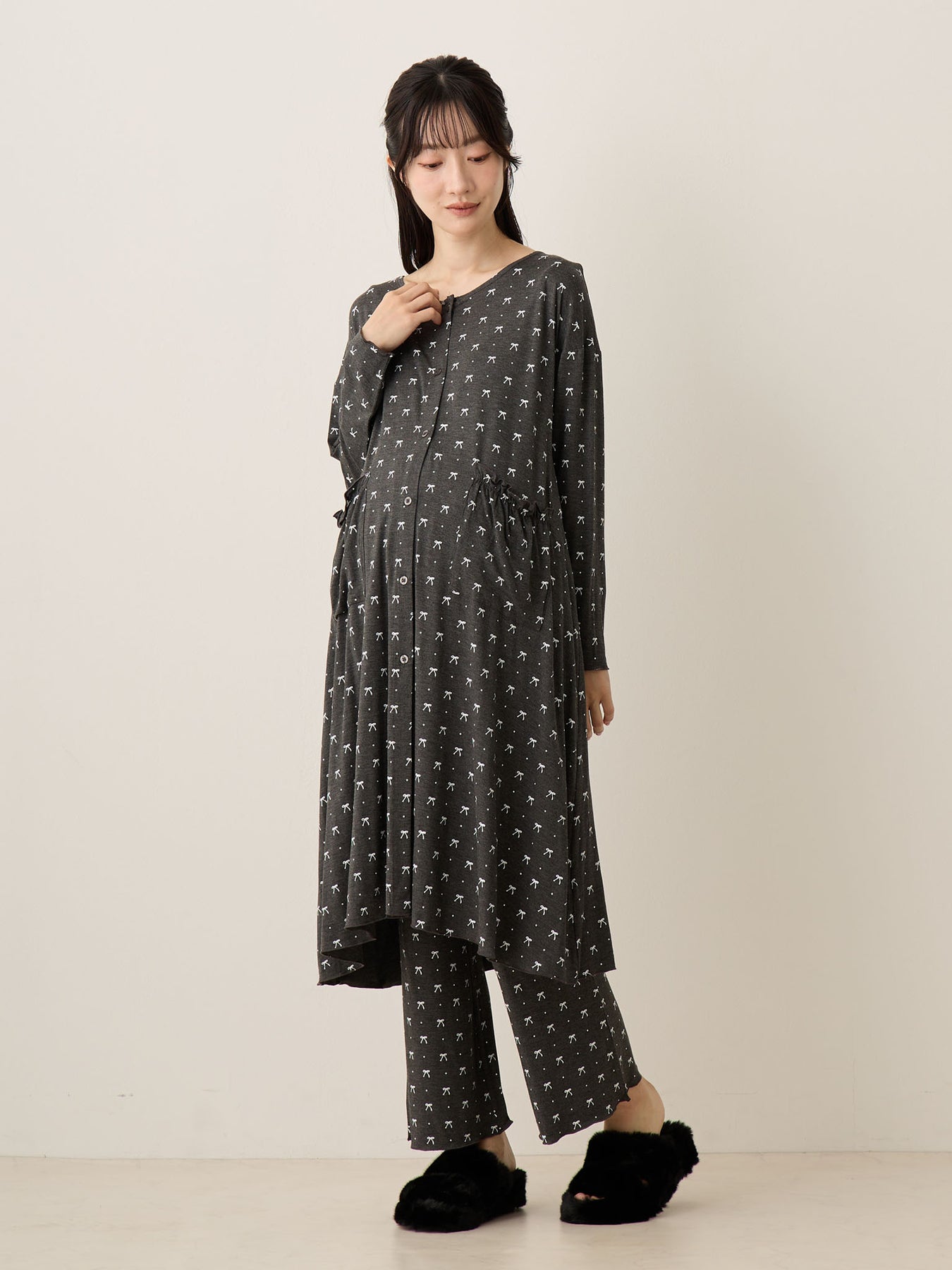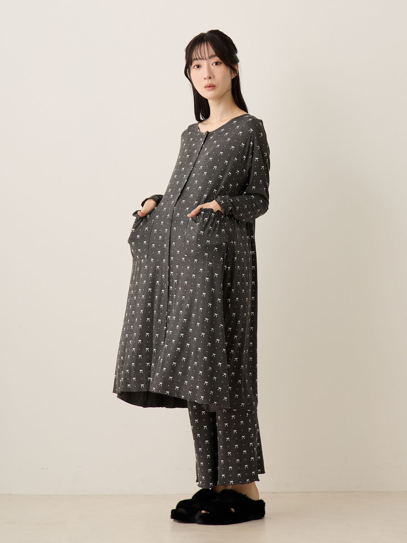 前ボタン全開タイプ・長め着丈で産後の授乳や入院着としても使いやすい。