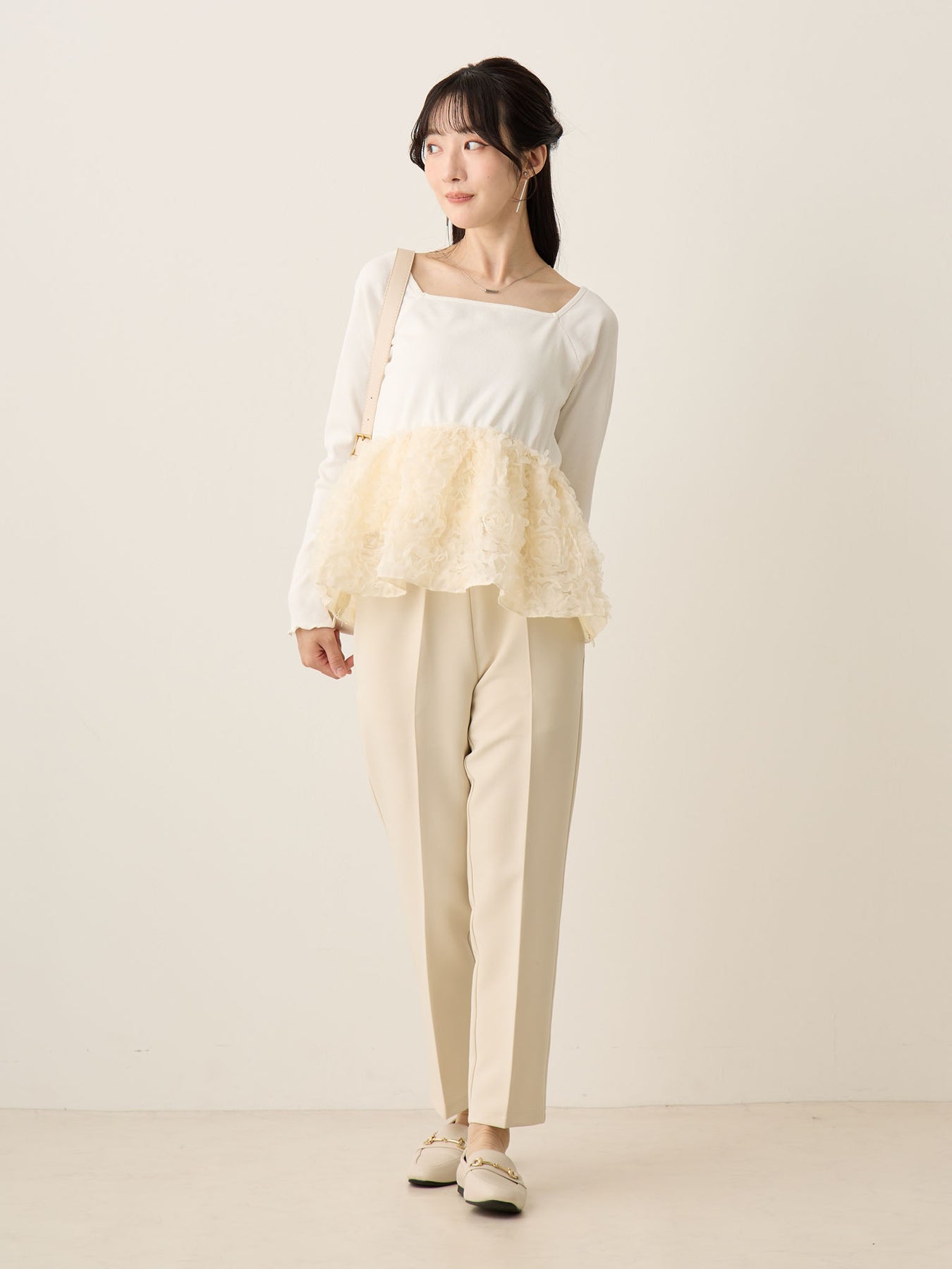 ゆったりとペプラムデザインでお腹周りをカバーしてくれるトップス。
