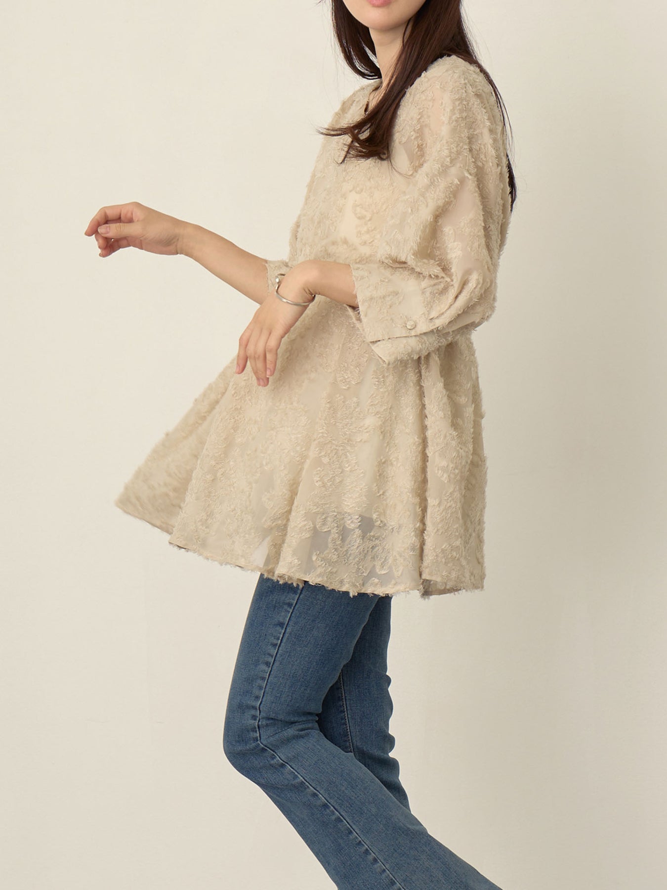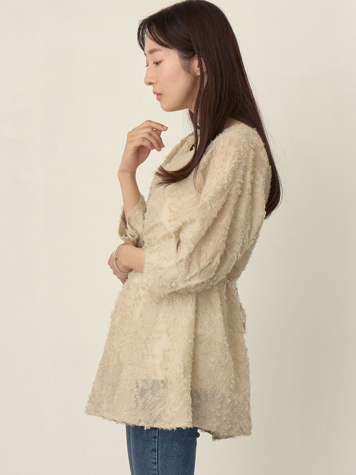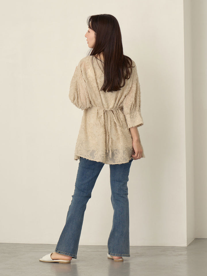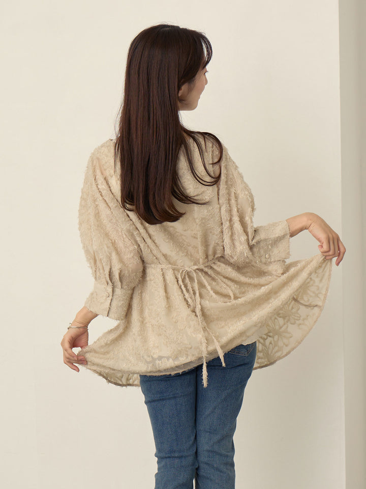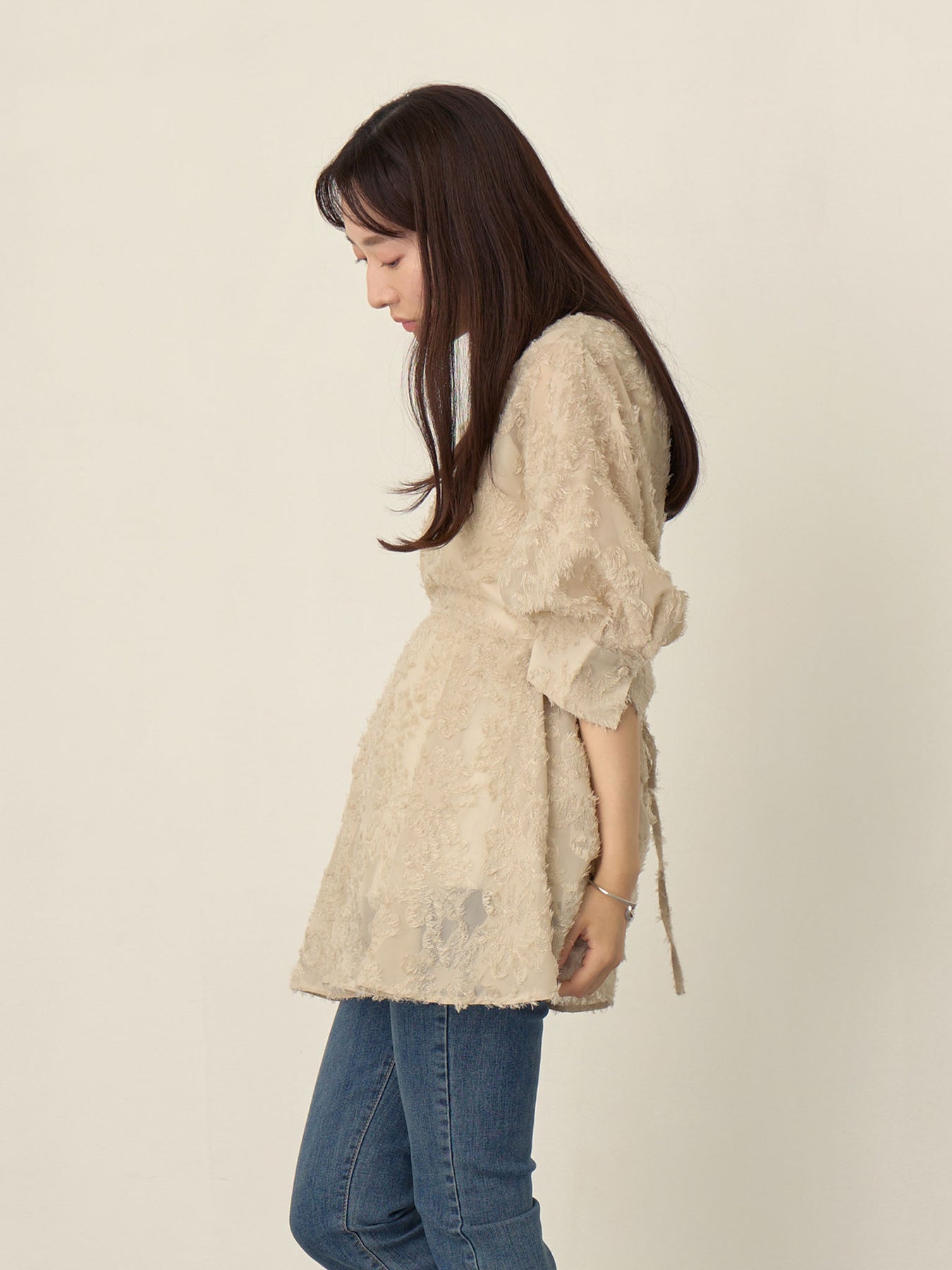 This blouse has a slightly sheer feel and fluffy feathers that will lift your spirits.