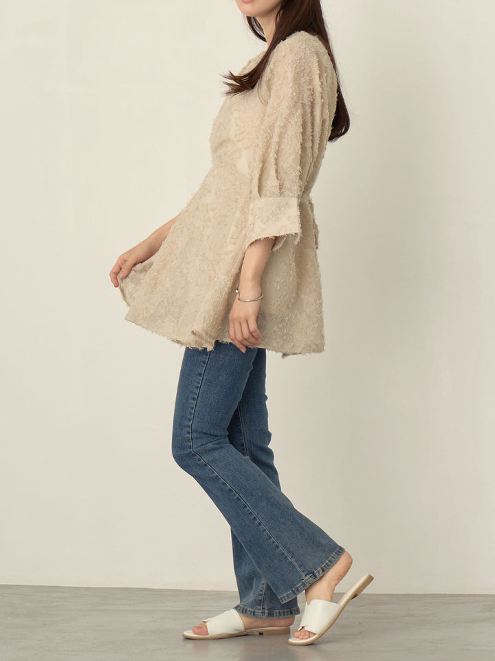 The V-neck makes the neck look beautiful, and the tucked peplum silhouette makes it a well-balanced design that will look great even if your belly grows.