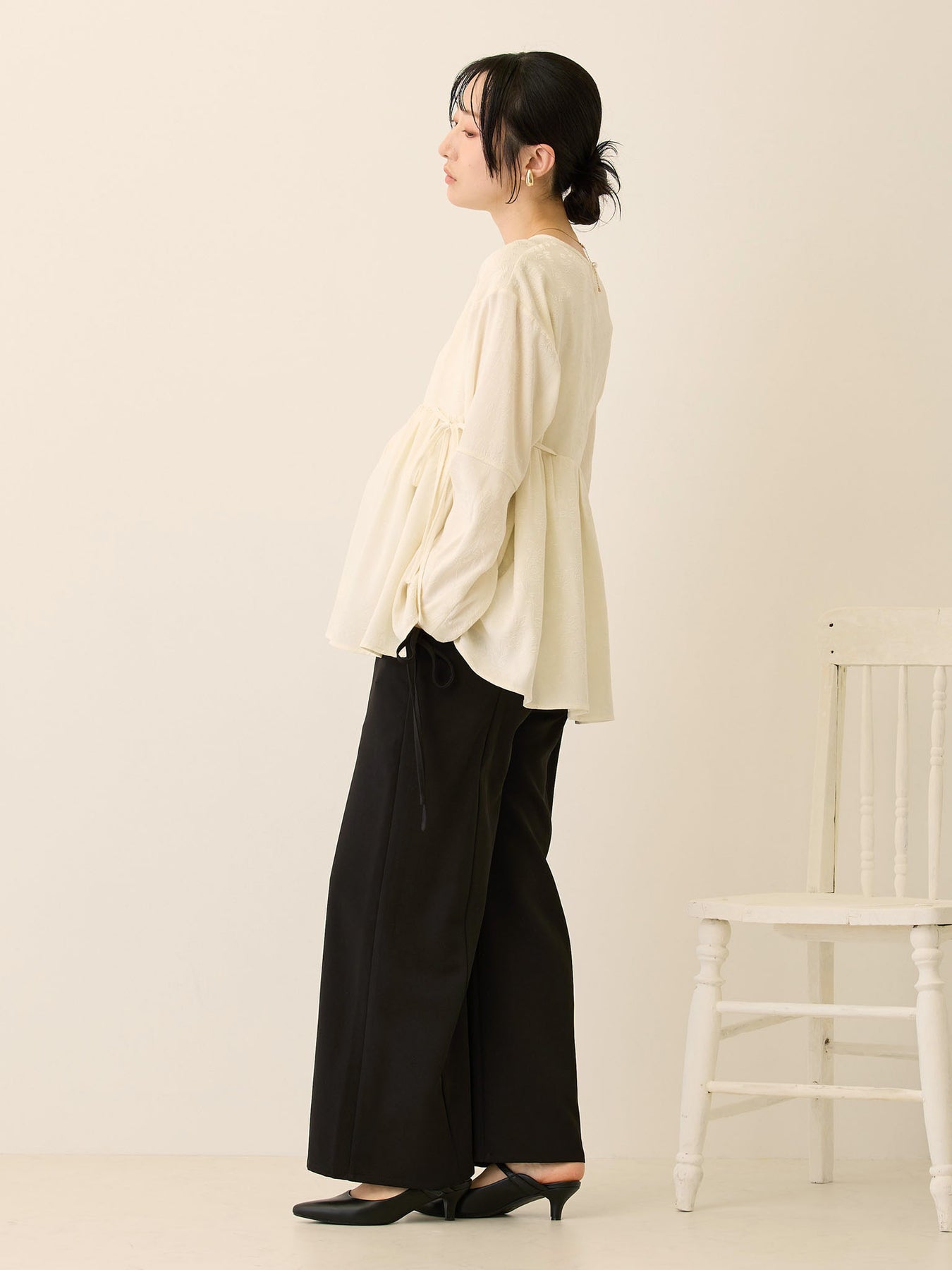 シンプルにマタニティデニムやテーパードパンツで合わせるだけで、大人可愛いコーデに。