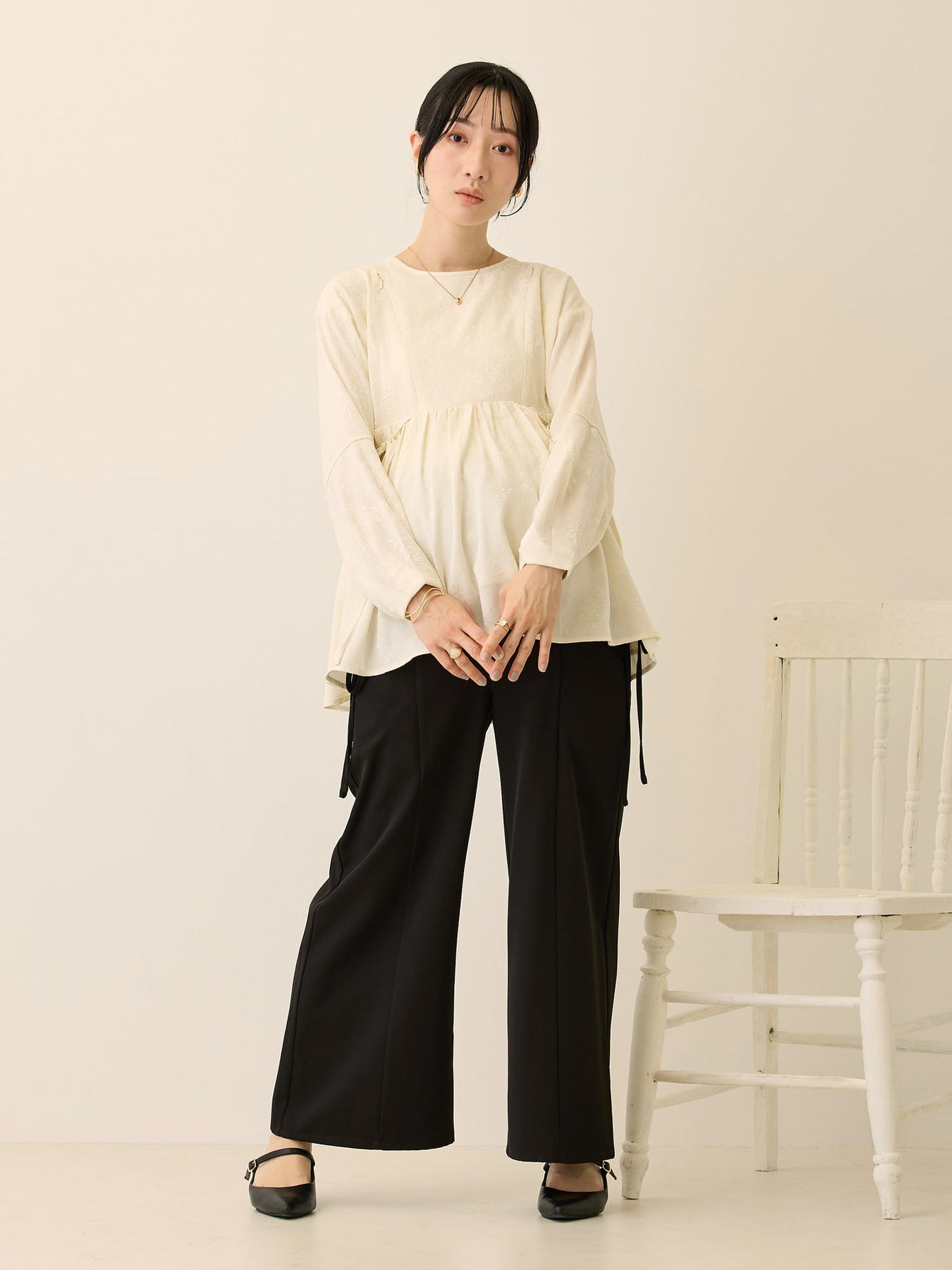 ふんわりとしたお袖と華やかなジャガード柄がポイントのトップス。