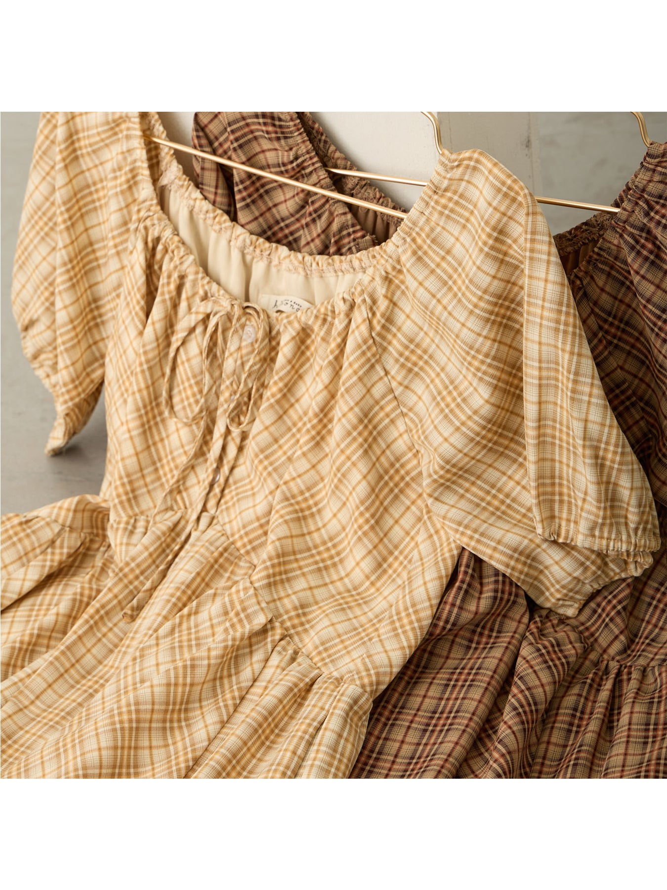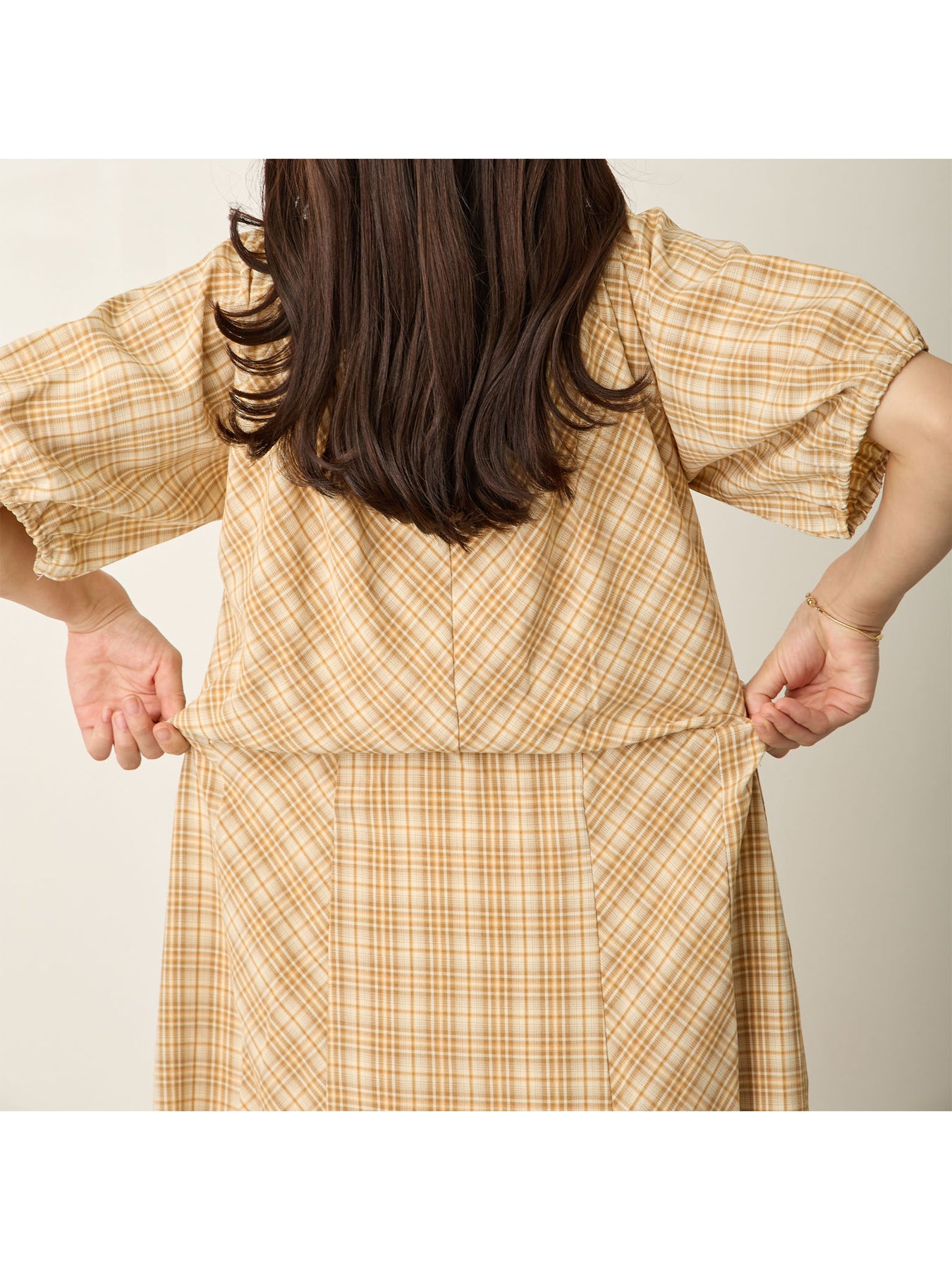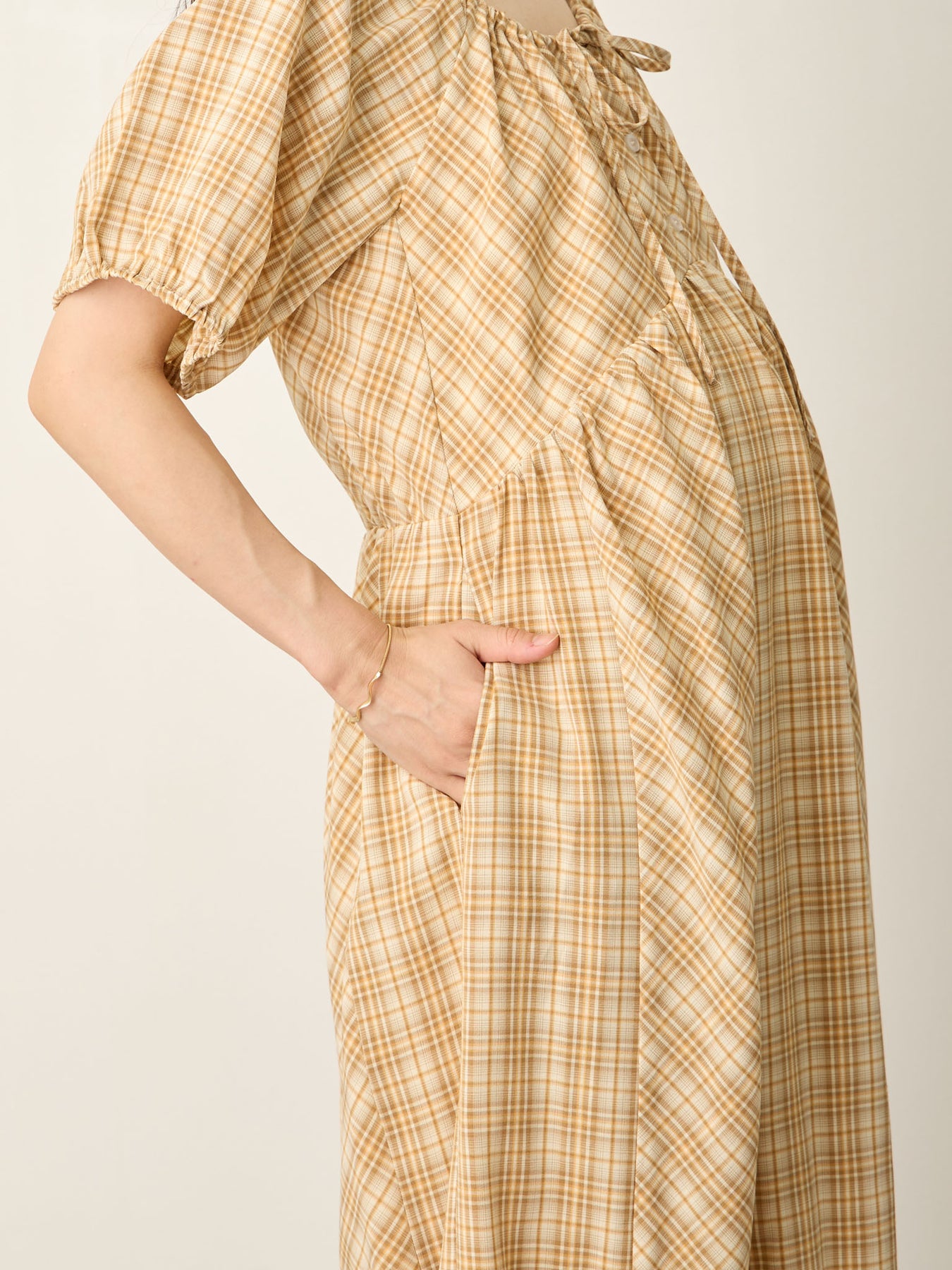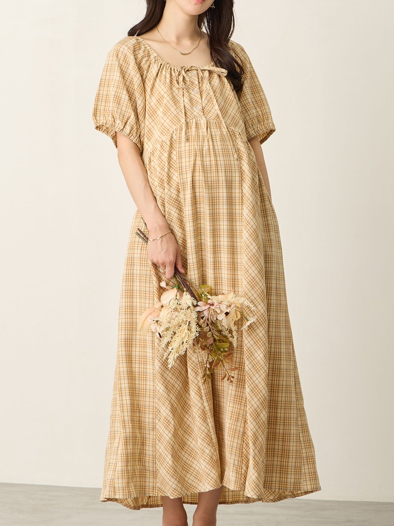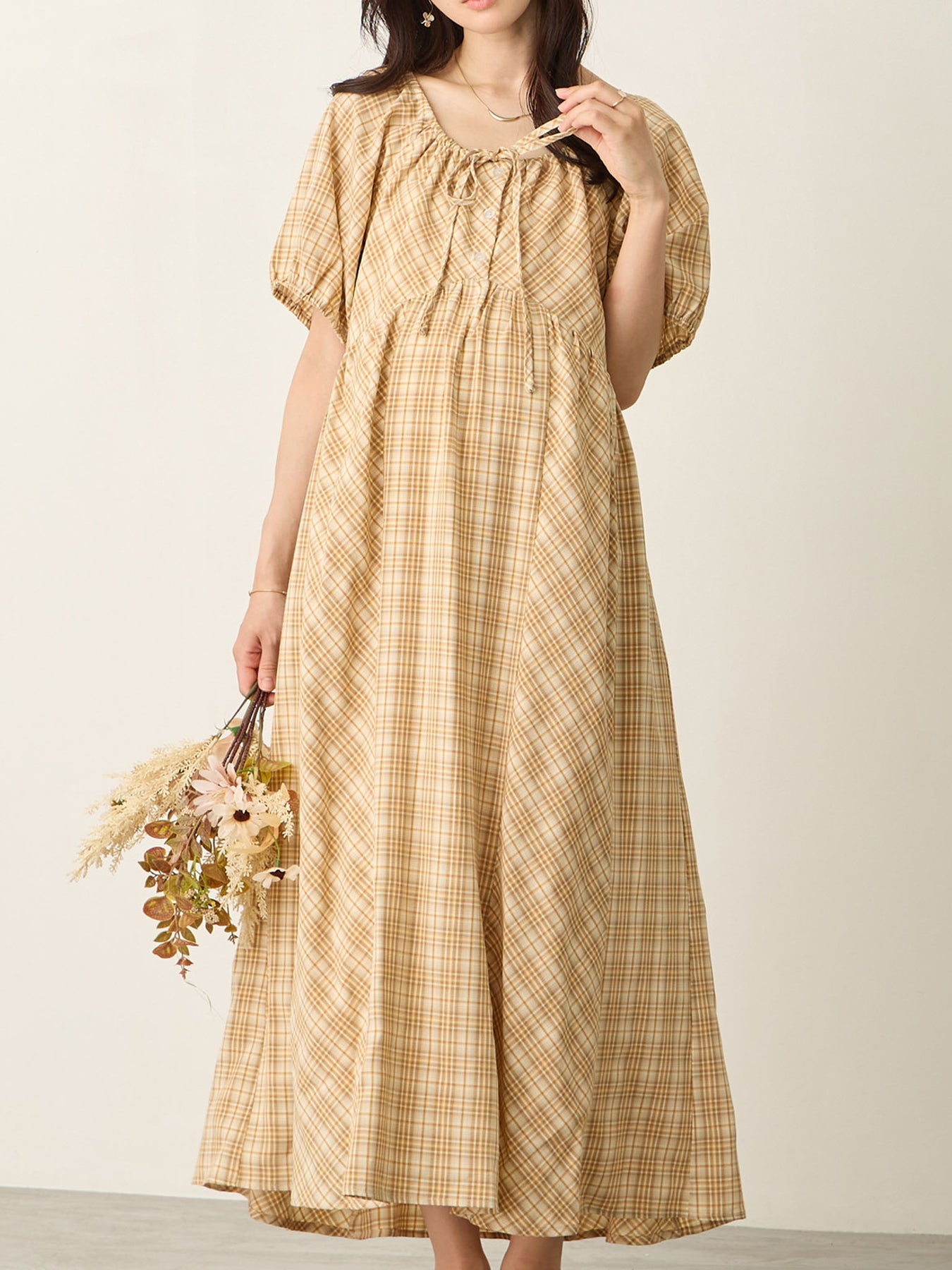 米色泡泡袖格纹连衣裙