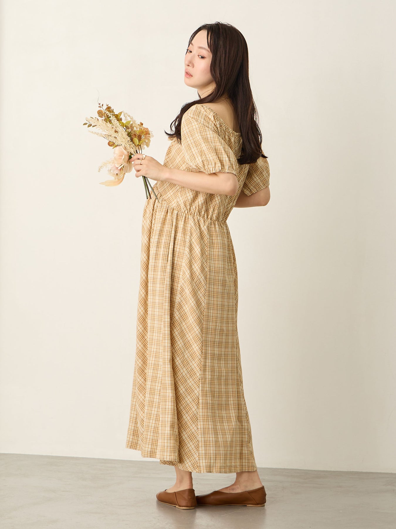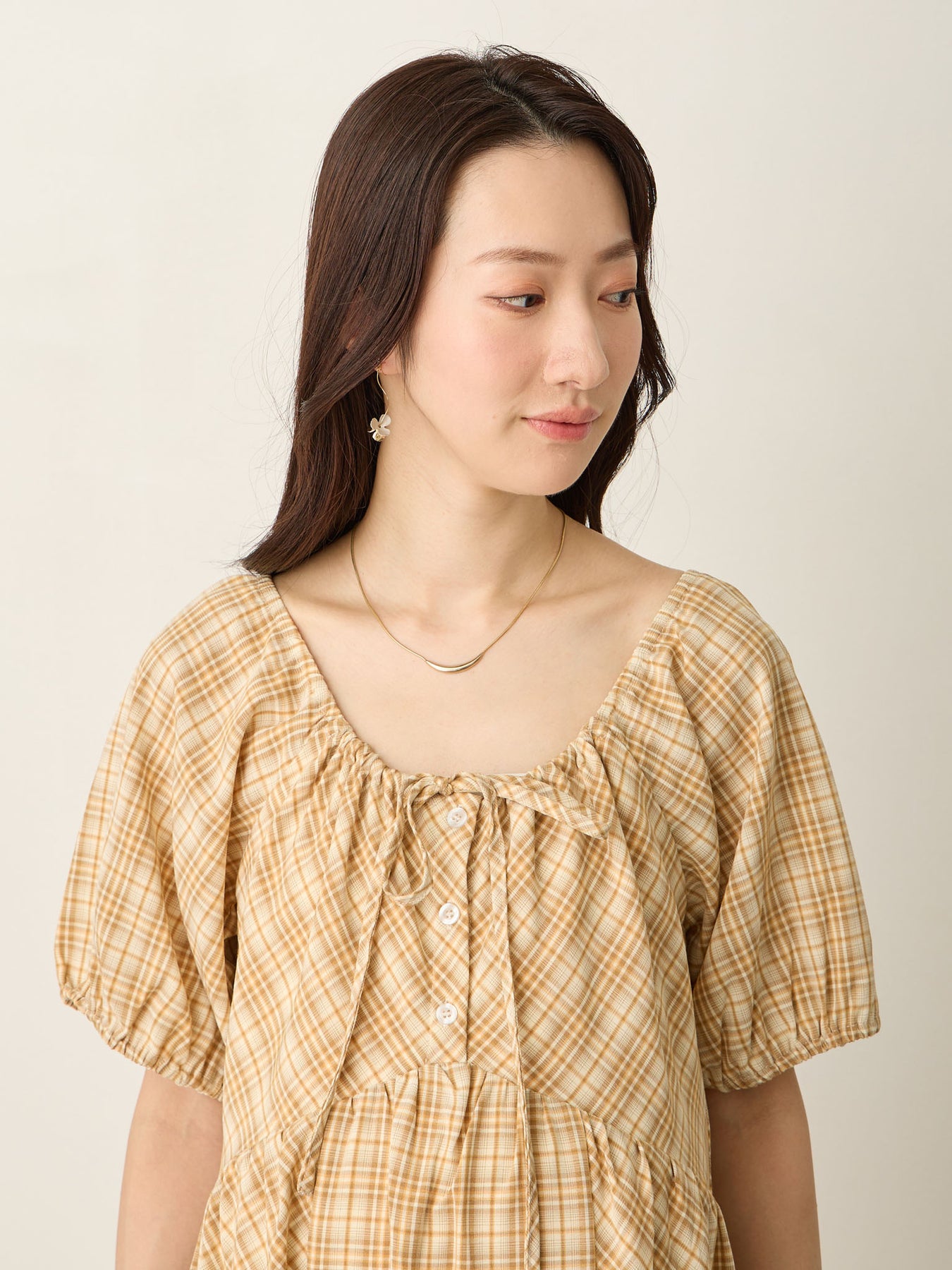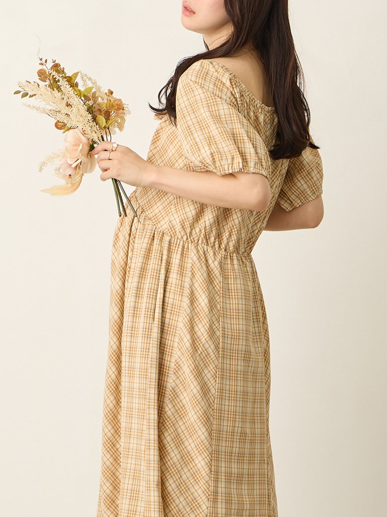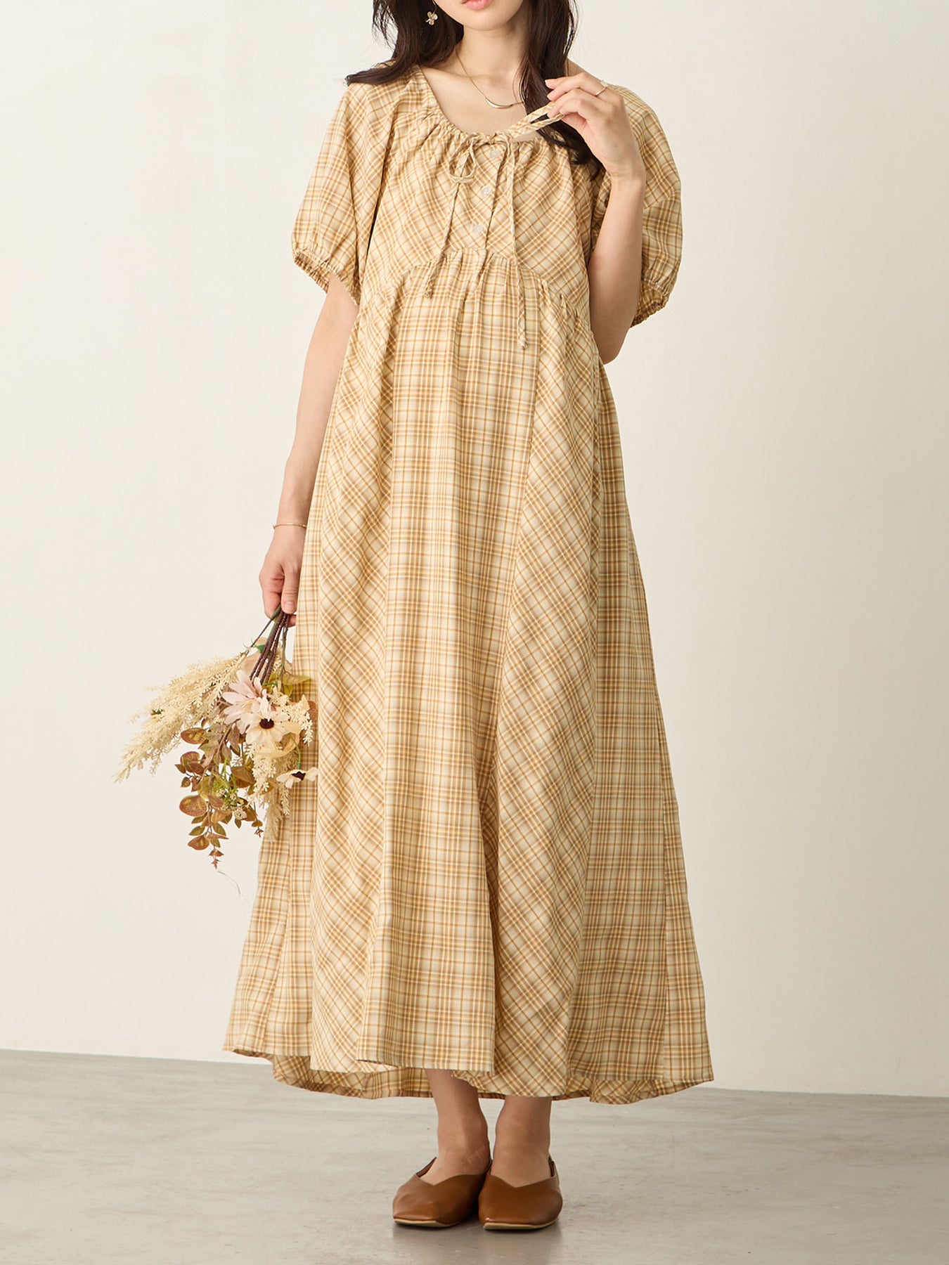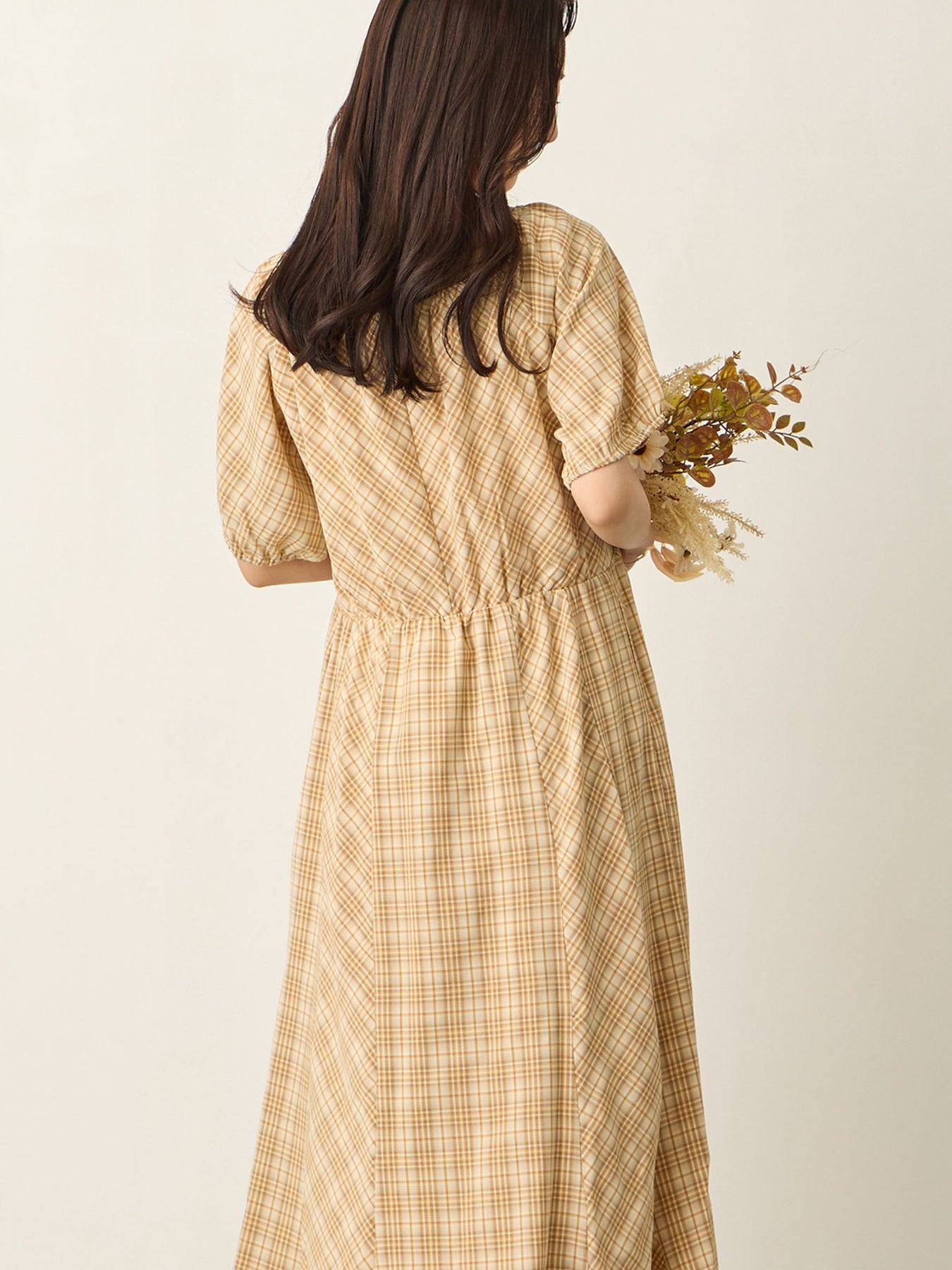 米色泡泡袖格纹连衣裙