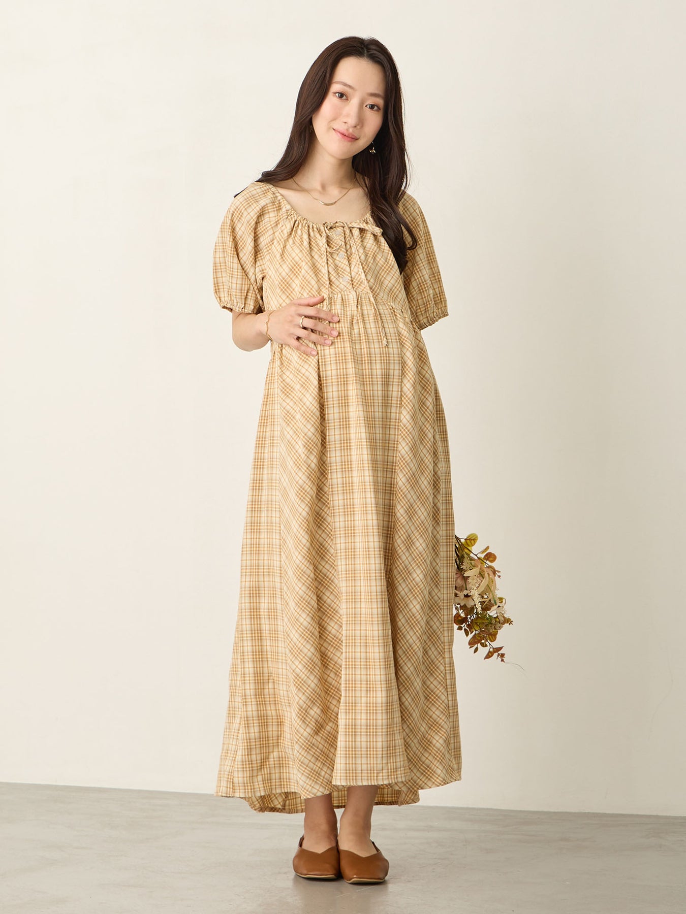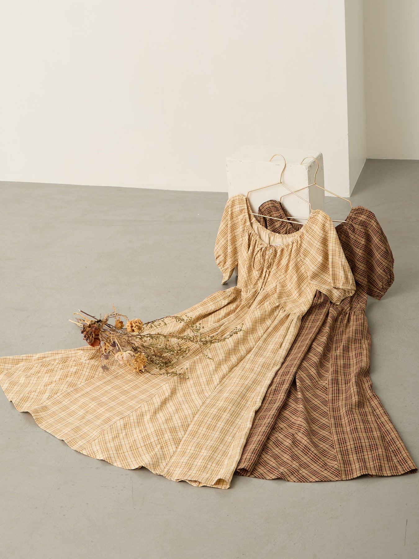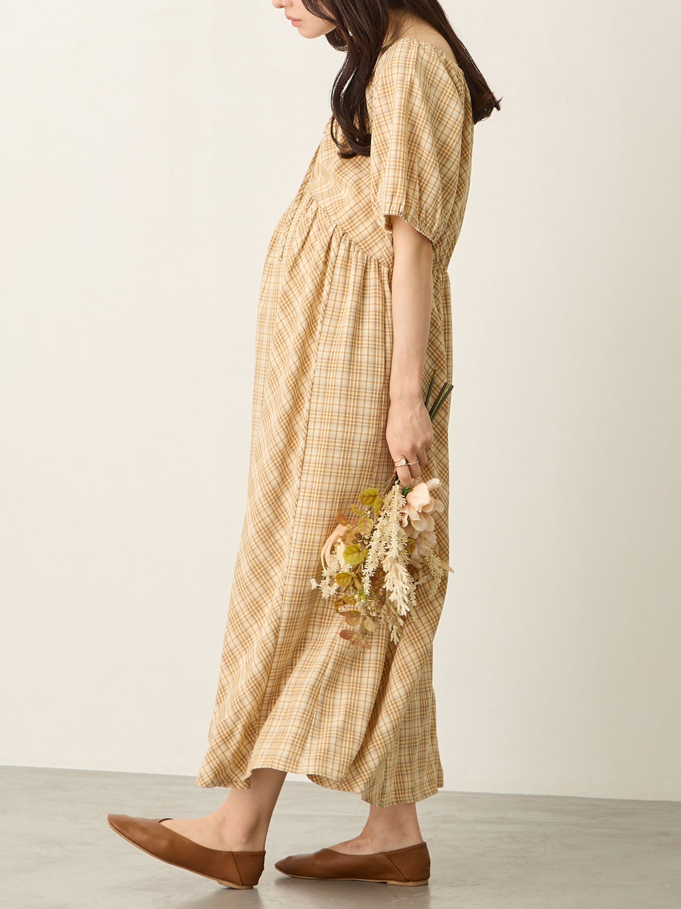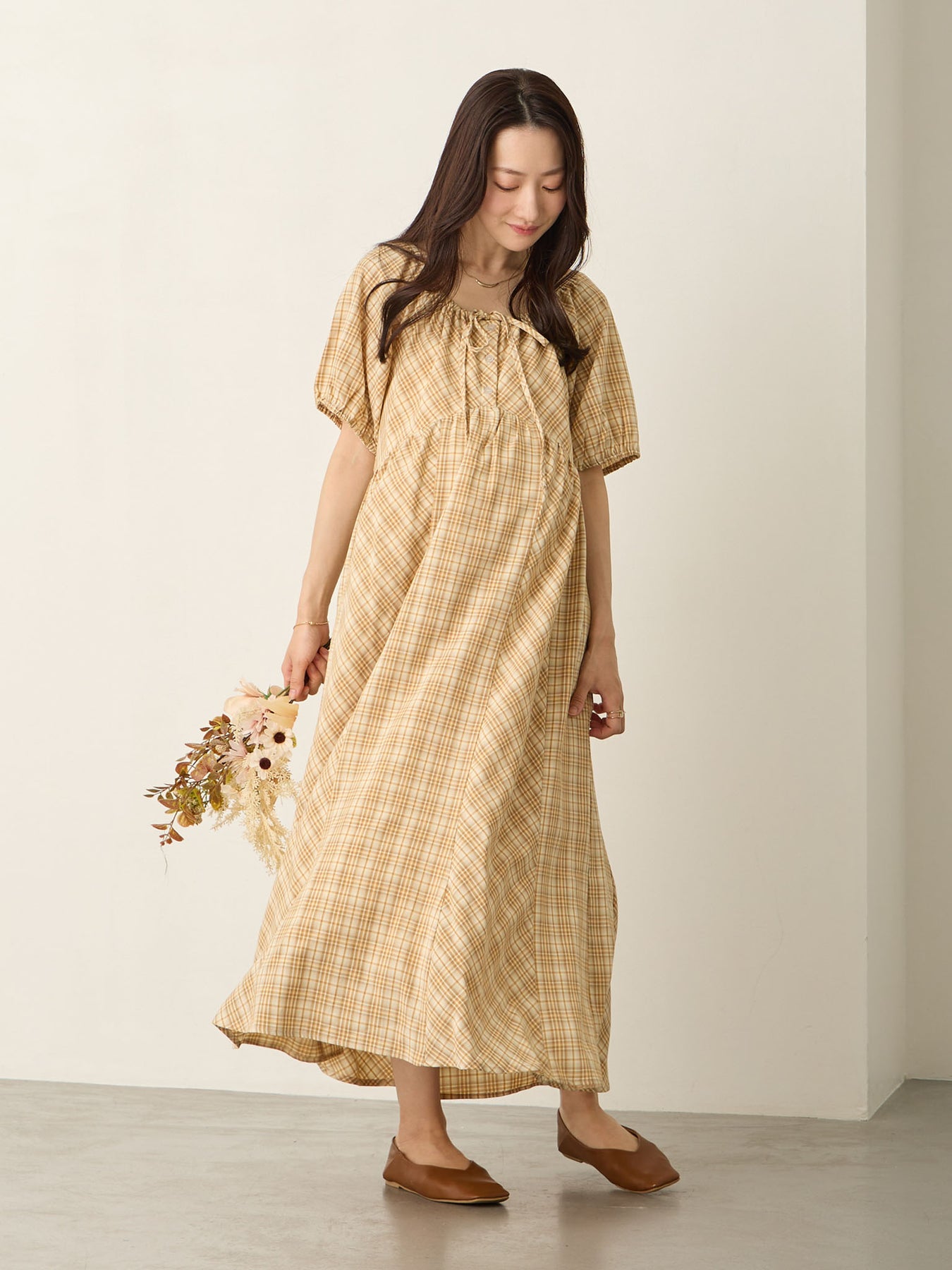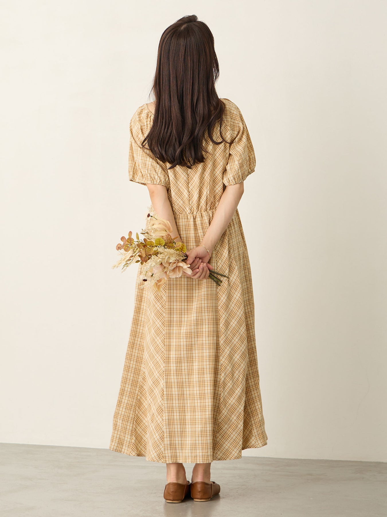 米色泡泡袖格纹连衣裙