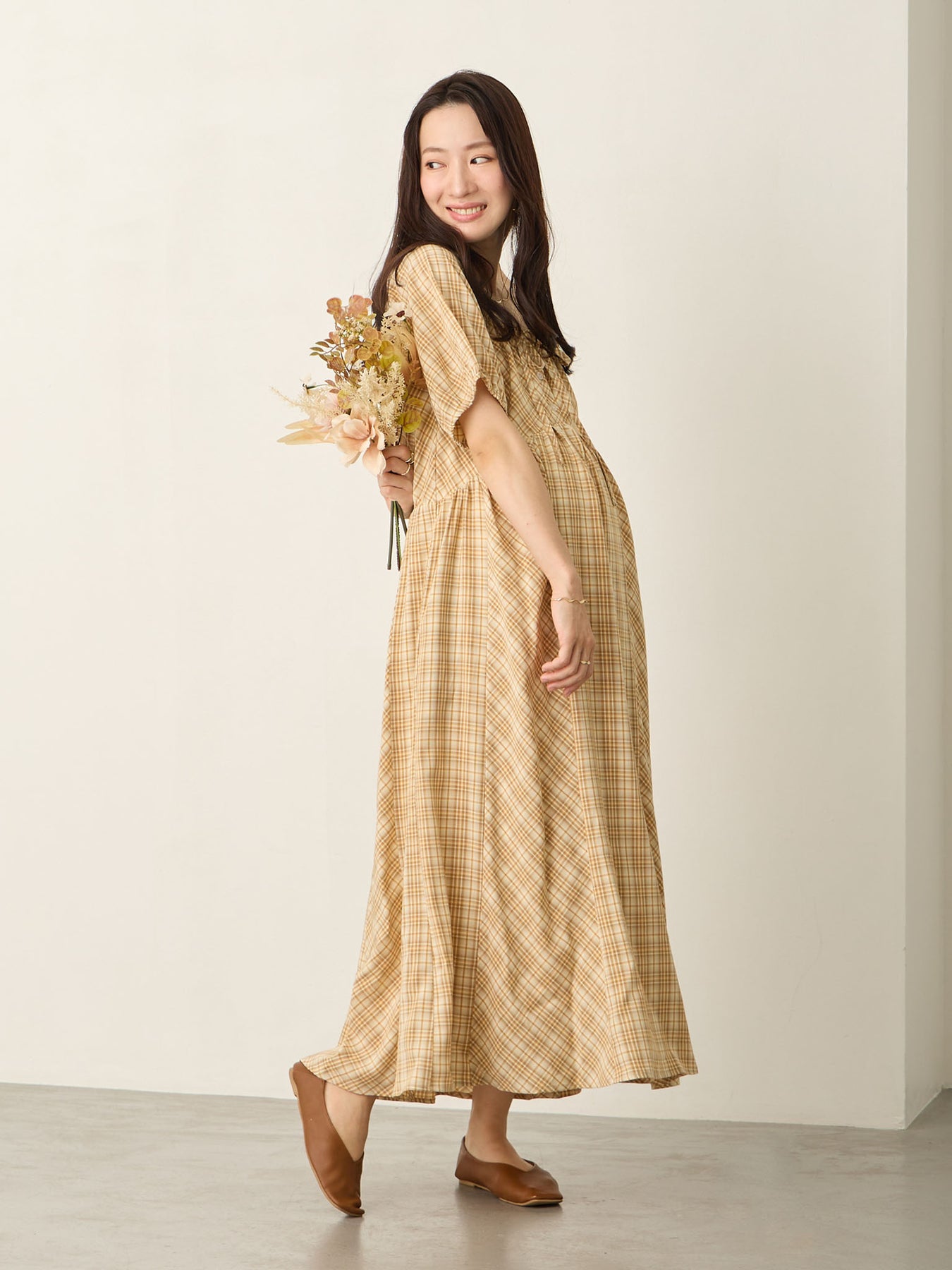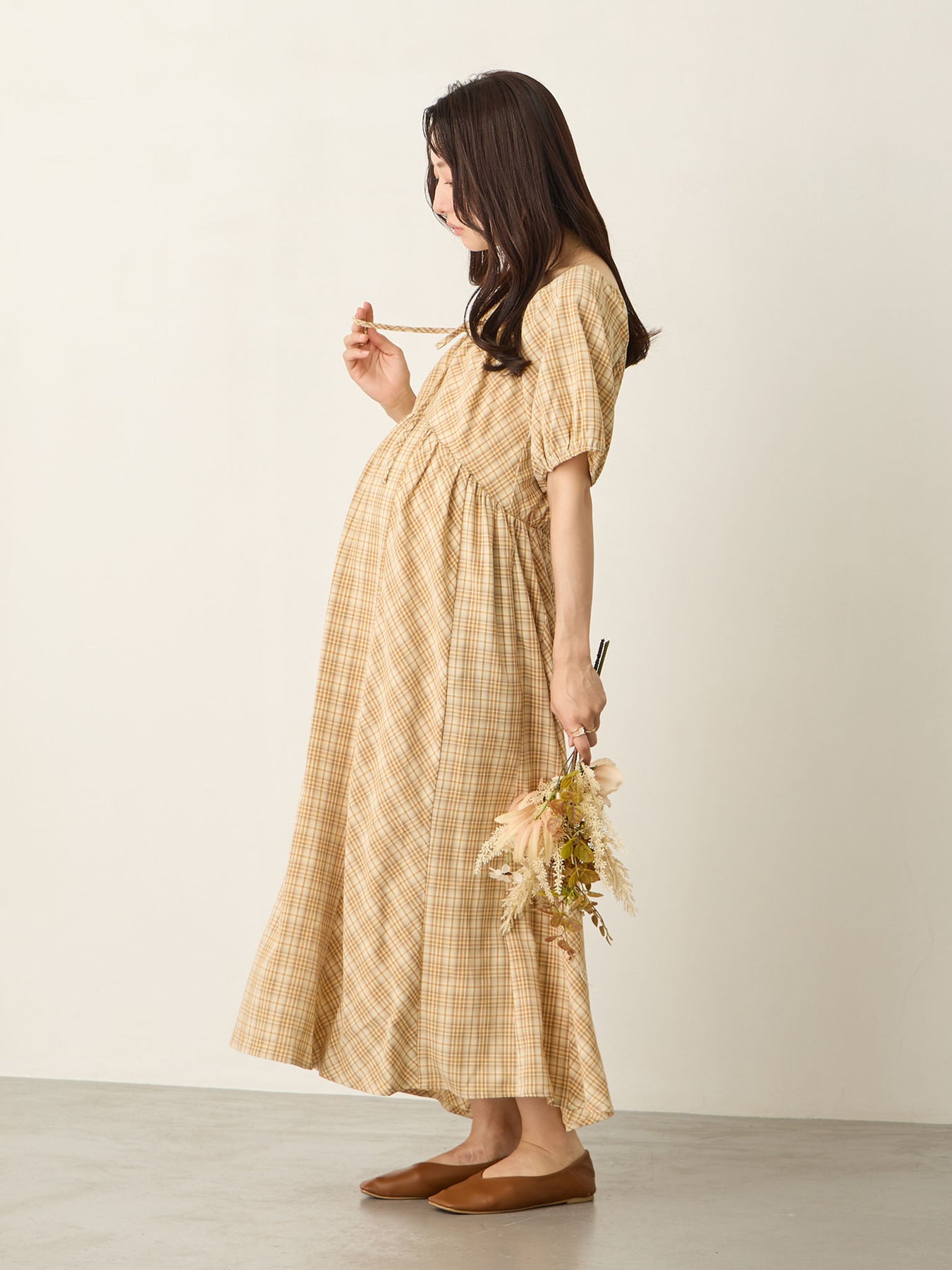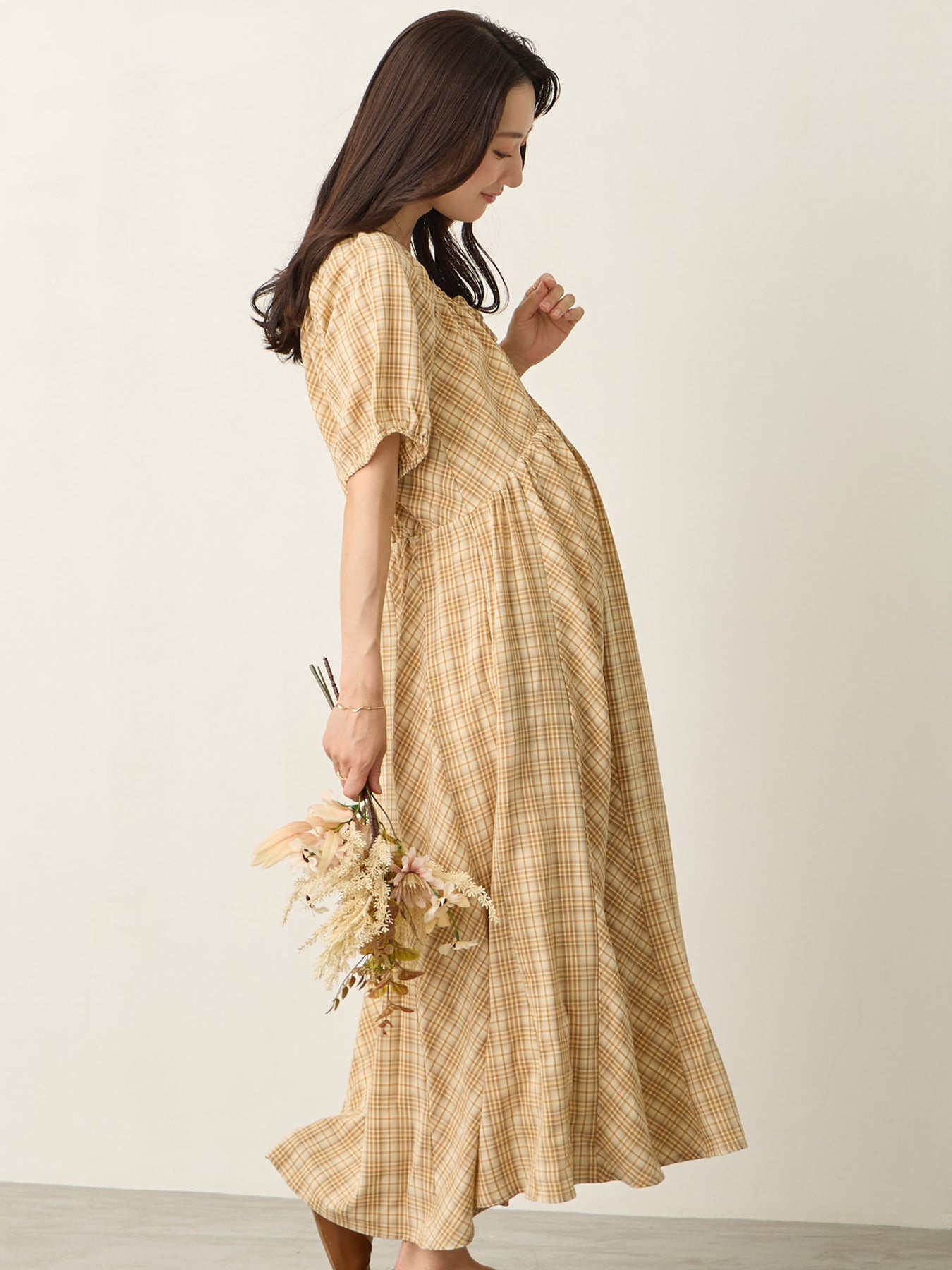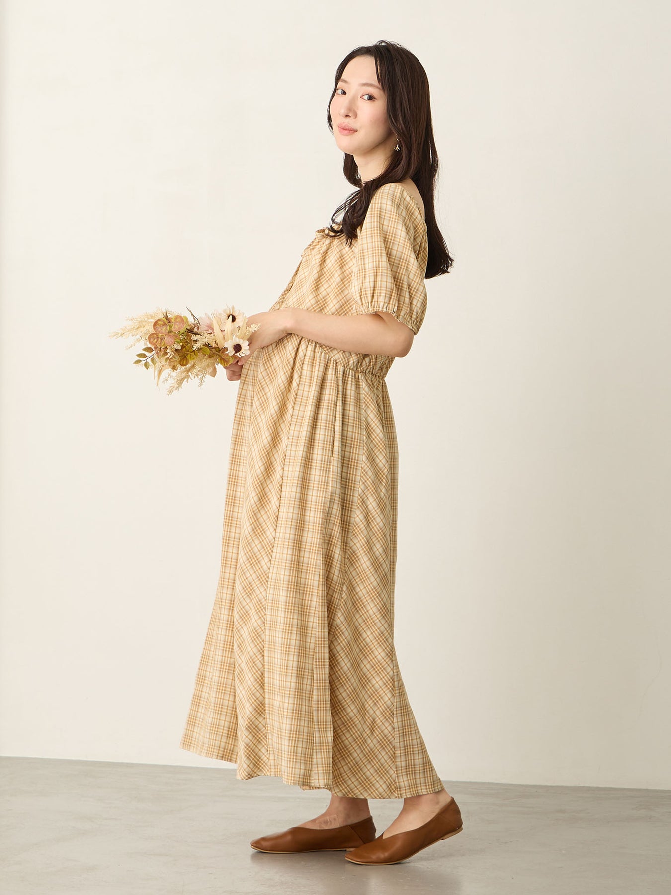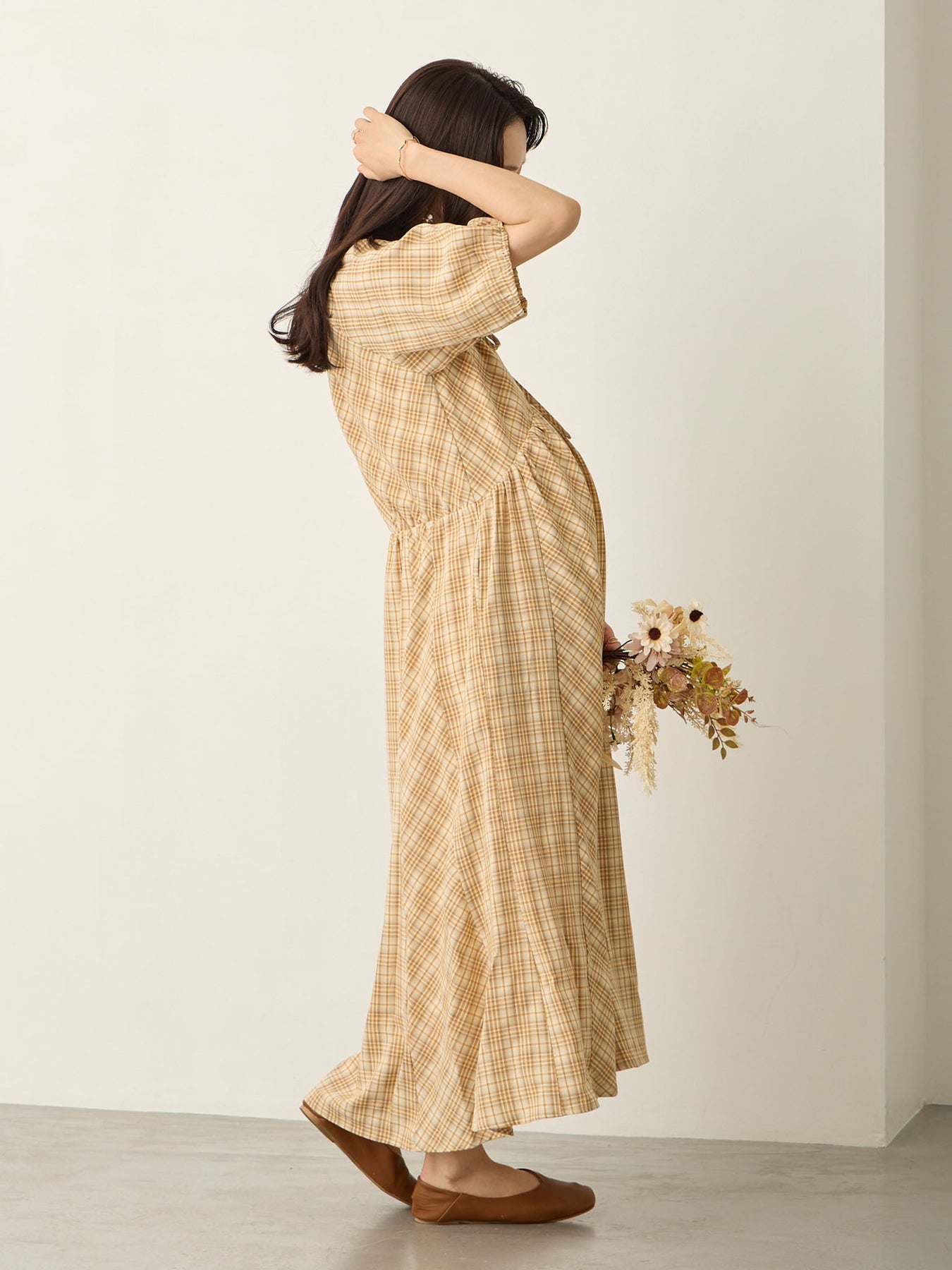 米色泡泡袖格纹连衣裙